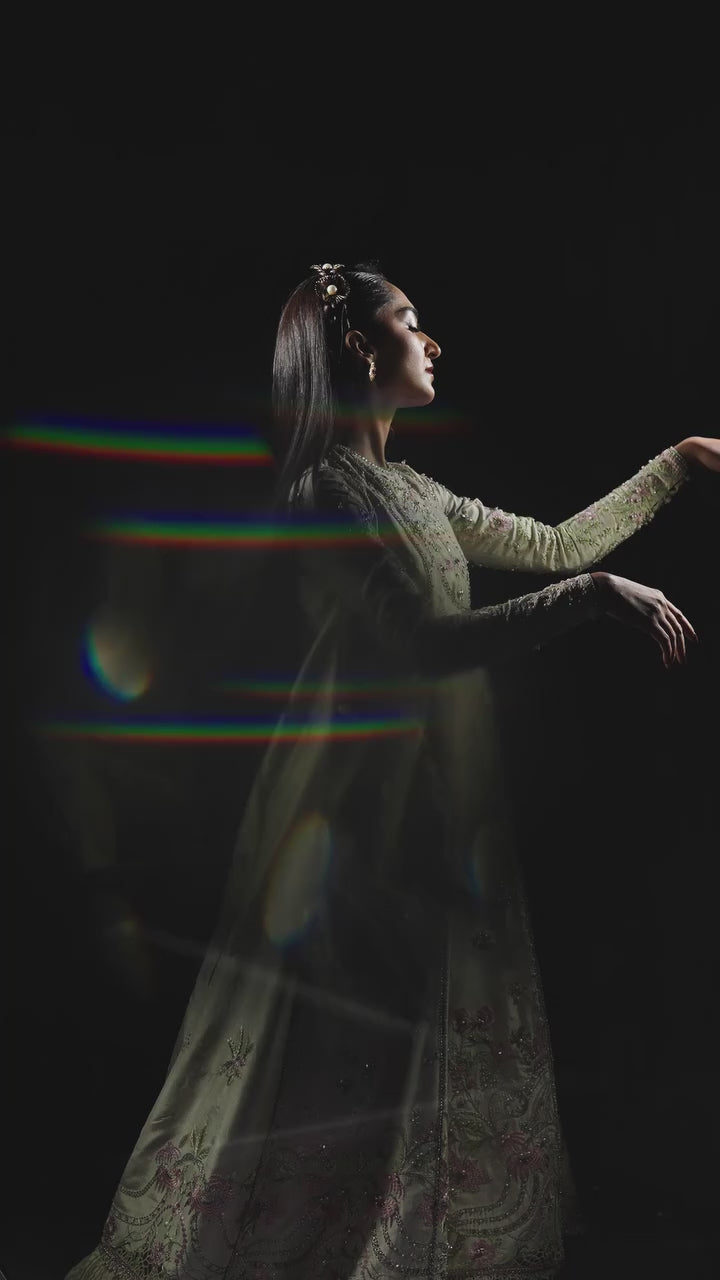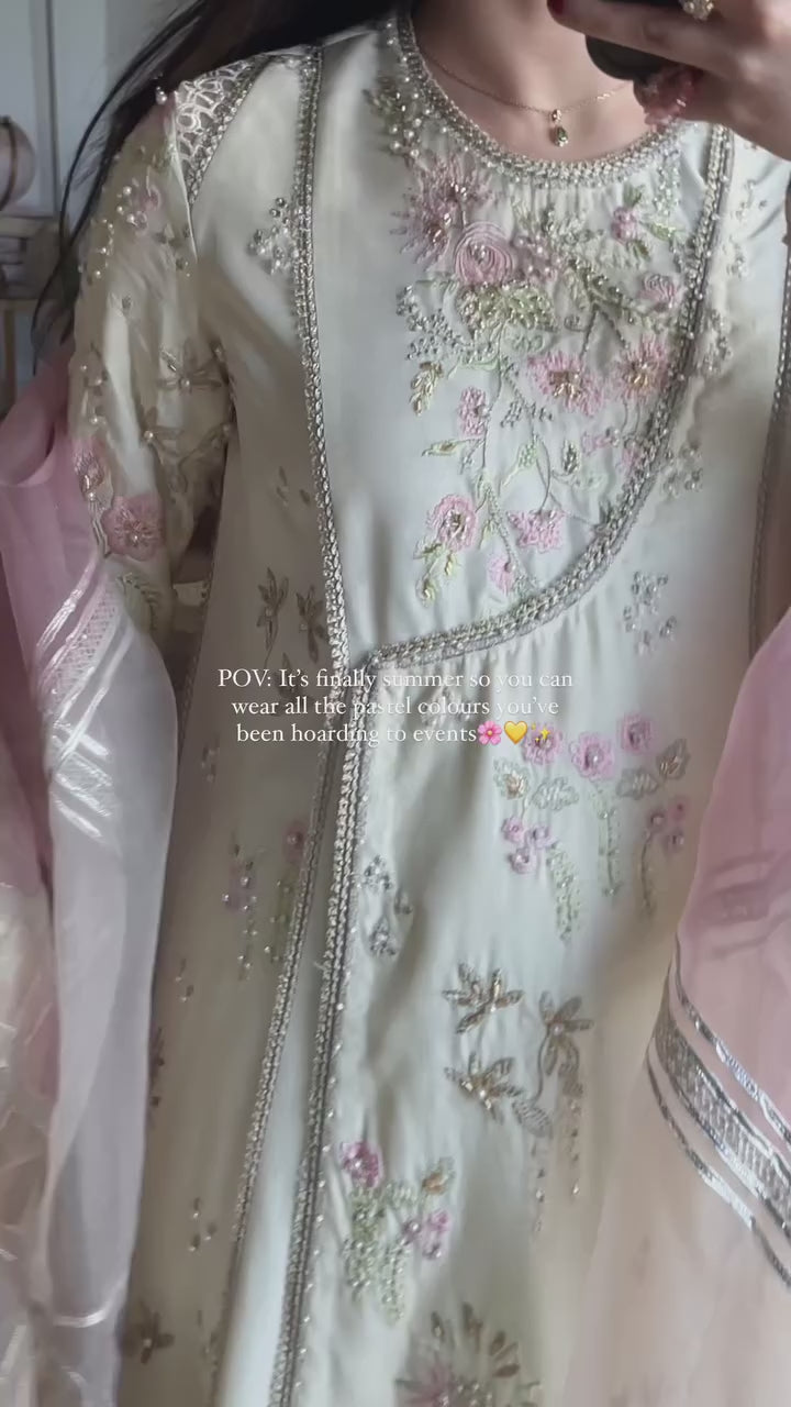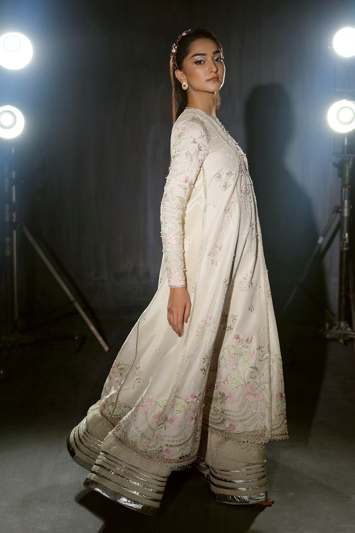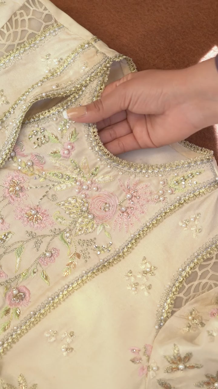 Heer is a stunning embodiment of grace and luxury. Crafted from the finest silk, the dress features intricate Tilla and Thread floral embroidery, shimmering sequins, and refined Cut Dana embellishments. Lustrous pearls and Batki Ana add texture and sophistication. Paired with a silk shirt, crush lehnga, and an organza dupatta, Heer exudes timeless beauty and impeccable craftsmanship, perfect for those who appreciate elegance and fine detailing.