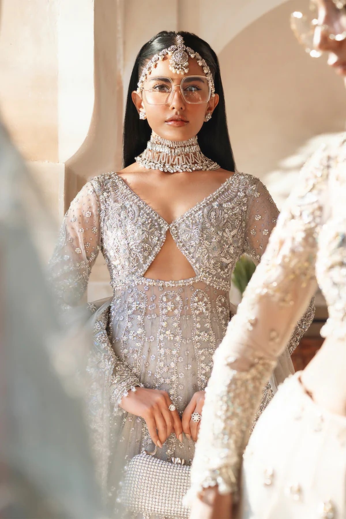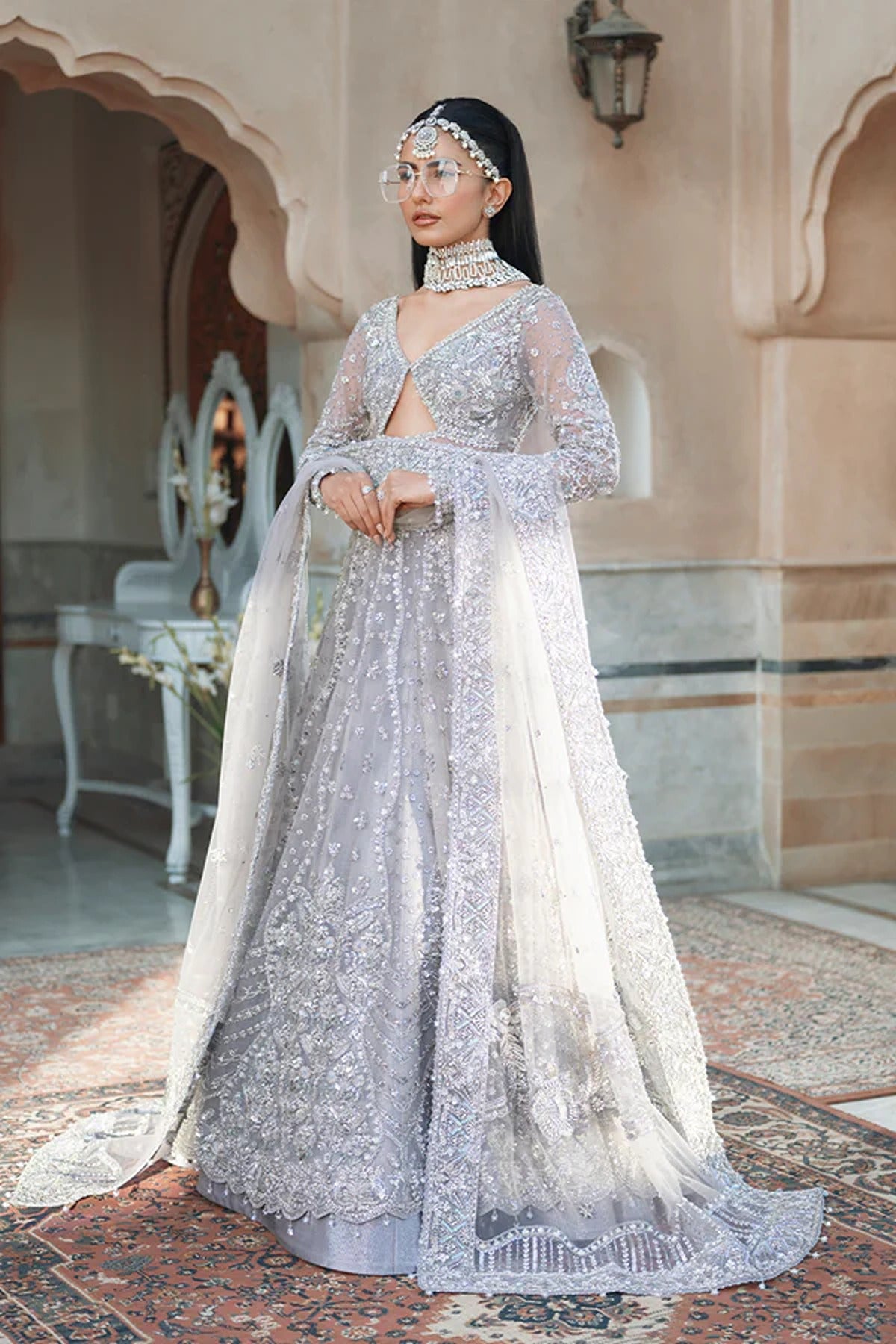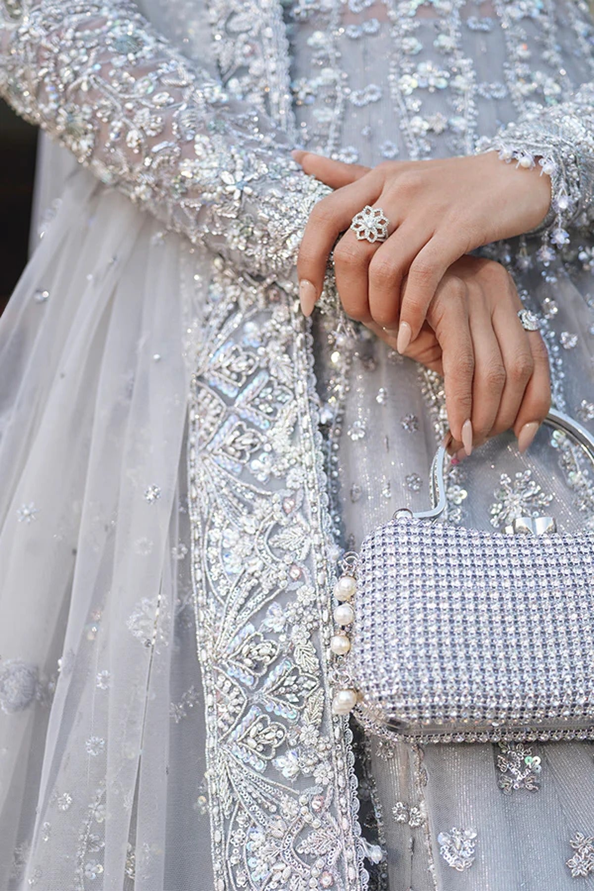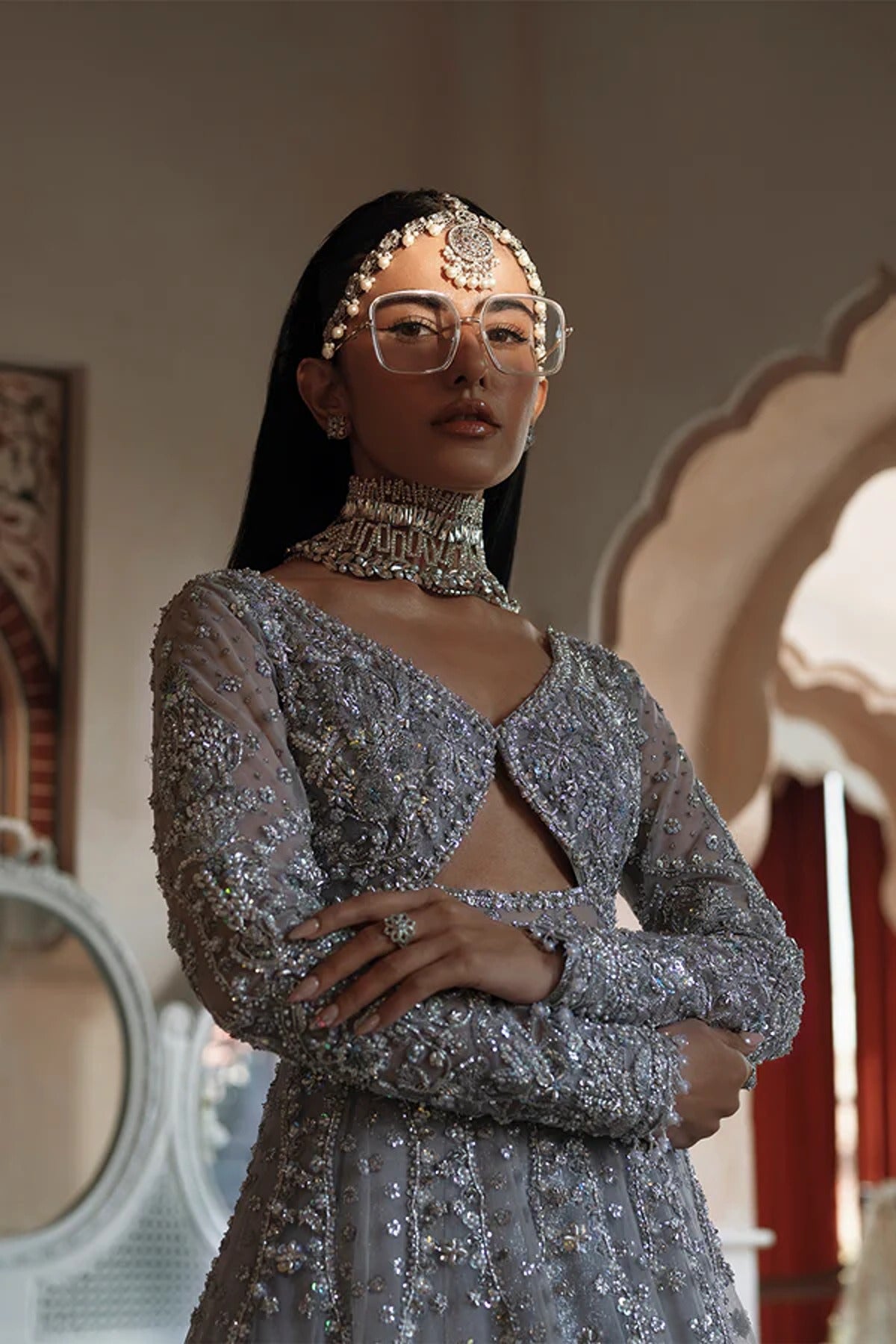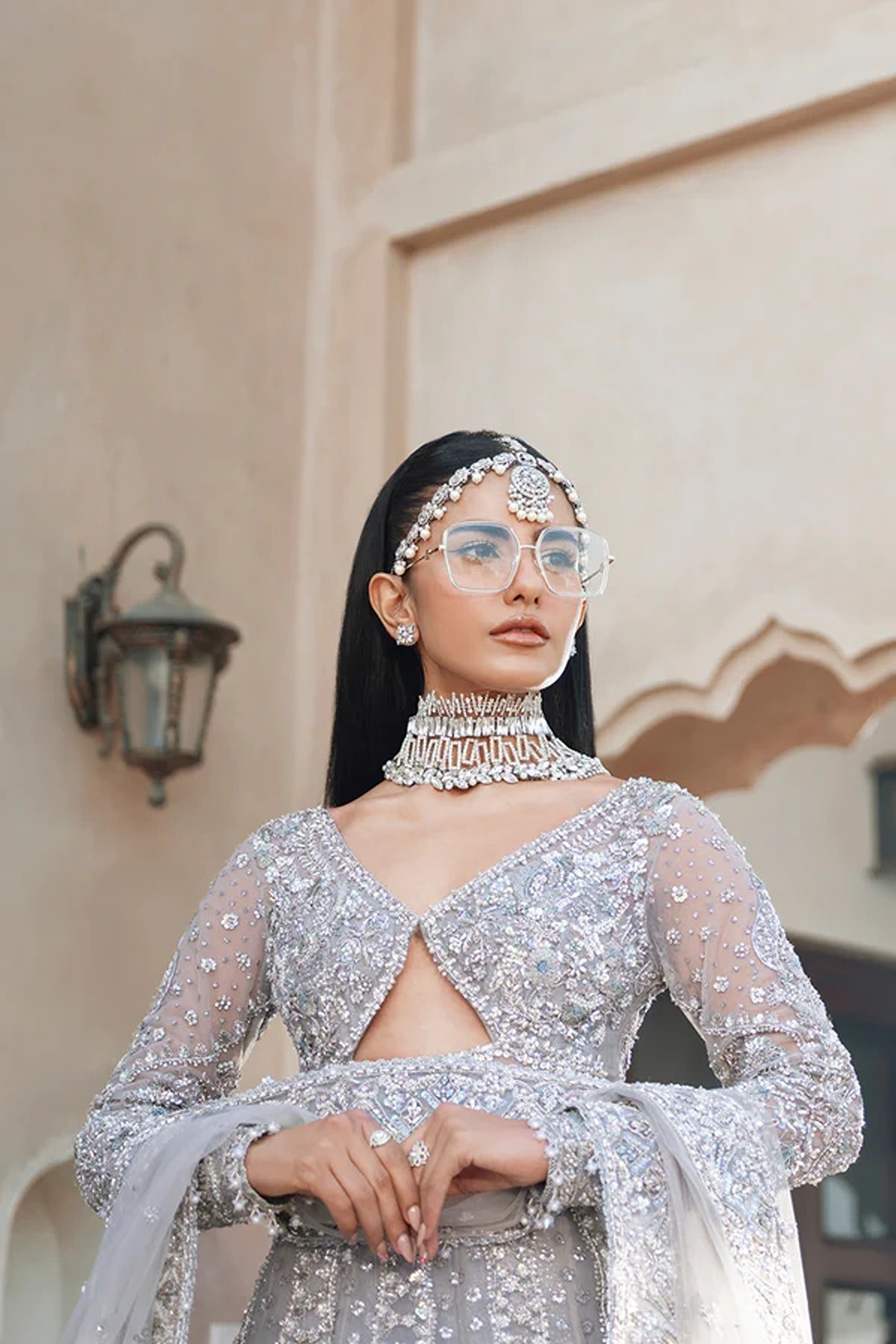 - Clara is a stunning blend of modern elegance and timeless tradition. Crafted from luxurious Net and Lamba fabric, this masterpiece is adorned with exquisite Kora Dabka, radiant pearls, delicate Cut Dana, and silver Guta and Tila. Each intricate embellishment tells a story of unparalleled craftsmanship, creating a sophisticated and graceful look.