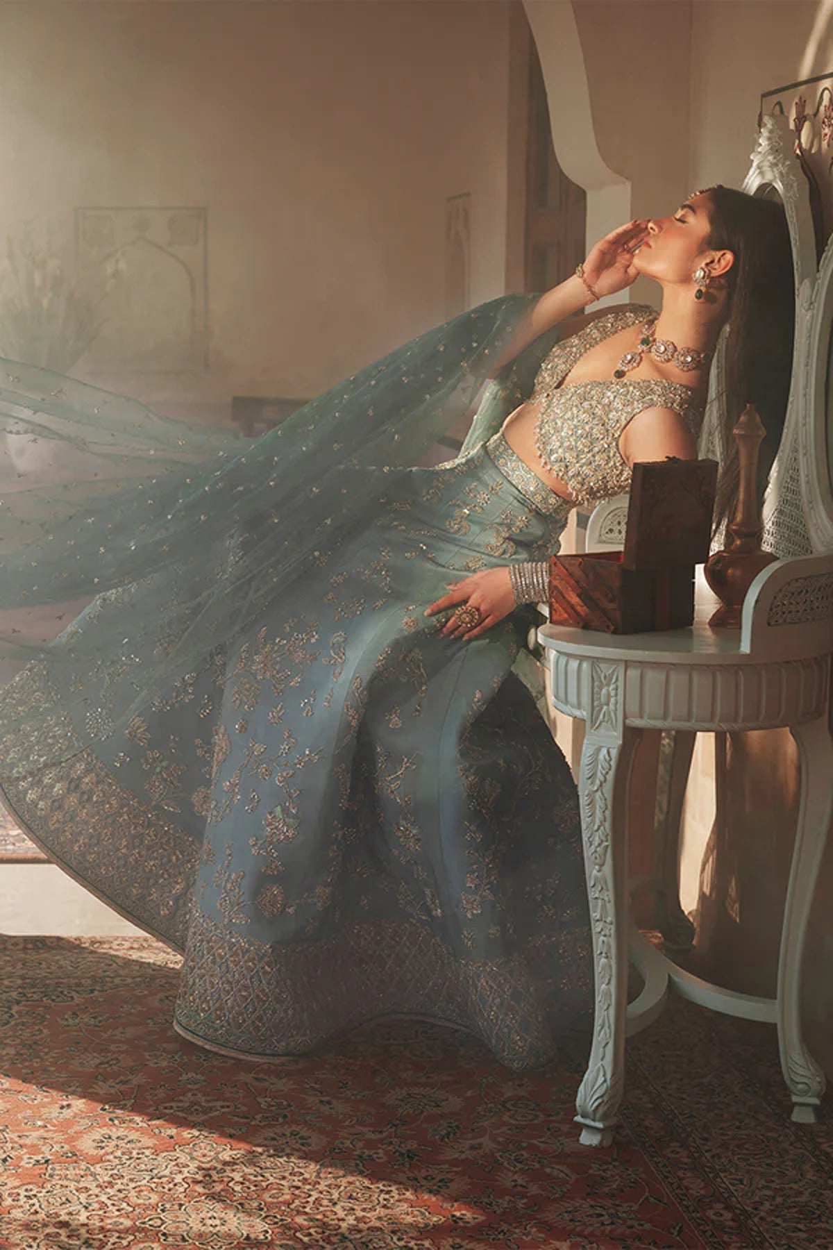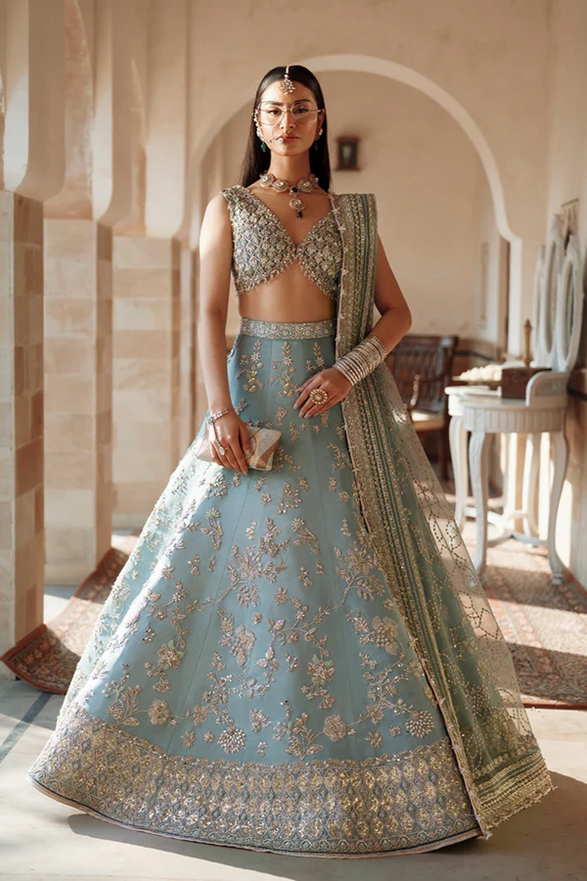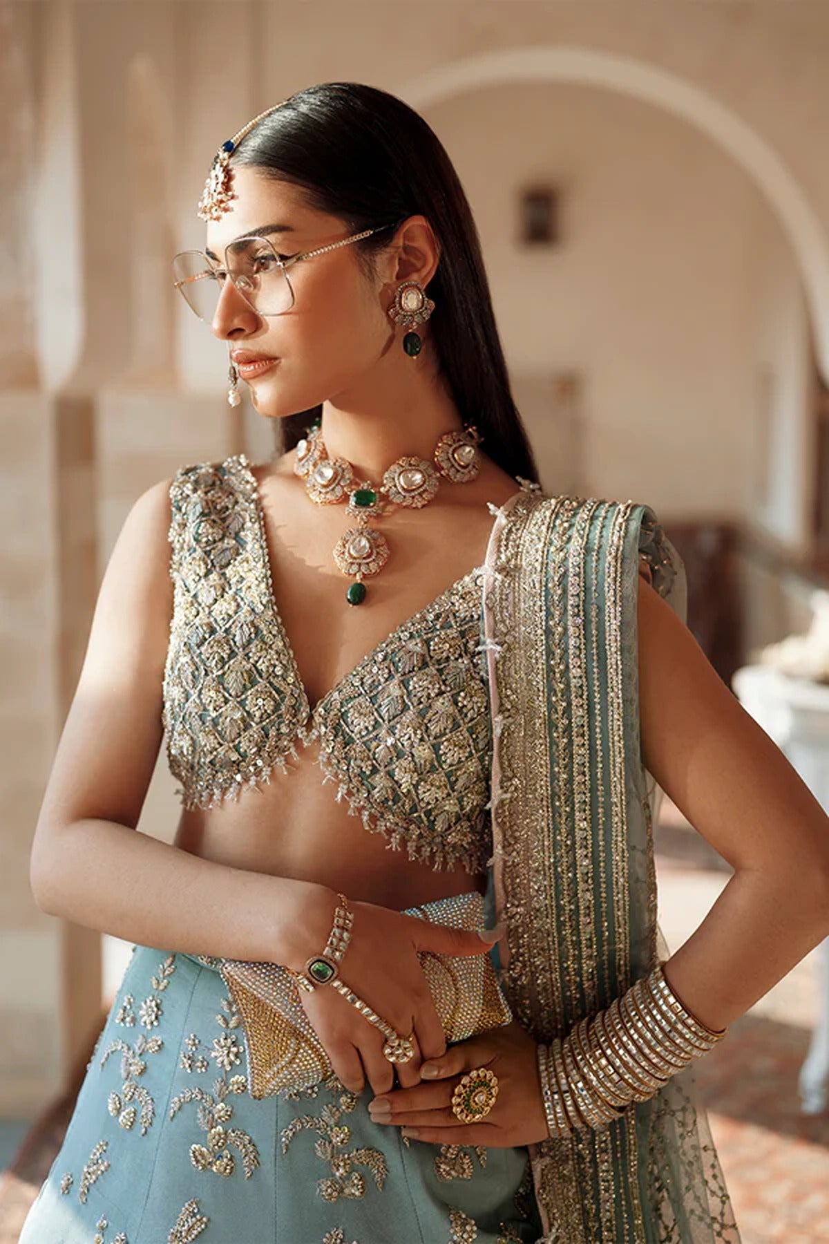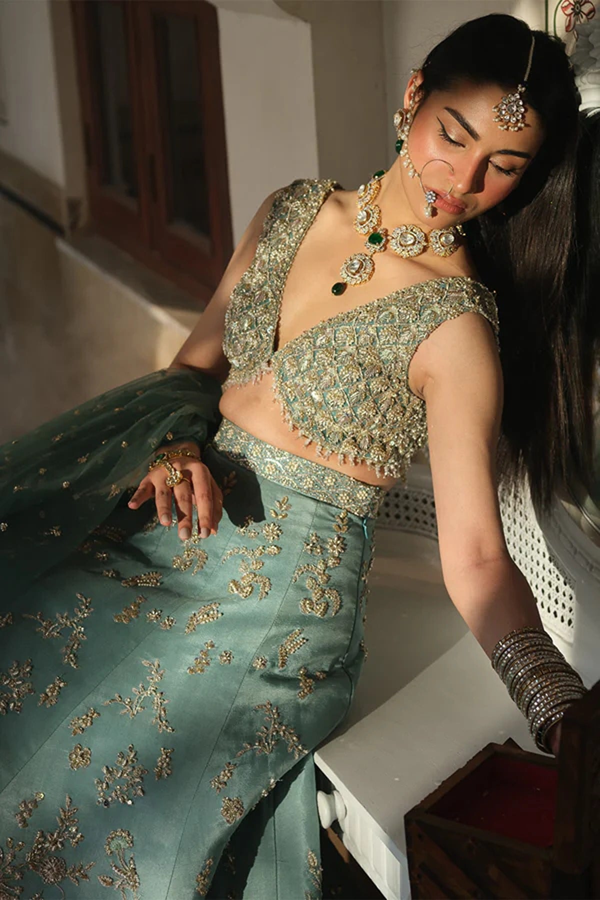 - Livia is a seamless blend of modern elegance and timeless tradition. Crafted from pure Raw Silk for the lehenga and delicate Net for the blouse and dupatta, this masterpiece is adorned with intricate Zardozi, Swarovski crystals, radiant pearls, and Cut Dana.