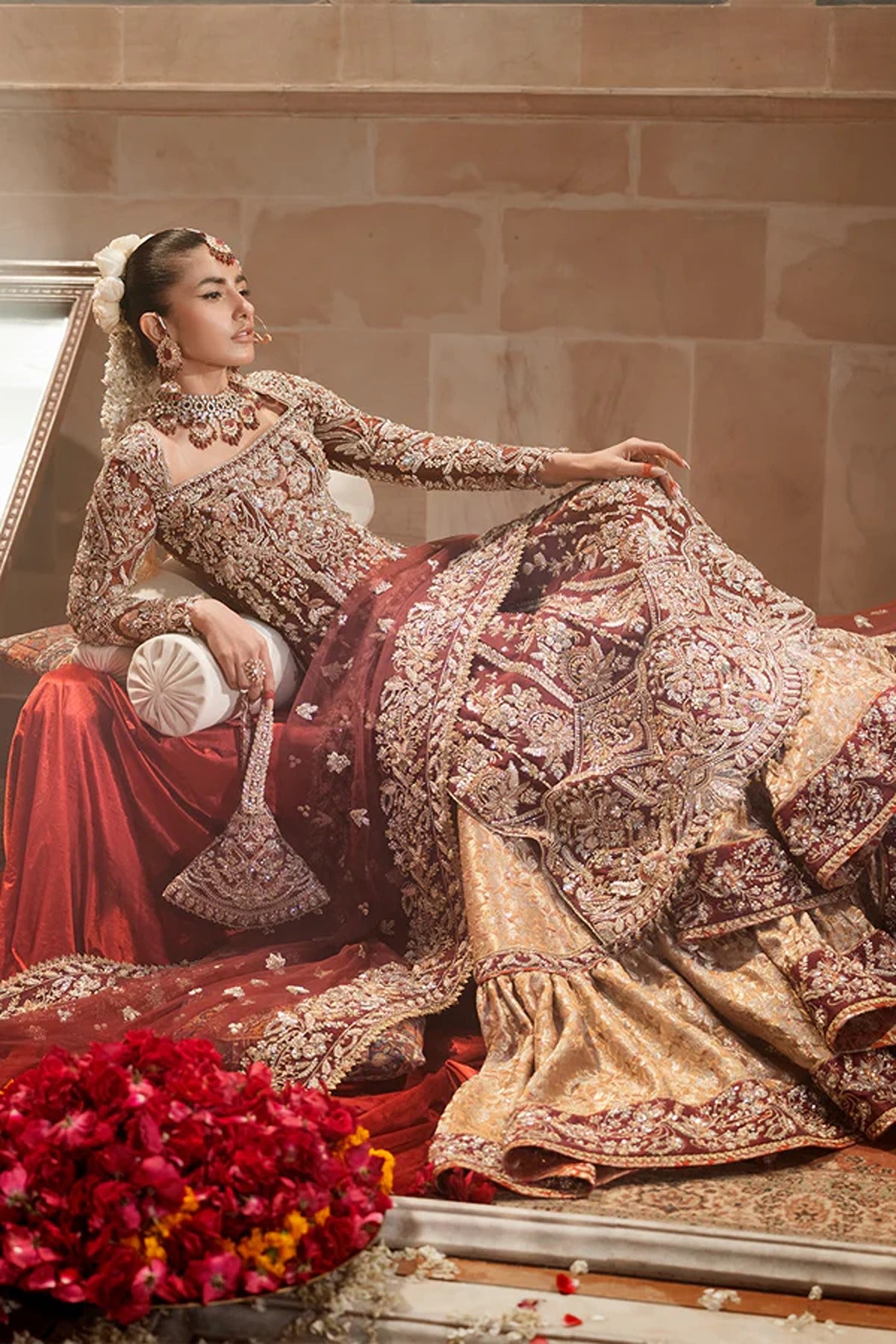 - The Gharara, made from regal Jamawar, enhances the ensemble with its rich texture and depth. Adorned with intricate Kora Dabka, shimmering pearls, Cut Dana, and radiant silver Guta and Tila, Velour showcases unparalleled craftsmanship.