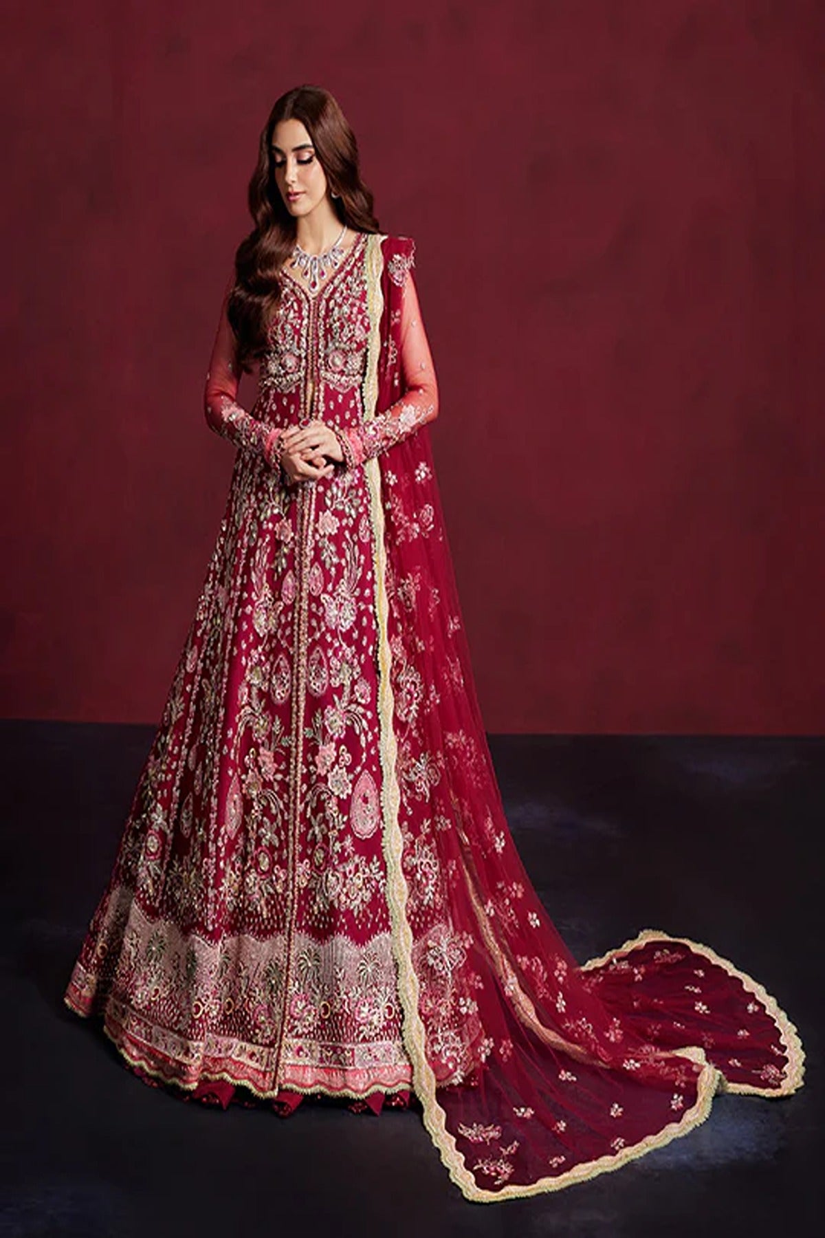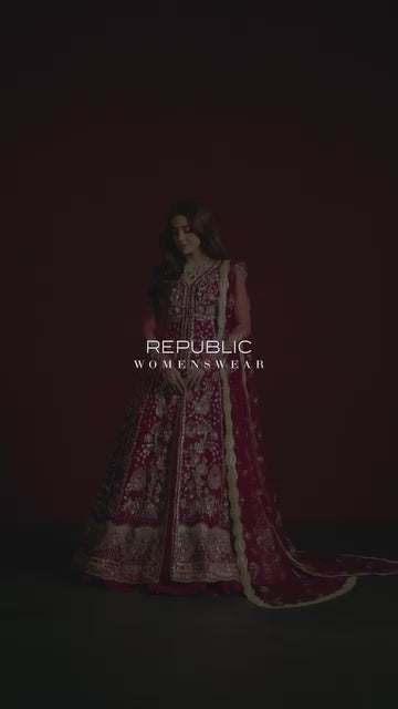 Silene’ glides in with coral hue, it a stunning hot pink paneled pishwas that embodies luxury. Rich lime and coral accents are intricately woven throughout, perfectly harmonizing with the coral pink hues, blooming a sense of tropical paradise. Precise details crafted with lime and cherry threads, add a modern color palette while embroidered satin borders adorned with shimmering sequins elevate the overall look. The sleeves feature delicate floral branches, create a unique and eye catching effect, as if plucked from a whimsical garden. Completing this masterpiece is a net dupatta, trimmed with a beautiful lime satin border to complete this ensemble’s distinguished look.