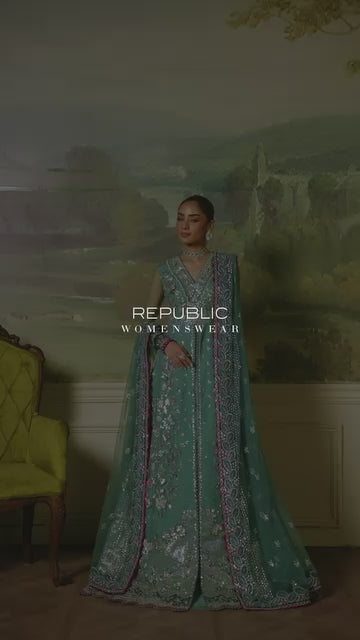 Discover the allure of this stunning Jade green with Serra, a masterful creation that whisks you away to a secret garden. Monochromatic and pink floral bloom across the fabric, accented by shimmering silver sequin and tilla details. The paneled design unfolds like a botanical tapestry, revealing the depth and mystery of this hidden oasis. As the pattern flows down the panels, it draws you deeper into the garden’s secrets. With its luxurious adda work and balanced color palette, Serra embodies feminine sophistication and whimsical charm.