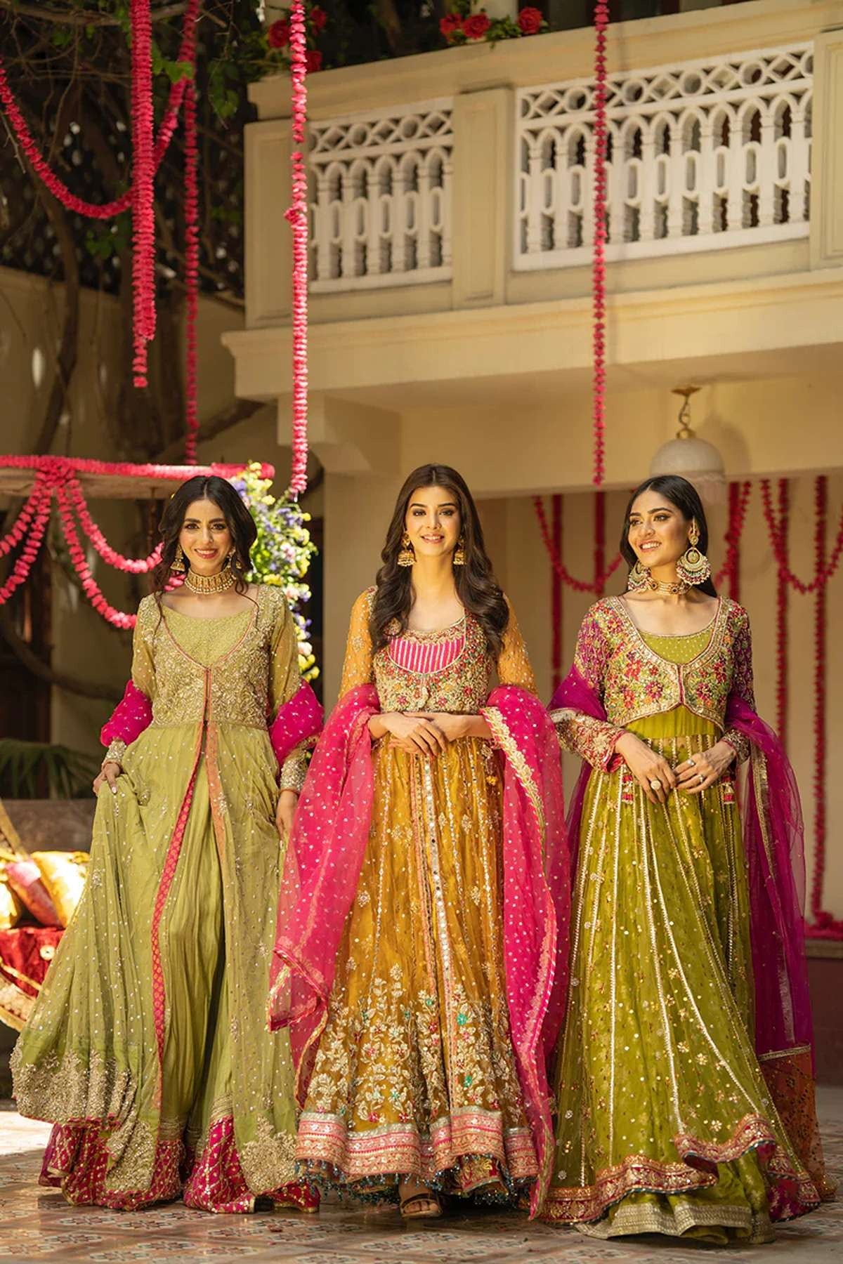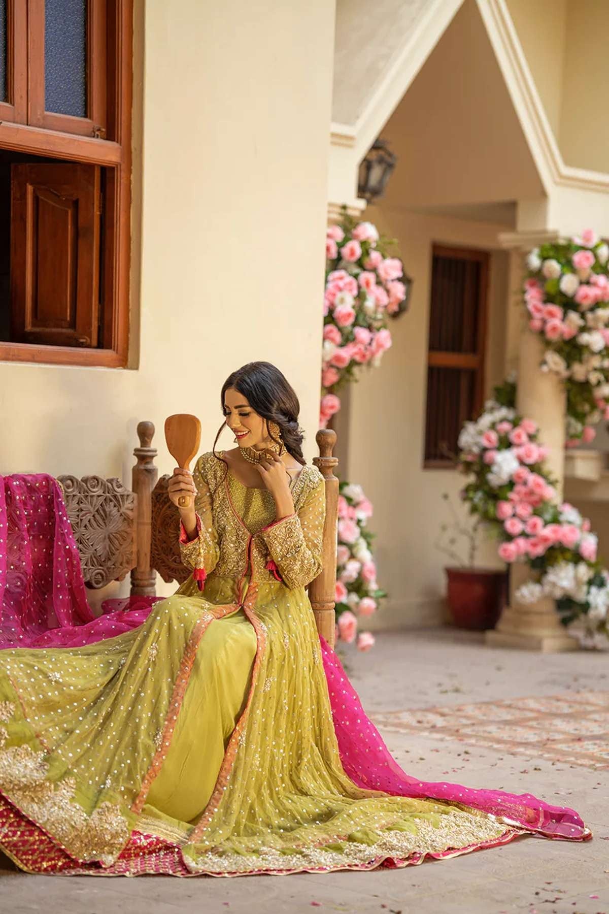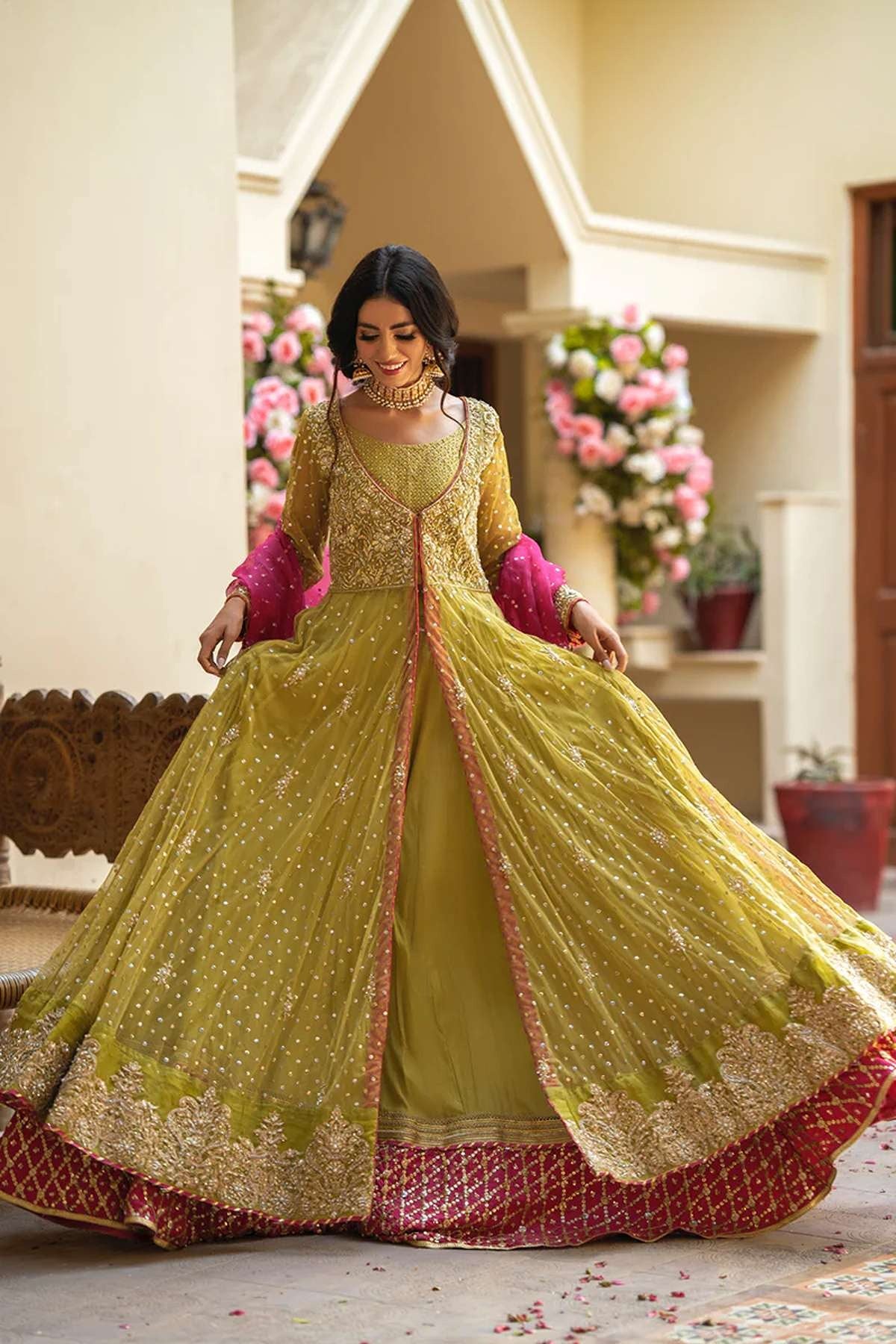 - Long silhouette pishwas on keylime color net canvas with gorgeous zardozi details on the bodice. The pishwas has gorgeous kamdani sequins details overall in shades of silver gold.