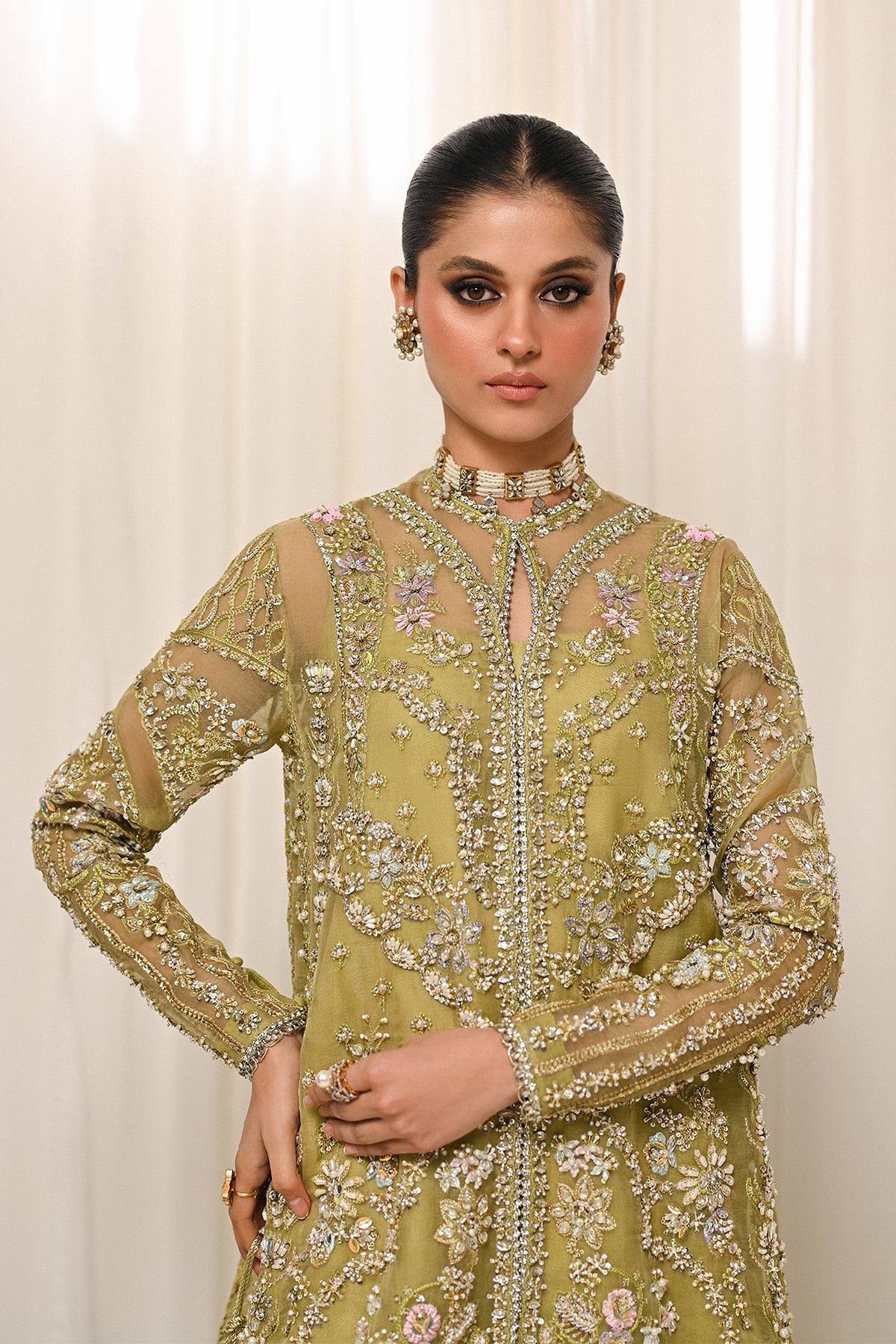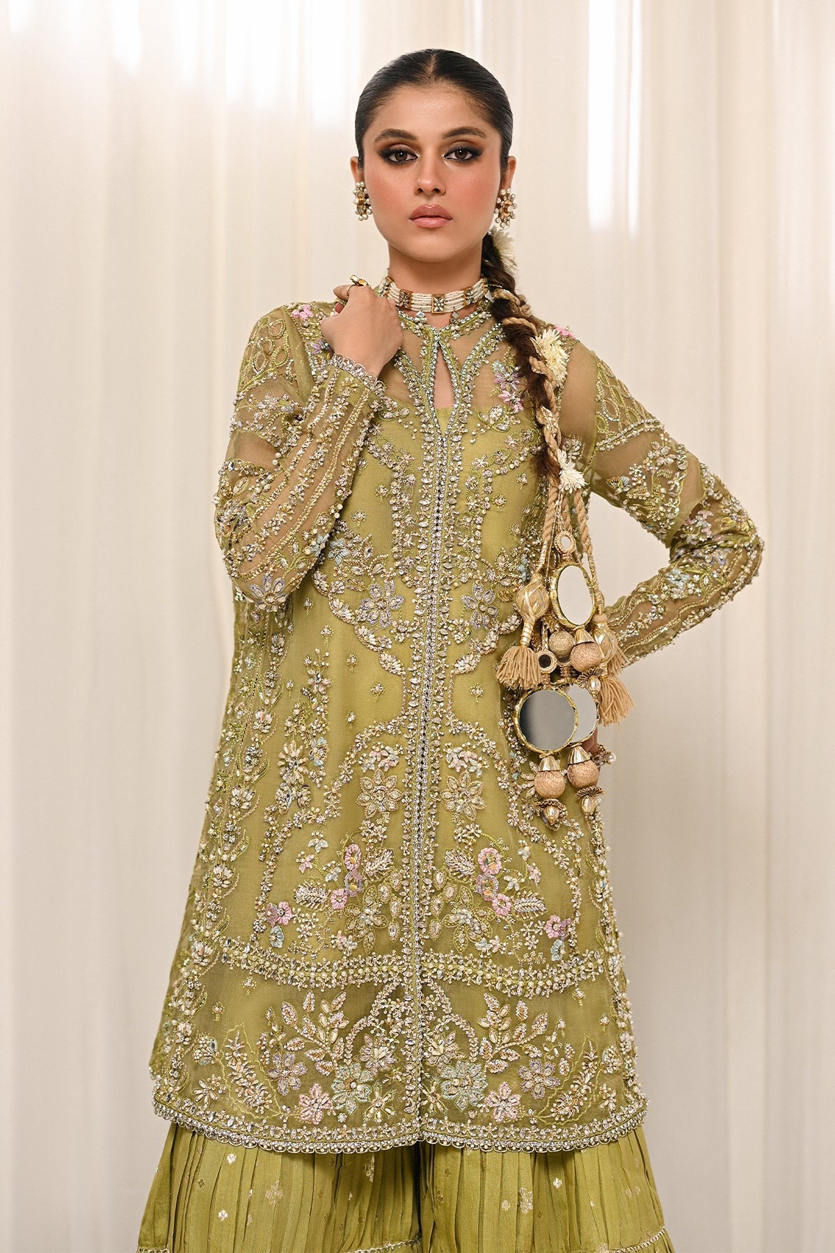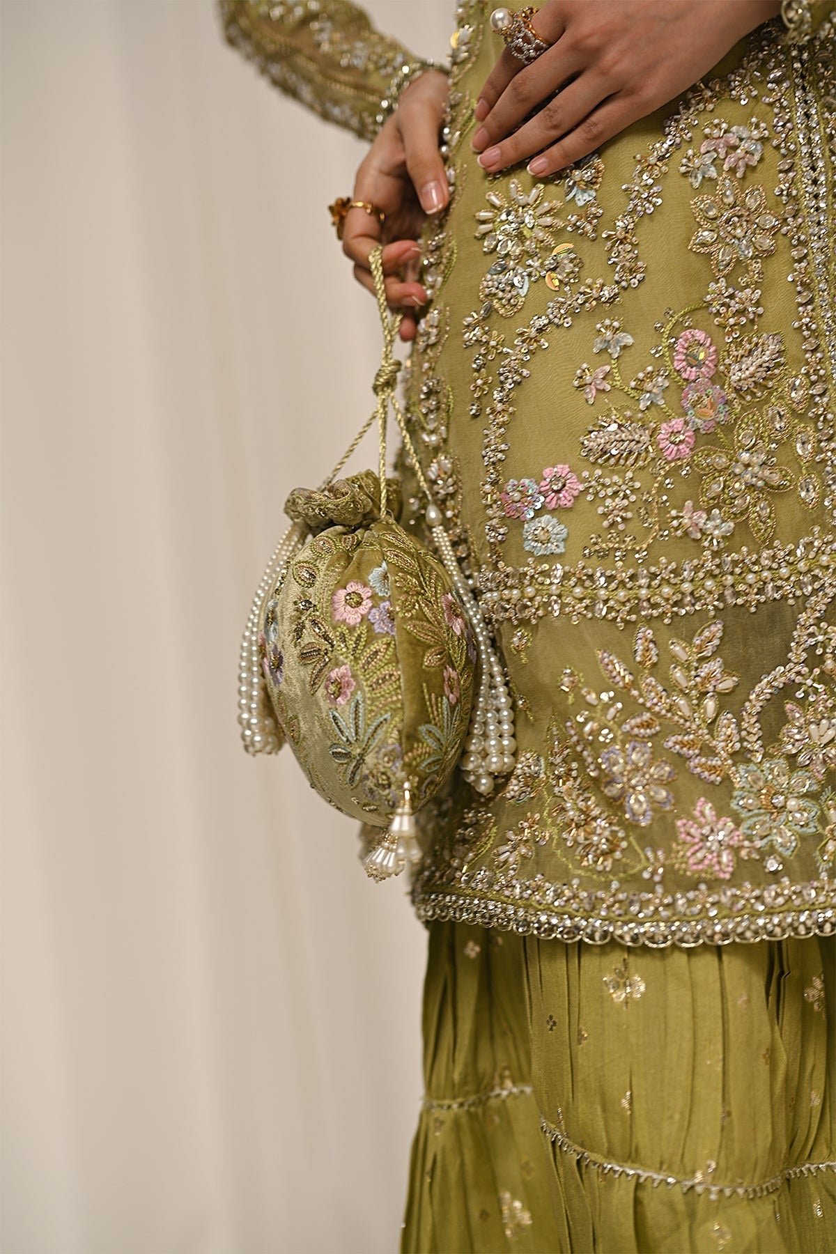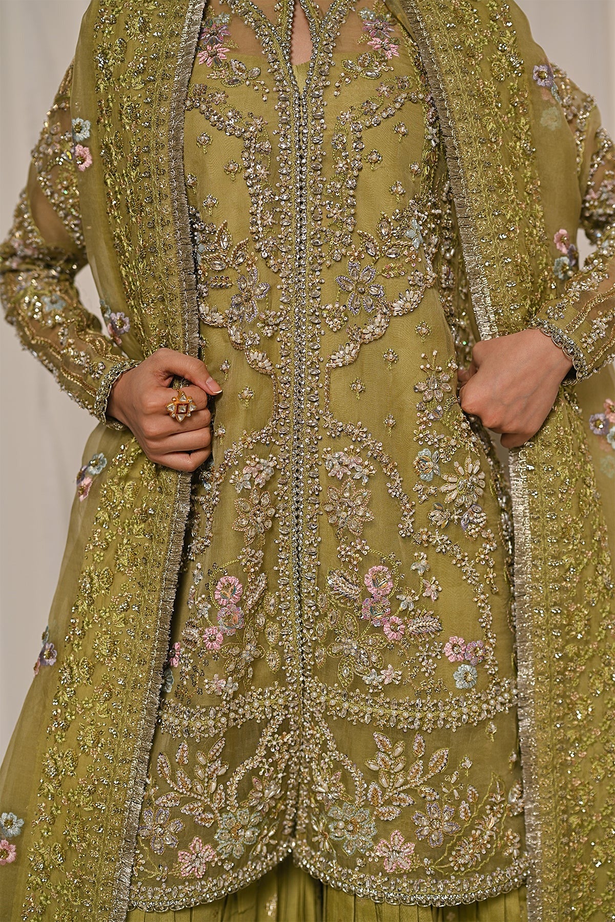 An exquisite olive green ensemble featuring intricate embroidery with delicate floral motifs. Paired with a flowing sharara and a traditional Hyderabadi khara dupatta, this outfit seamlessly blends timeless elegance with regal charm, perfect for festive or bridal occasions.