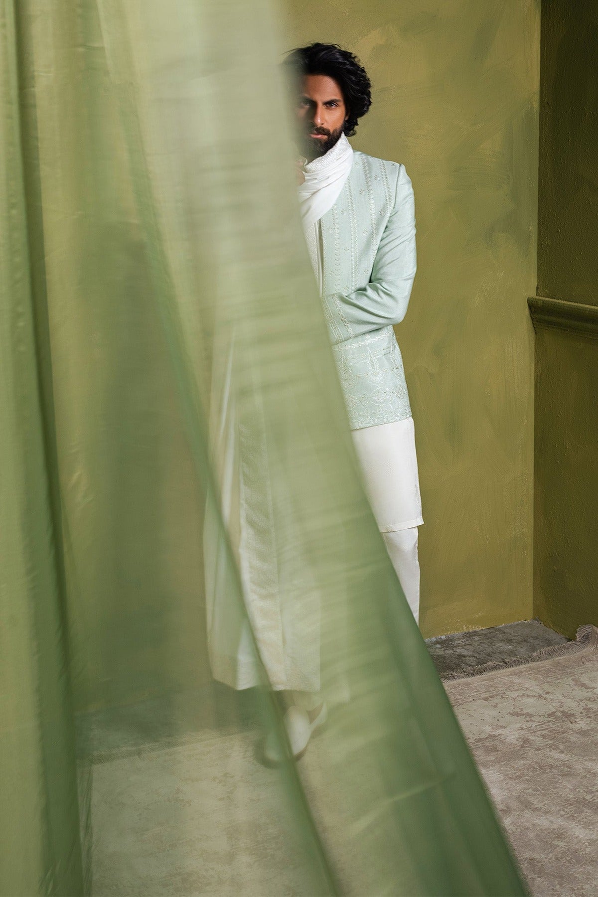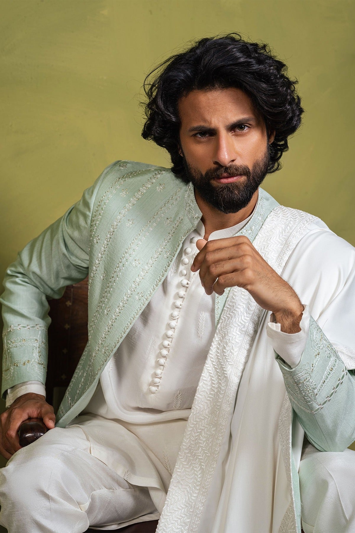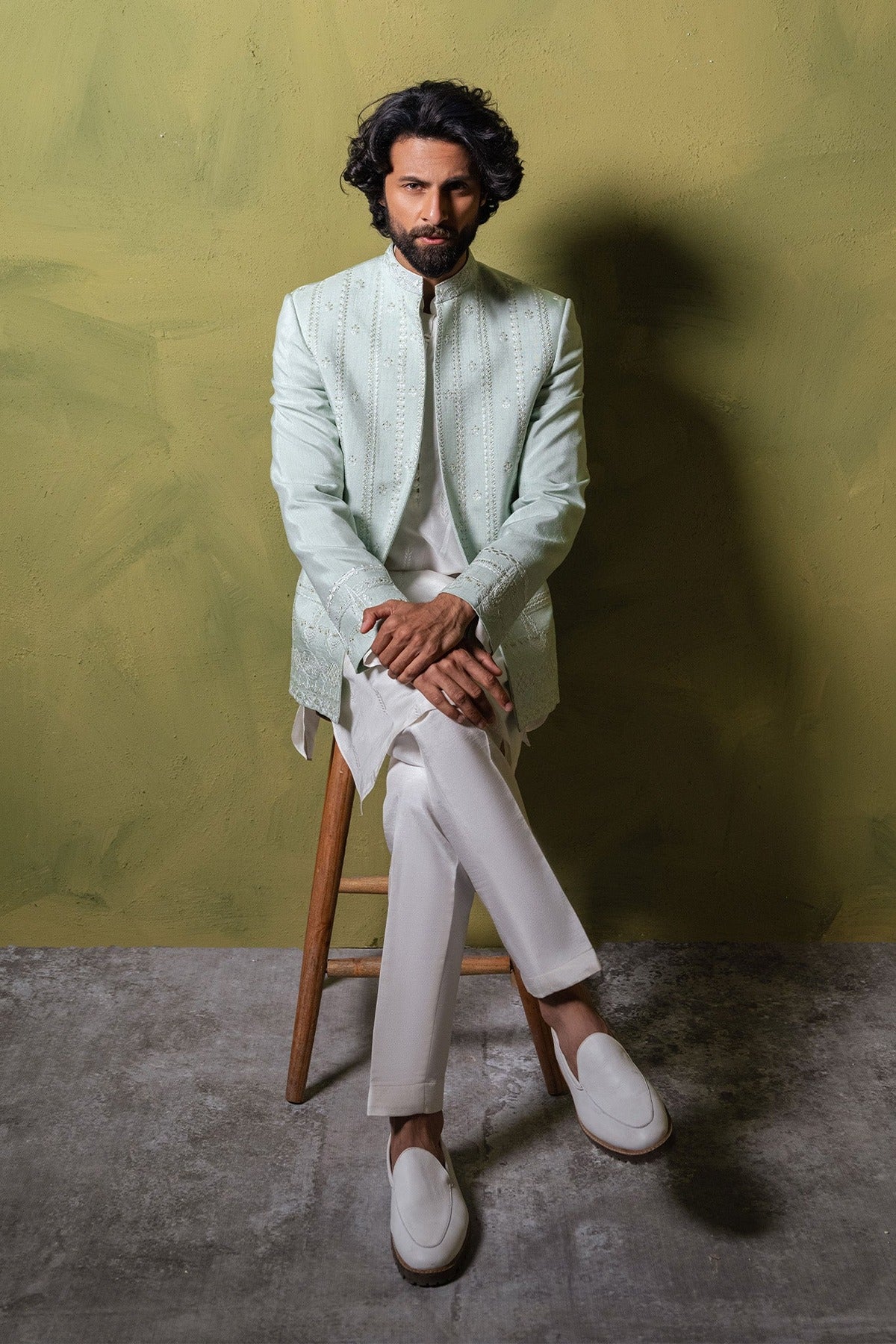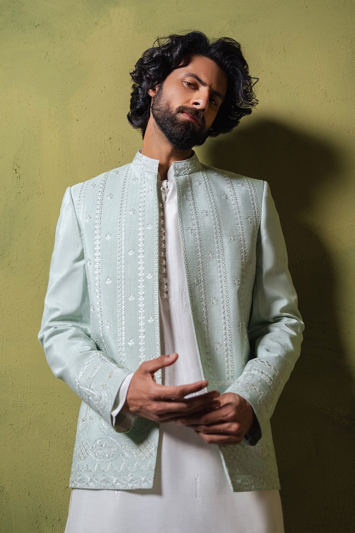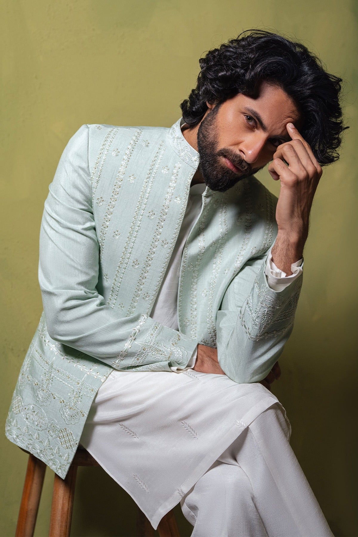 - Introducing mint green prince jacket with intricate resham embroidery, paired with a classic embroidered kurta and plain white pants, is pure elegance!