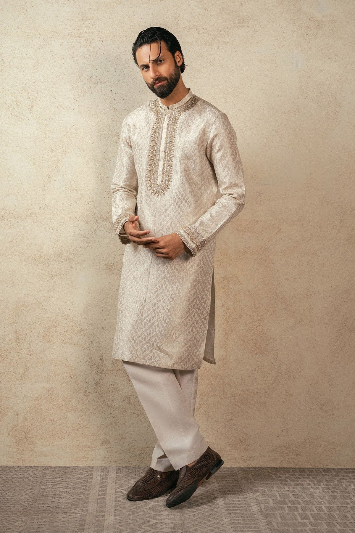 Presenting a beautiful beige kamkhawab kurta with resham and zardozi handwork, paired with straight pants with shawl.