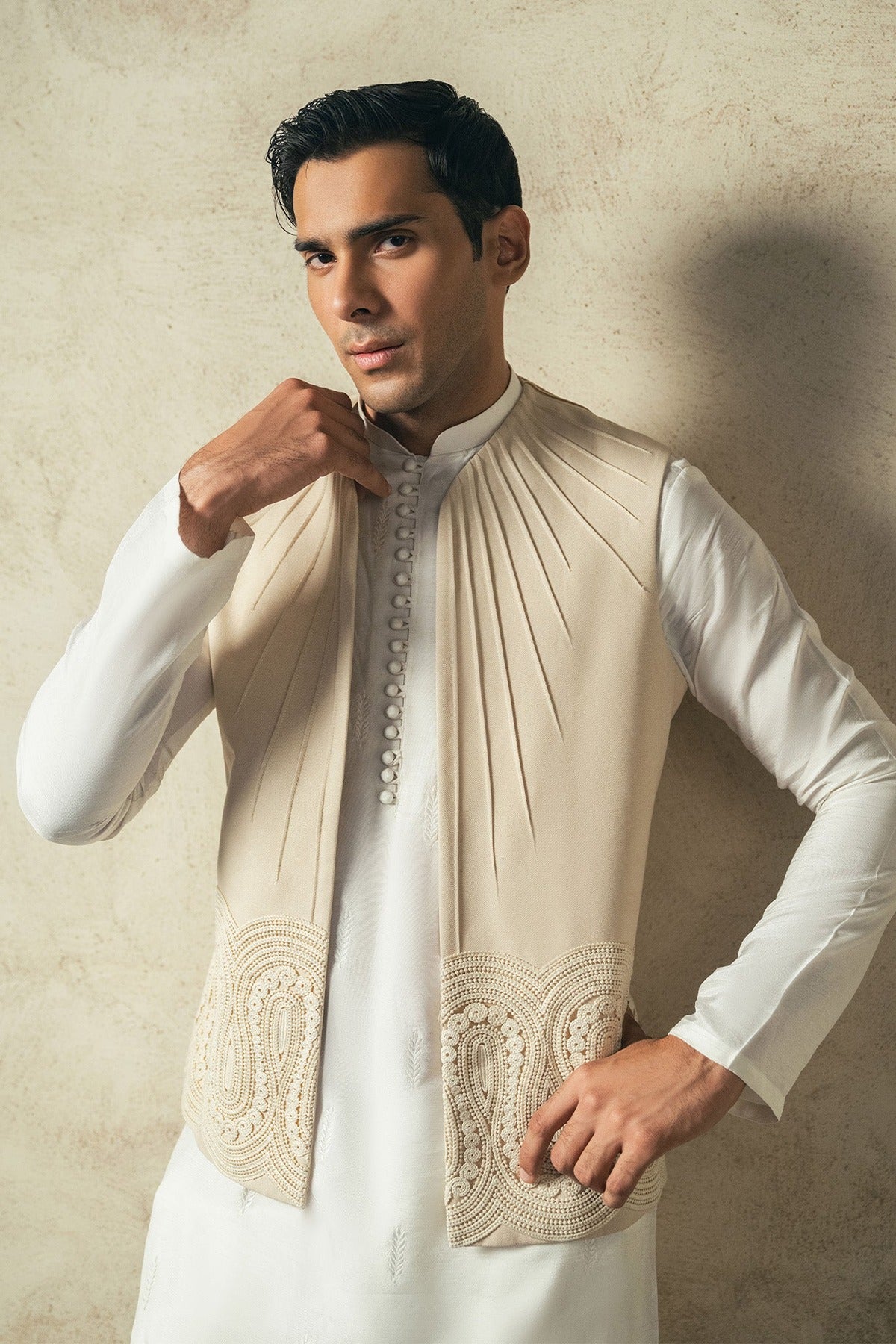 Introducing our beige contemporary style waistcoat, paired with an intricately embroidered white kurta and straight pants. Perfect blend of tradition and modern chic.