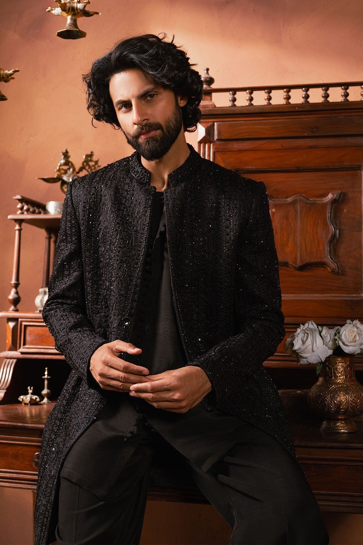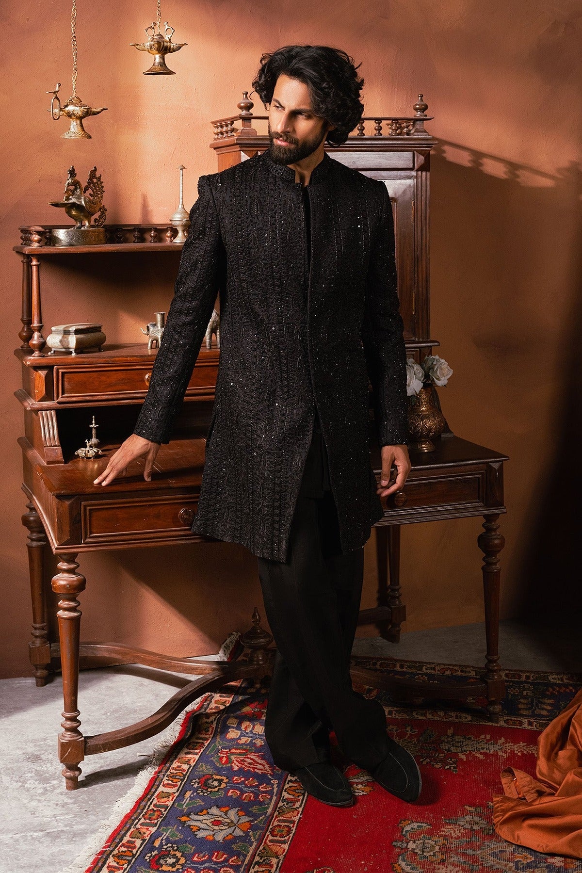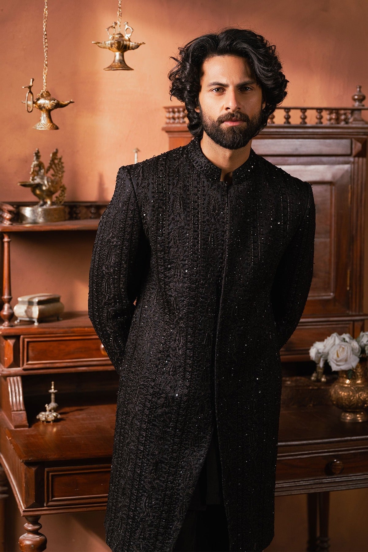 - Introducing black sherwani with all-over self-on-self handwork paired with black pants is a stunning combination of traditional craftsmanship and modern style.