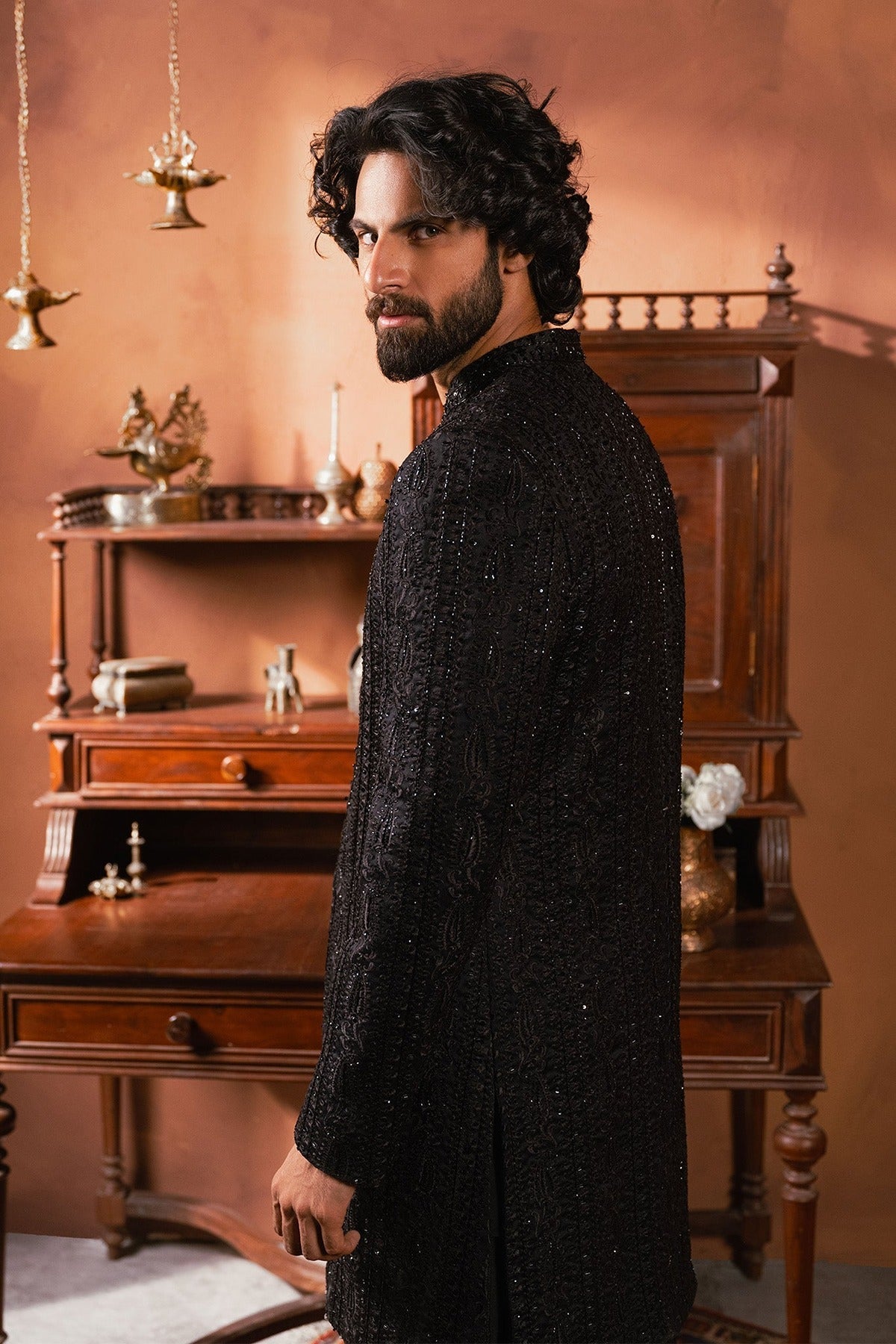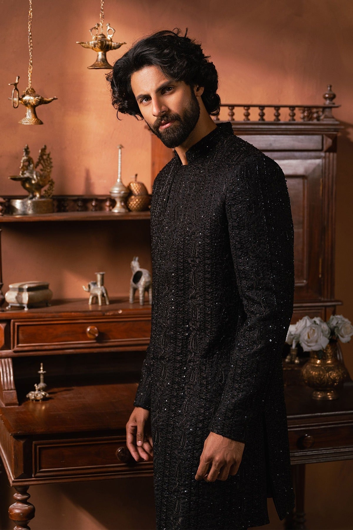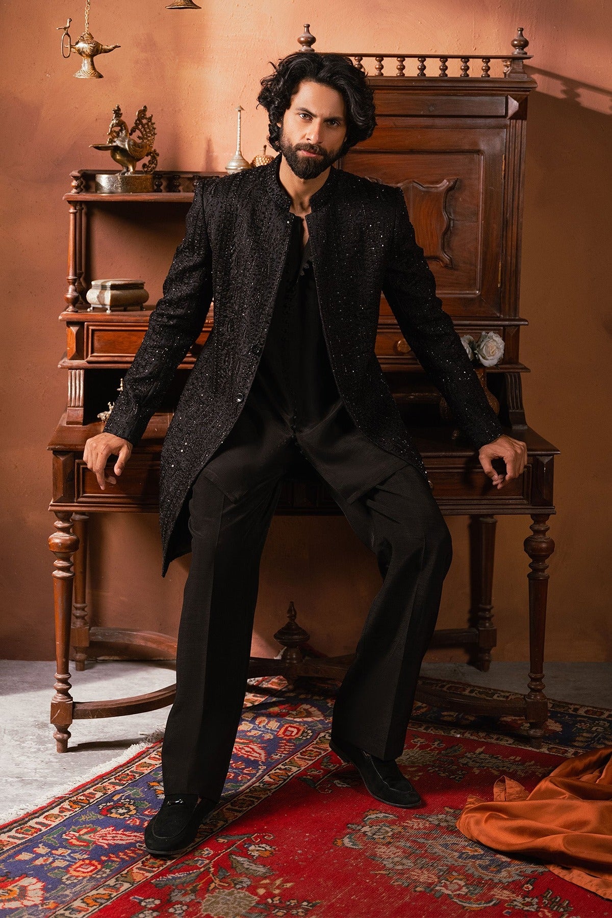 - Introducing black sherwani with all-over self-on-self handwork paired with black pants is a stunning combination of traditional craftsmanship and modern style.