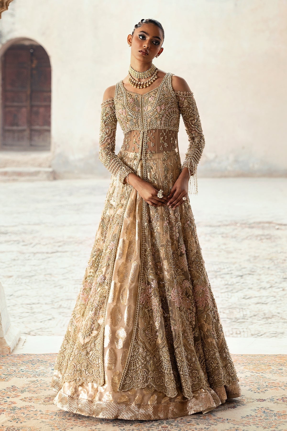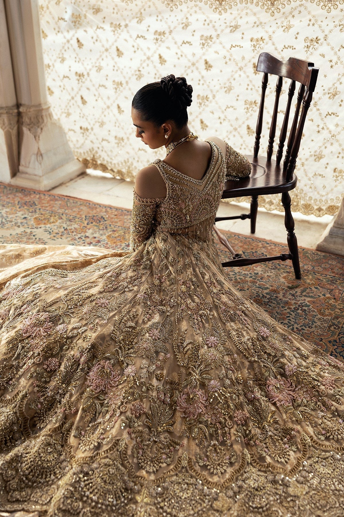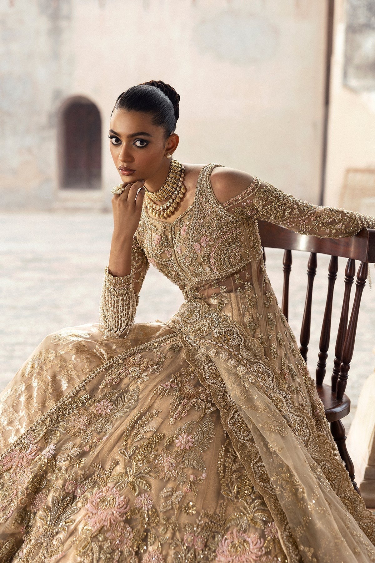 Draped in timeless elegance, this ensemble speaks to the rich legacy of craftsmanship and intricate artistry. This luxurious lehenga exudes opulence with its detailed hand embroidery, where golden threads intertwine with soft pastel accents, creating a canvas of blooming flordls and delicate vines.The sheer fabric on the sleeves is meticulously adorned with intricate beadwork, flowing into dainty pear tassels that add a touch of sophistication and grace.
