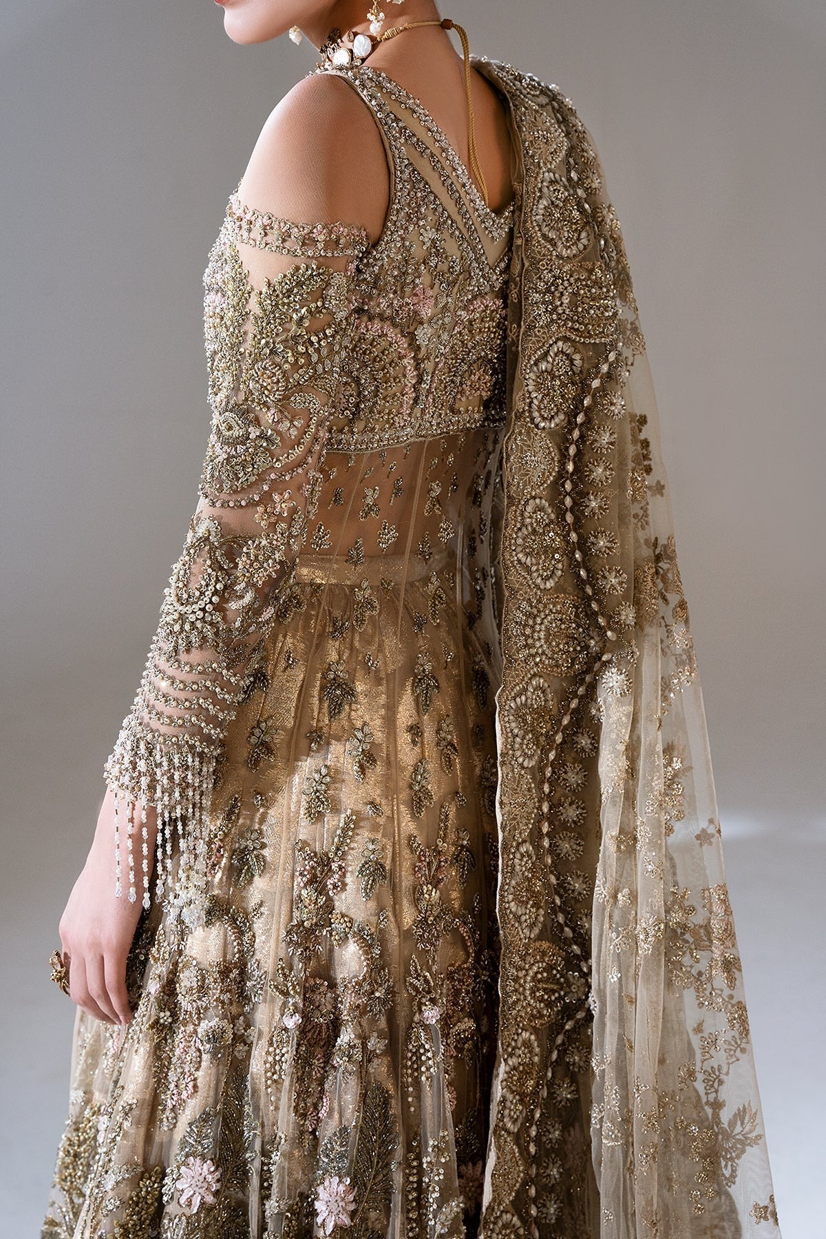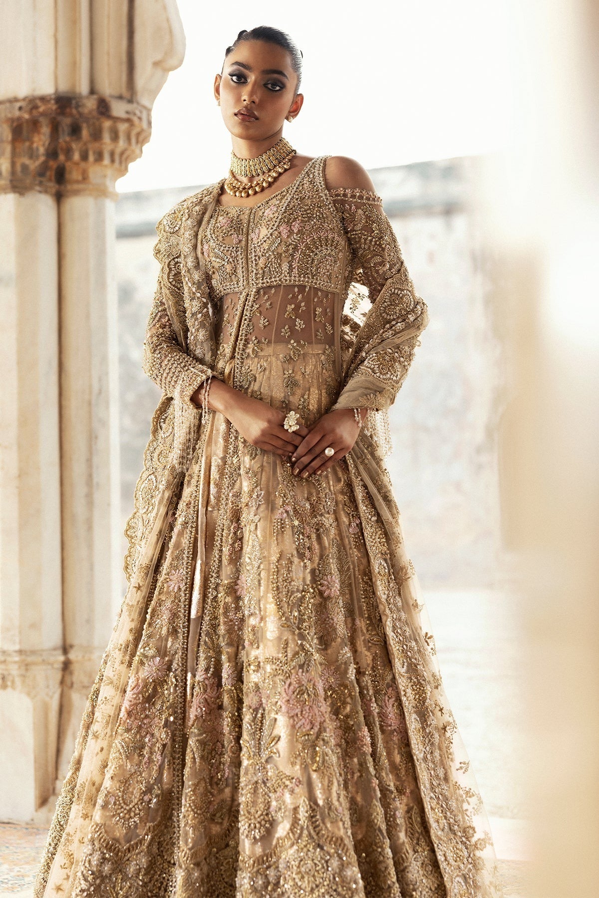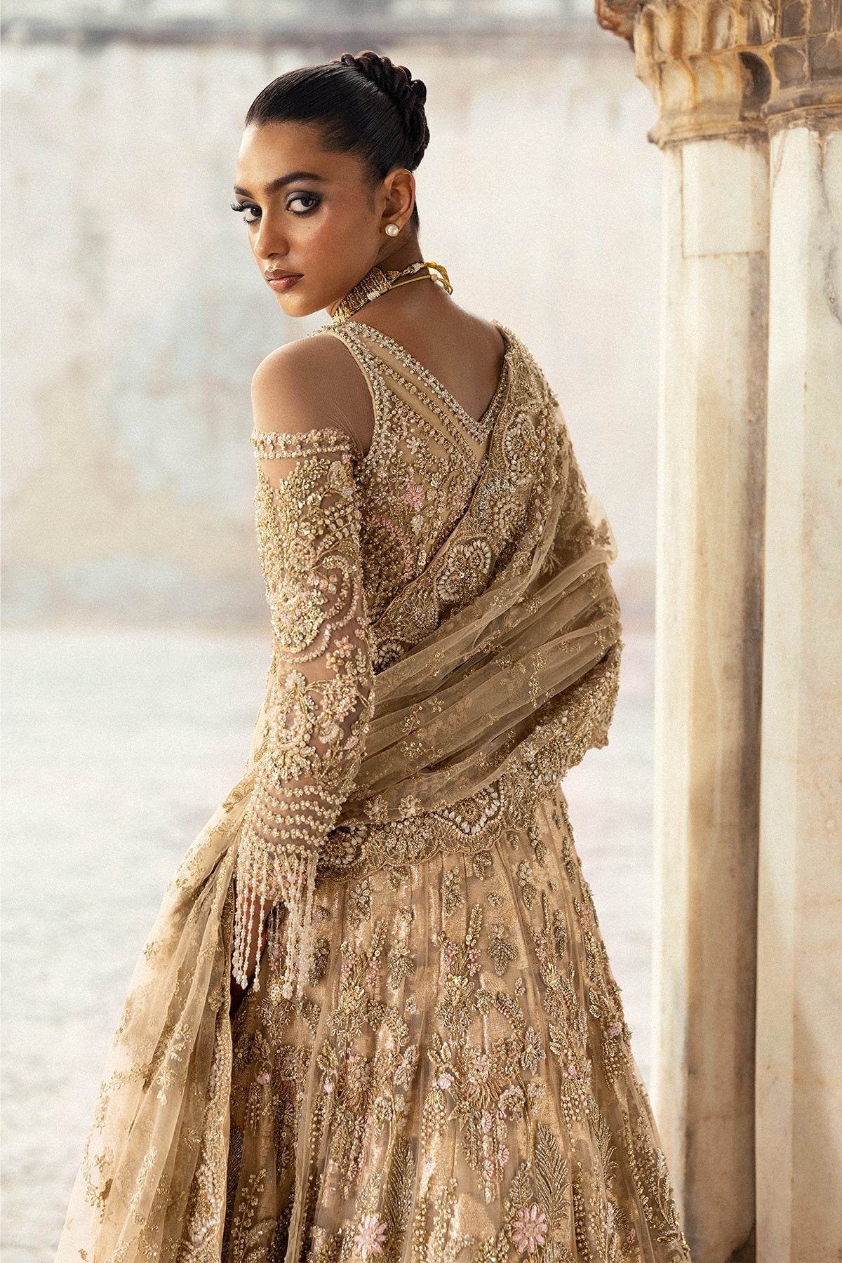 Draped in timeless elegance, this ensemble speaks to the rich legacy of craftsmanship and intricate artistry. This luxurious lehenga exudes opulence with its detailed hand embroidery, where golden threads intertwine with soft pastel accents, creating a canvas of blooming flordls and delicate vines.The sheer fabric on the sleeves is meticulously adorned with intricate beadwork, flowing into dainty pear tassels that add a touch of sophistication and grace.