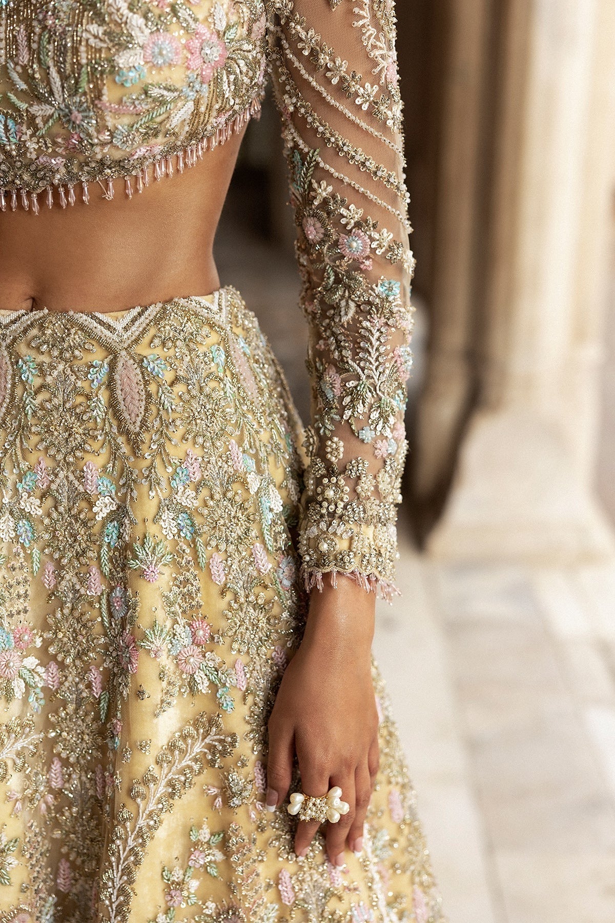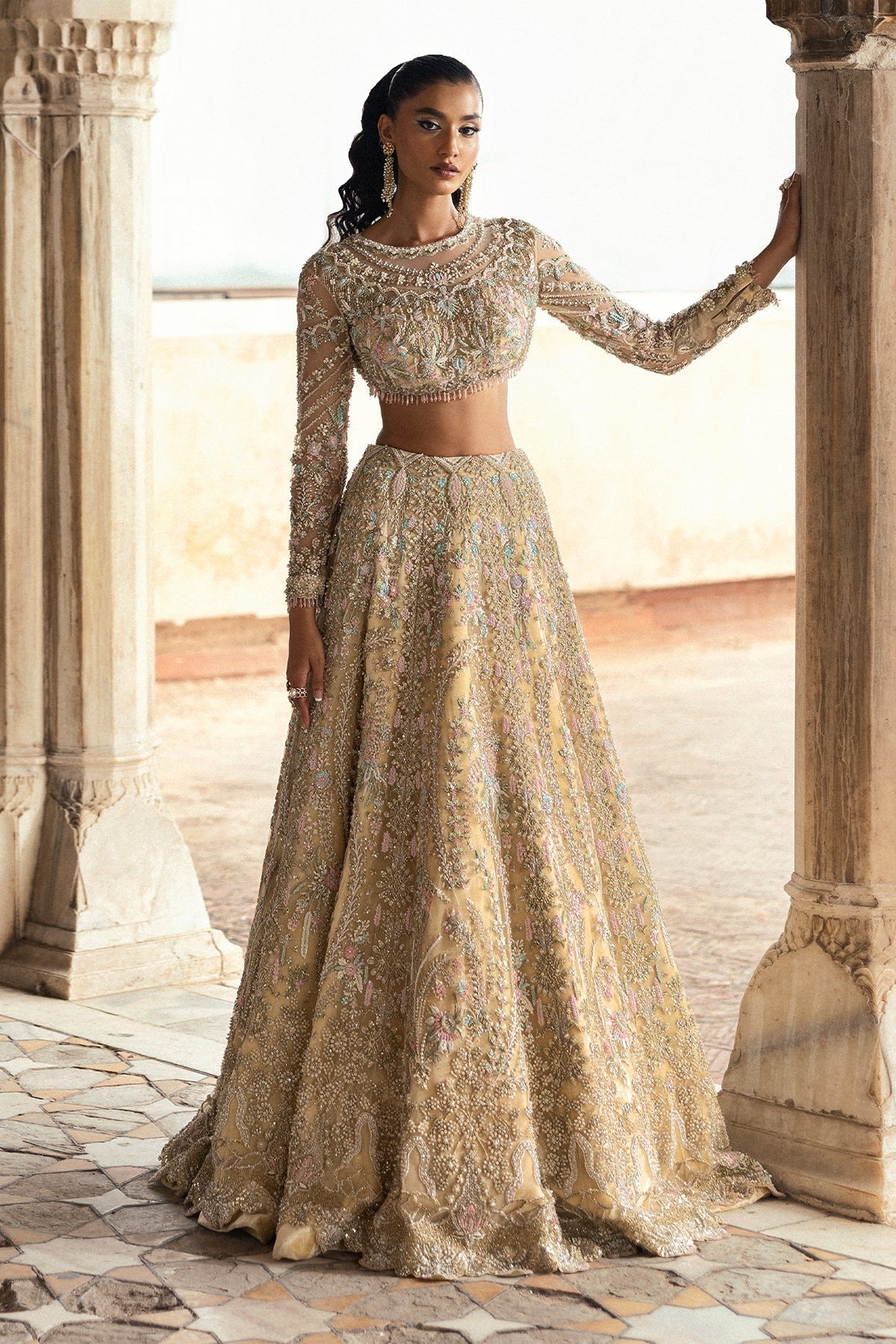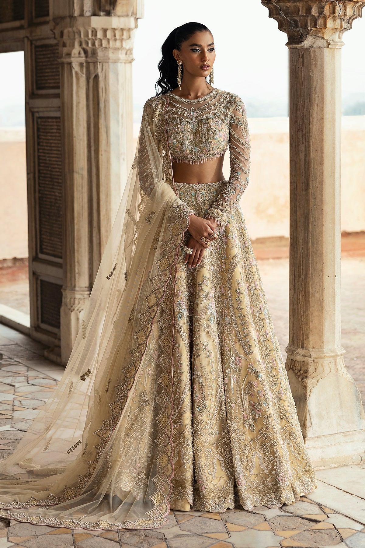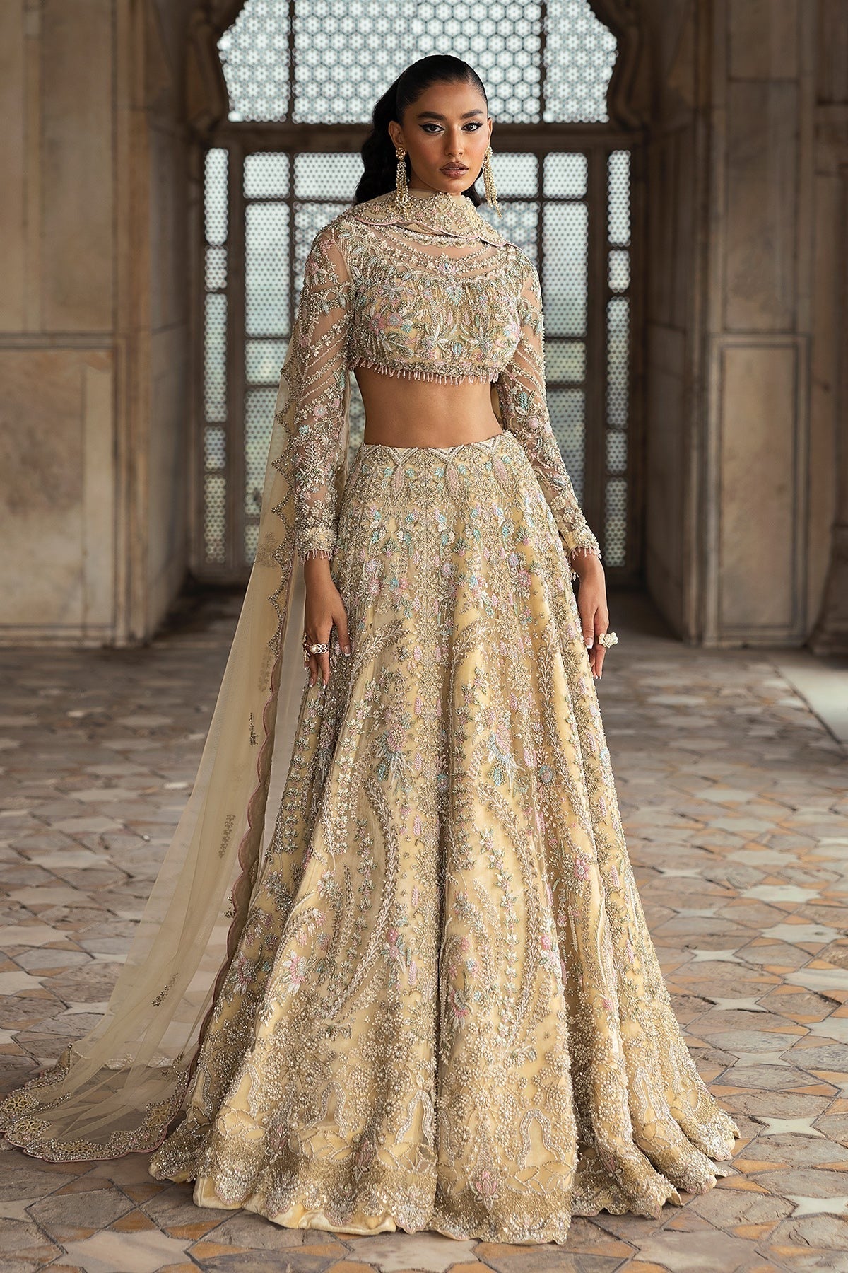 This exquisite light yellow lehenga is adorned with delicate pastel embroidery and intricate beadwork, giving it a soft, graceful charm. The full-sleeve blouse features mesmerizing details that beautifully complement the flowing, embellished skirt. A sheer dupatta with delicate accents adds a finishing touch, creating a look that is both timeless and captivating. Perfect for brides and fashion enthusiasts seeking a look that combines traditional beauty with modern elegance, this outfit is all about making a statement in the most graceful way.