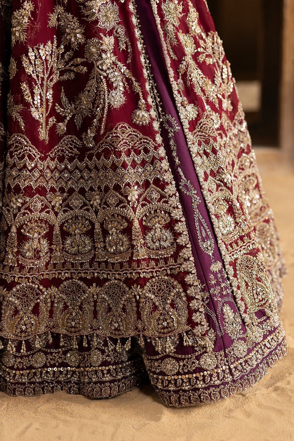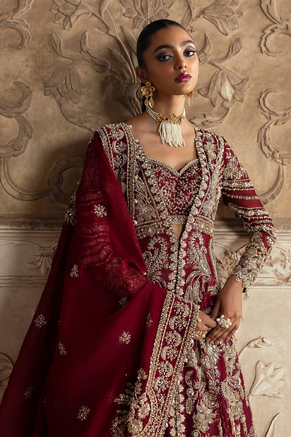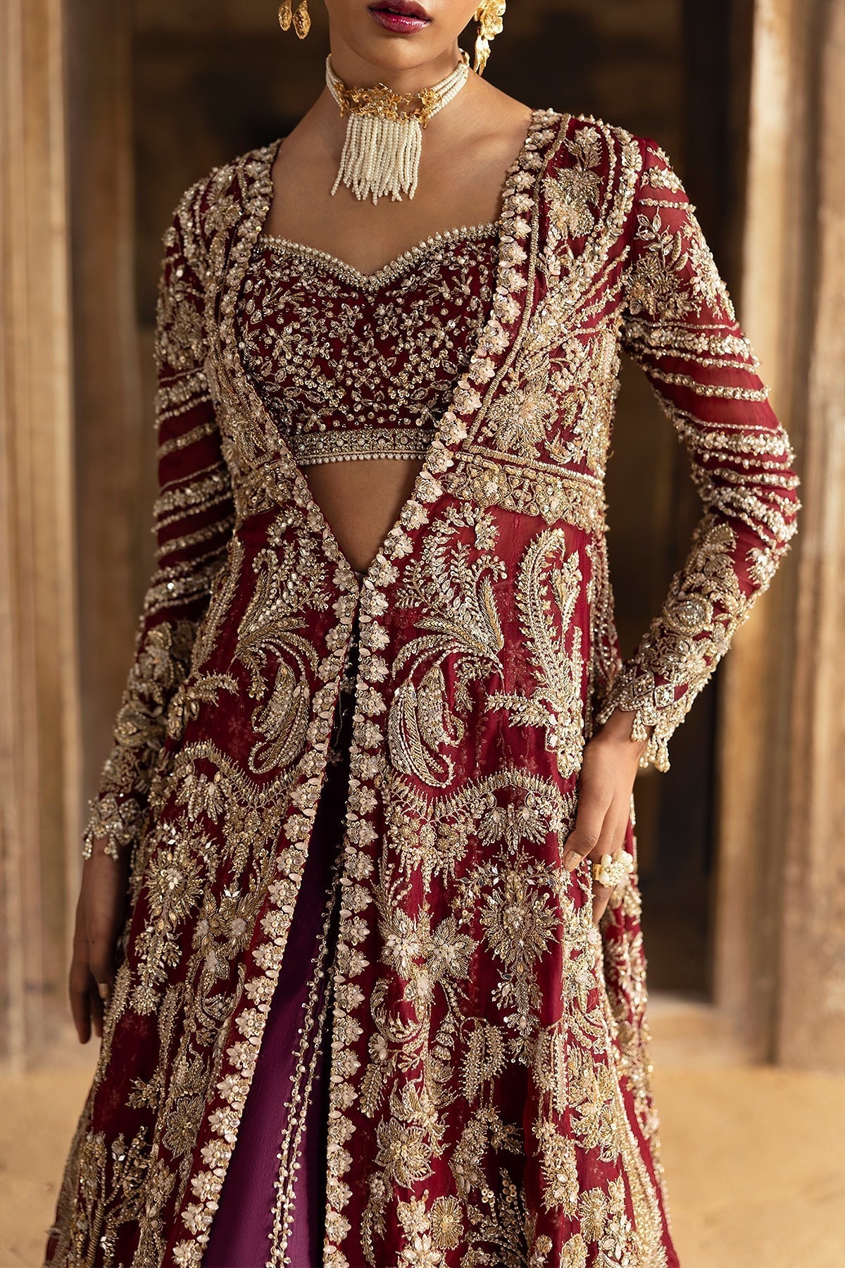 Unveil elegance with this exquisite deep red, front-open, jacket-style kalidar paired with a deep vine-colored lehenga. Every detail speaks of timeless beauty, adorned with intricate zardozi and nakshi work inspired by the elegance of the old era. This ensemble combines the richness of traditional craftsmanship with a modern silhouette.