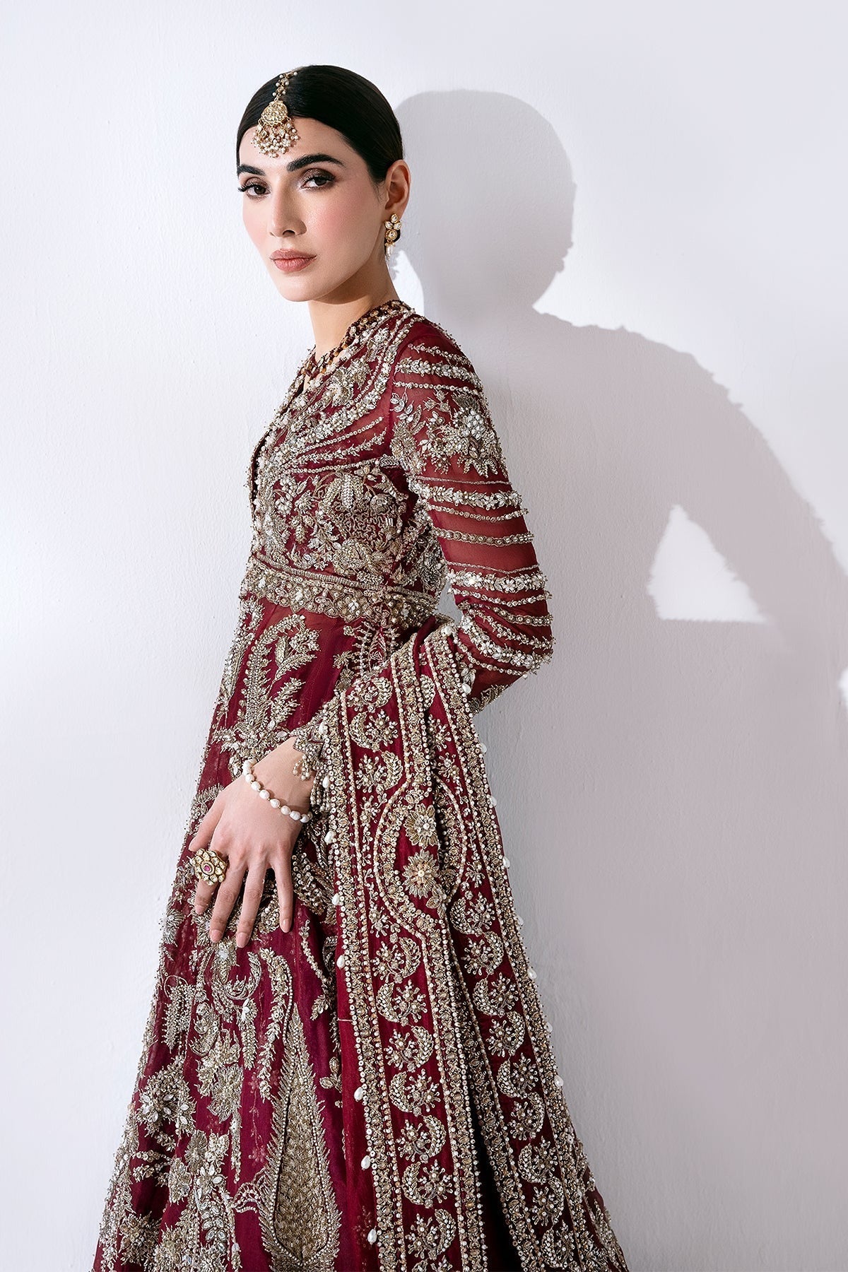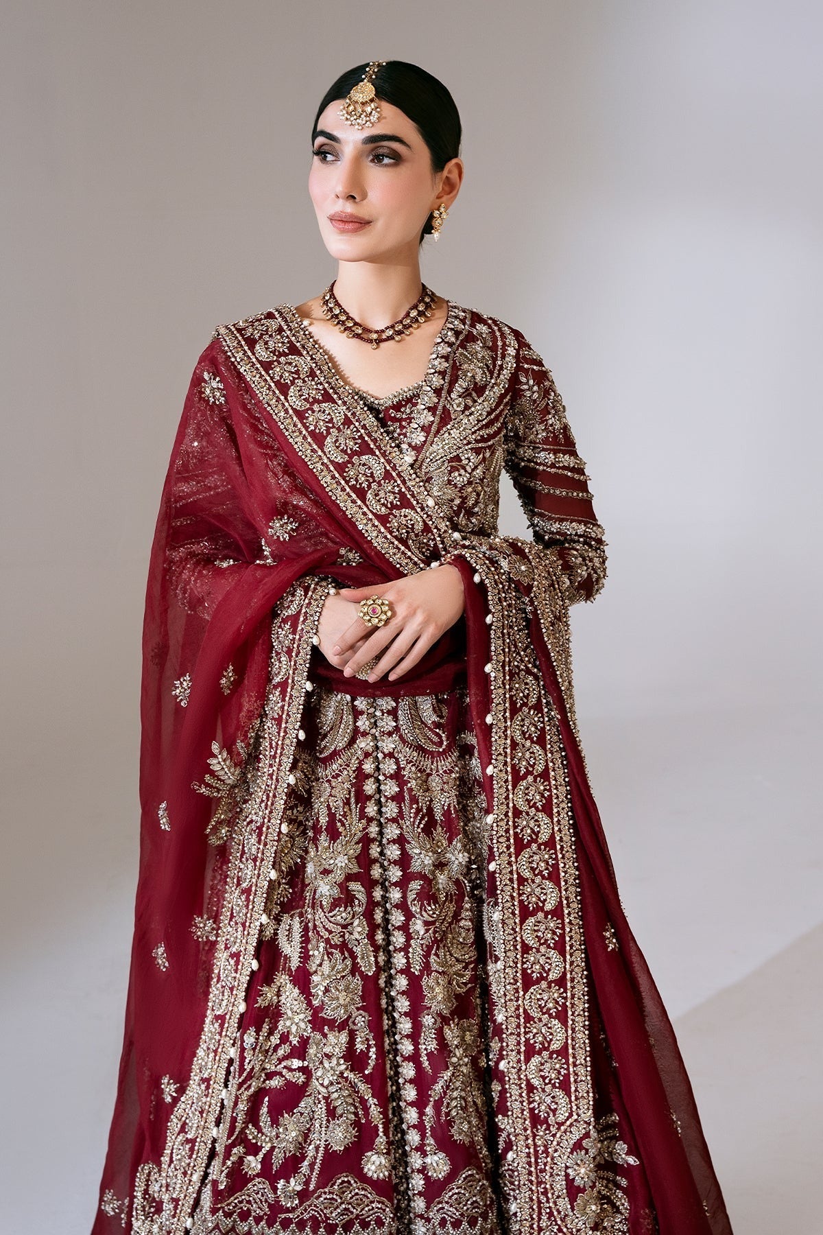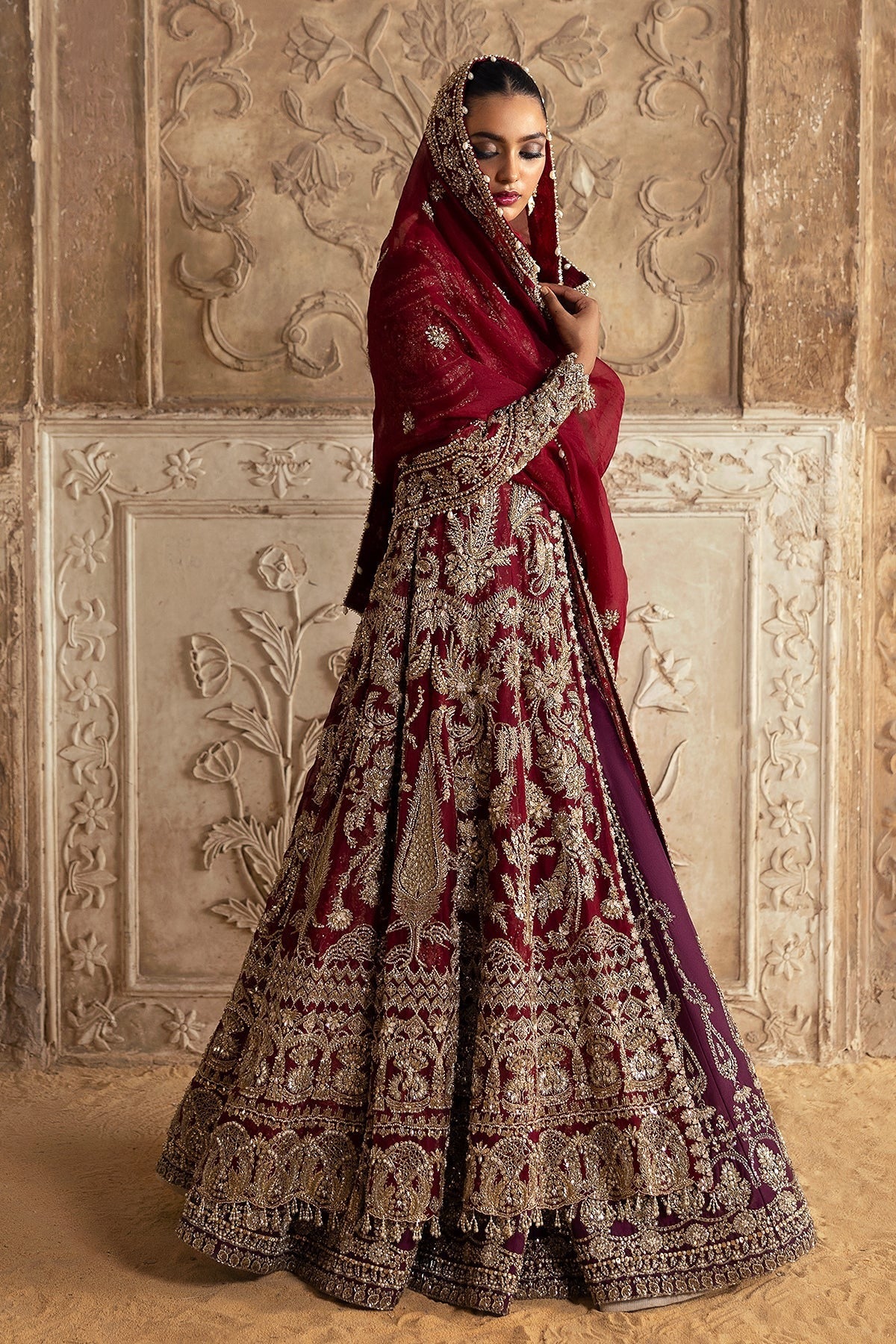 Unveil elegance with this exquisite deep red, front-open, jacket-style kalidar paired with a deep vine-colored lehenga. Every detail speaks of timeless beauty, adorned with intricate zardozi and nakshi work inspired by the elegance of the old era. This ensemble combines the richness of traditional craftsmanship with a modern silhouette.