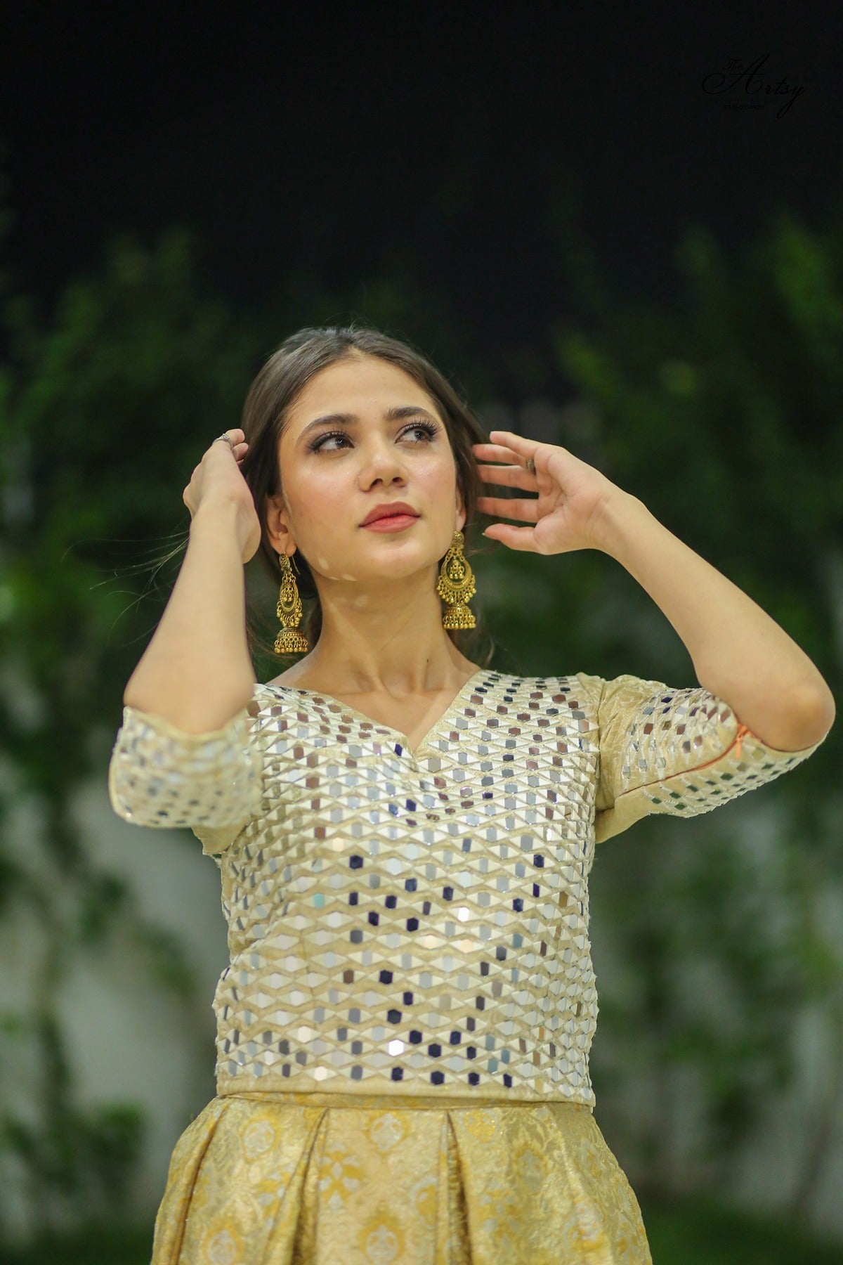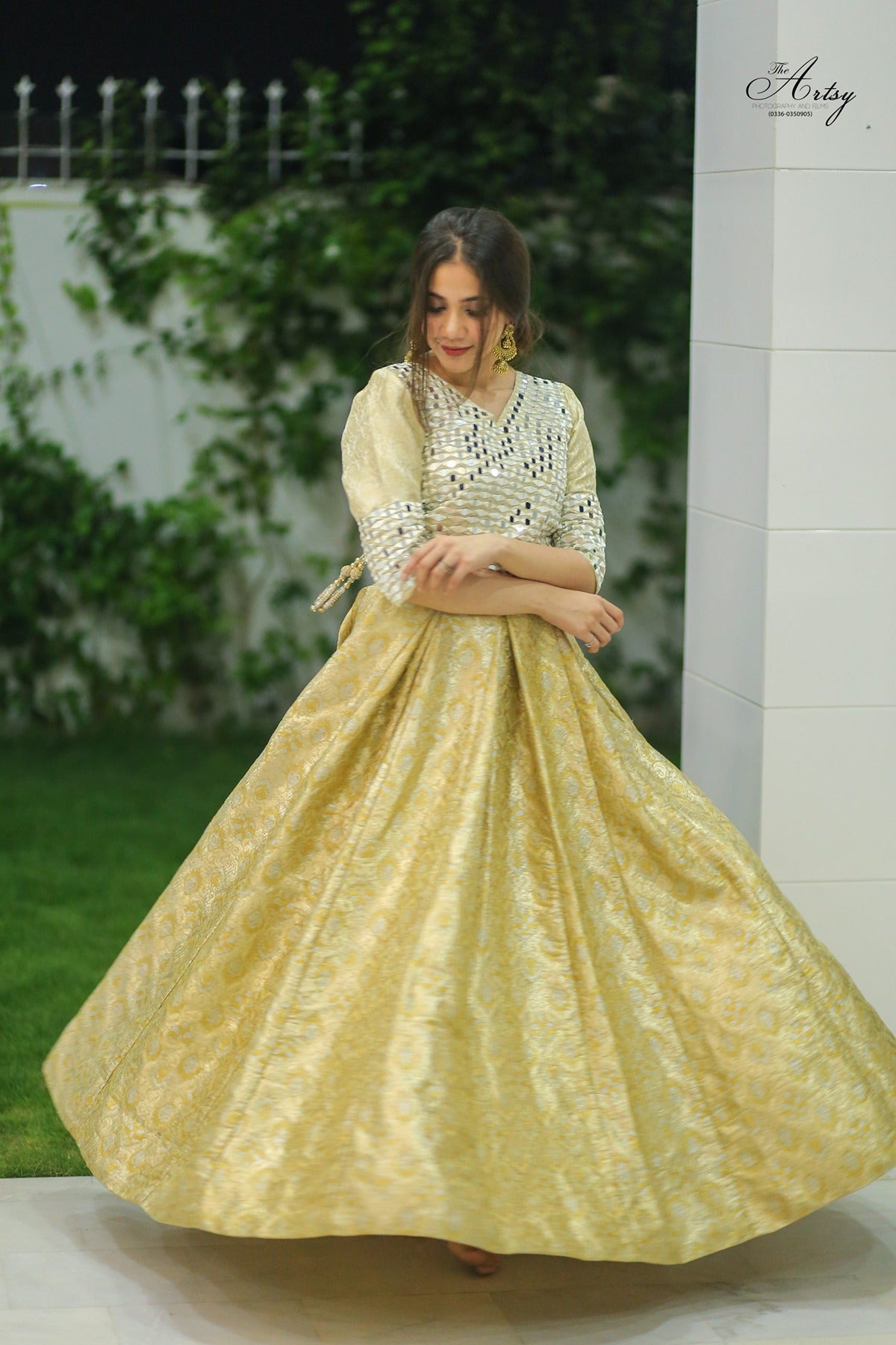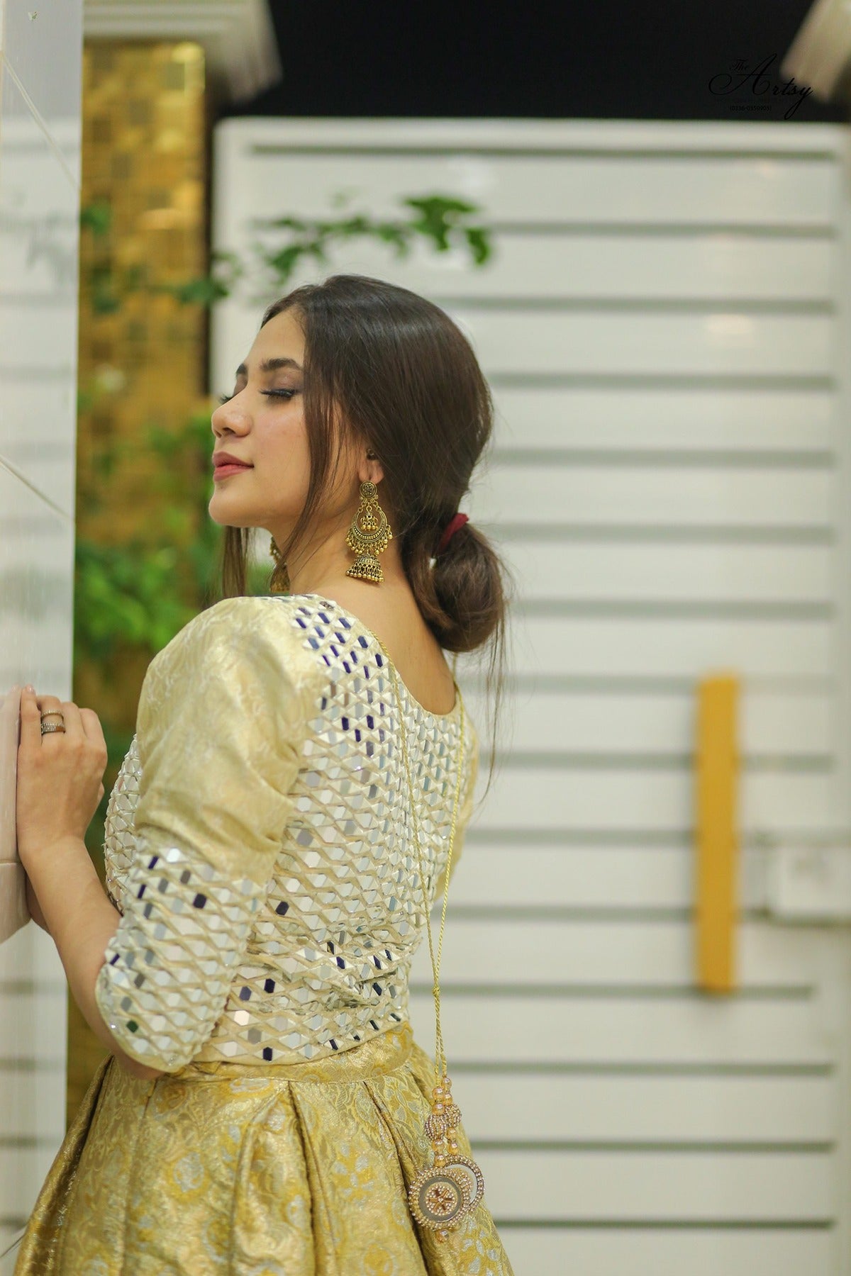 SAAD IBRAHIM | LEHENGA CHOLI | SOLID GOLDEN MIRROR EMBELLISHED LEHENGA CHOLI SET WITH DUPATTA