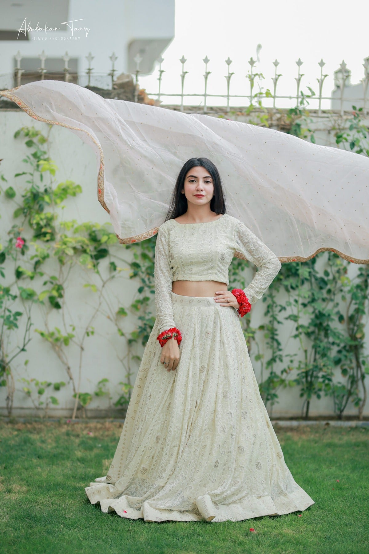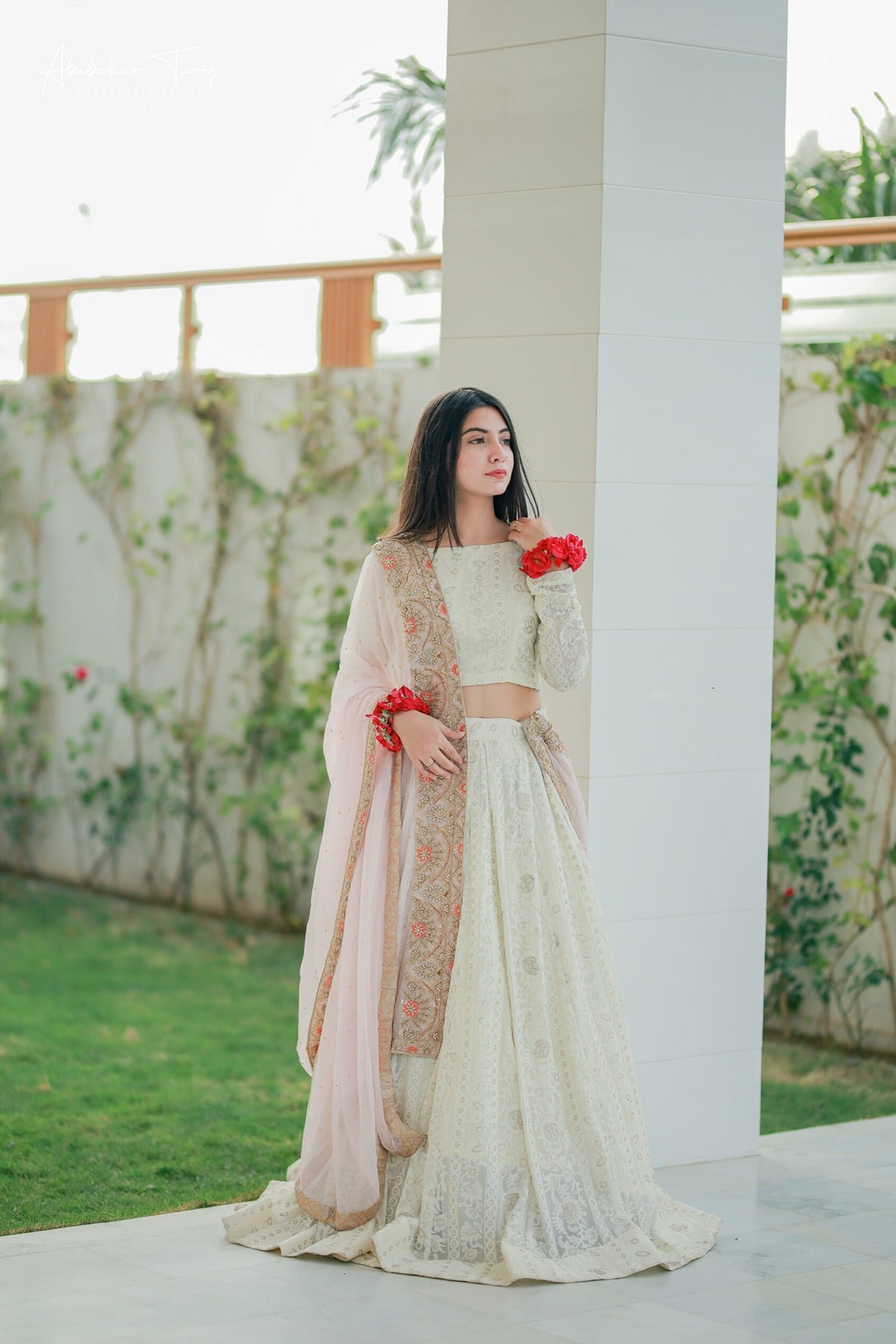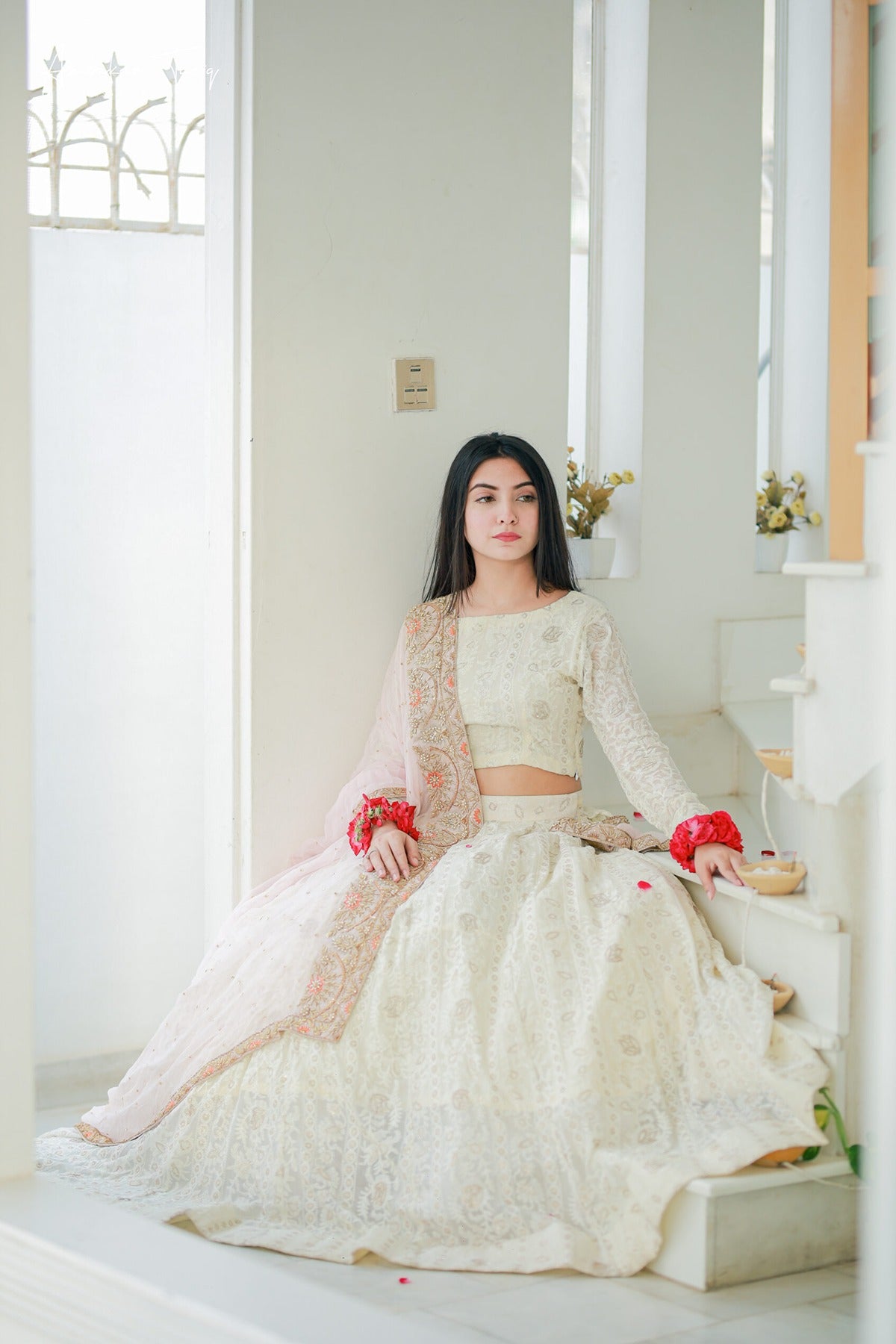 SAAD IBRAHIM | LEHENGA CHOLI | SOLID IVORY CHIKANKARI LONG FLARED LEHENGA CHOLI SET WITH HAND EMBELLISHED DUPATTA