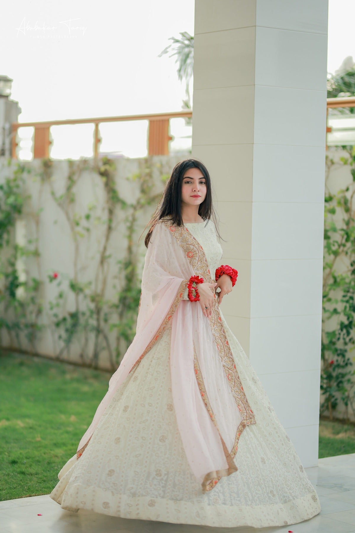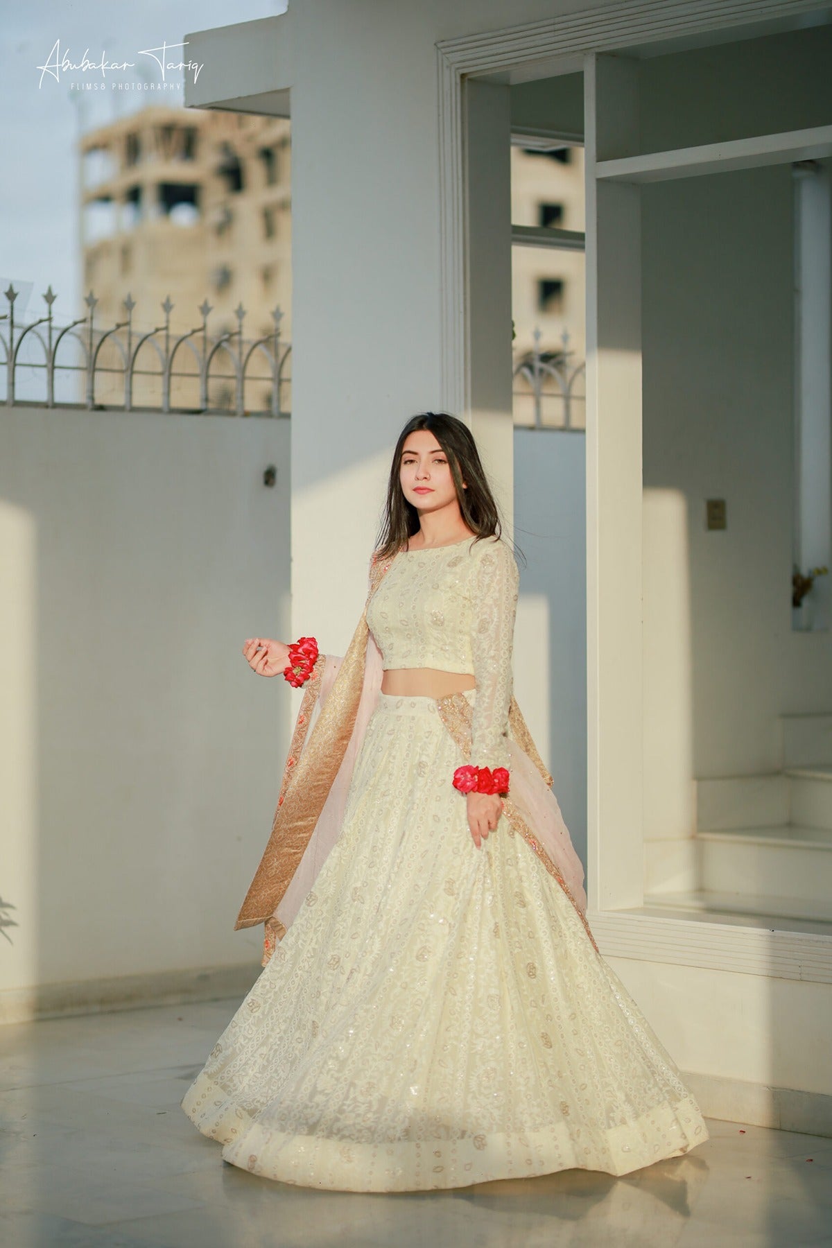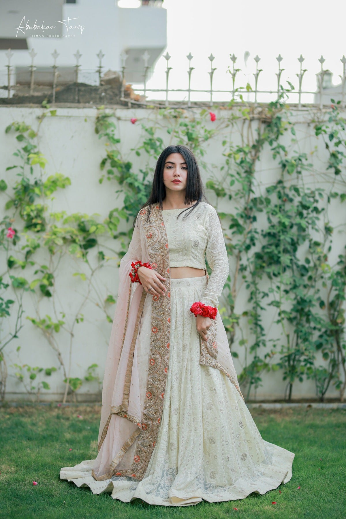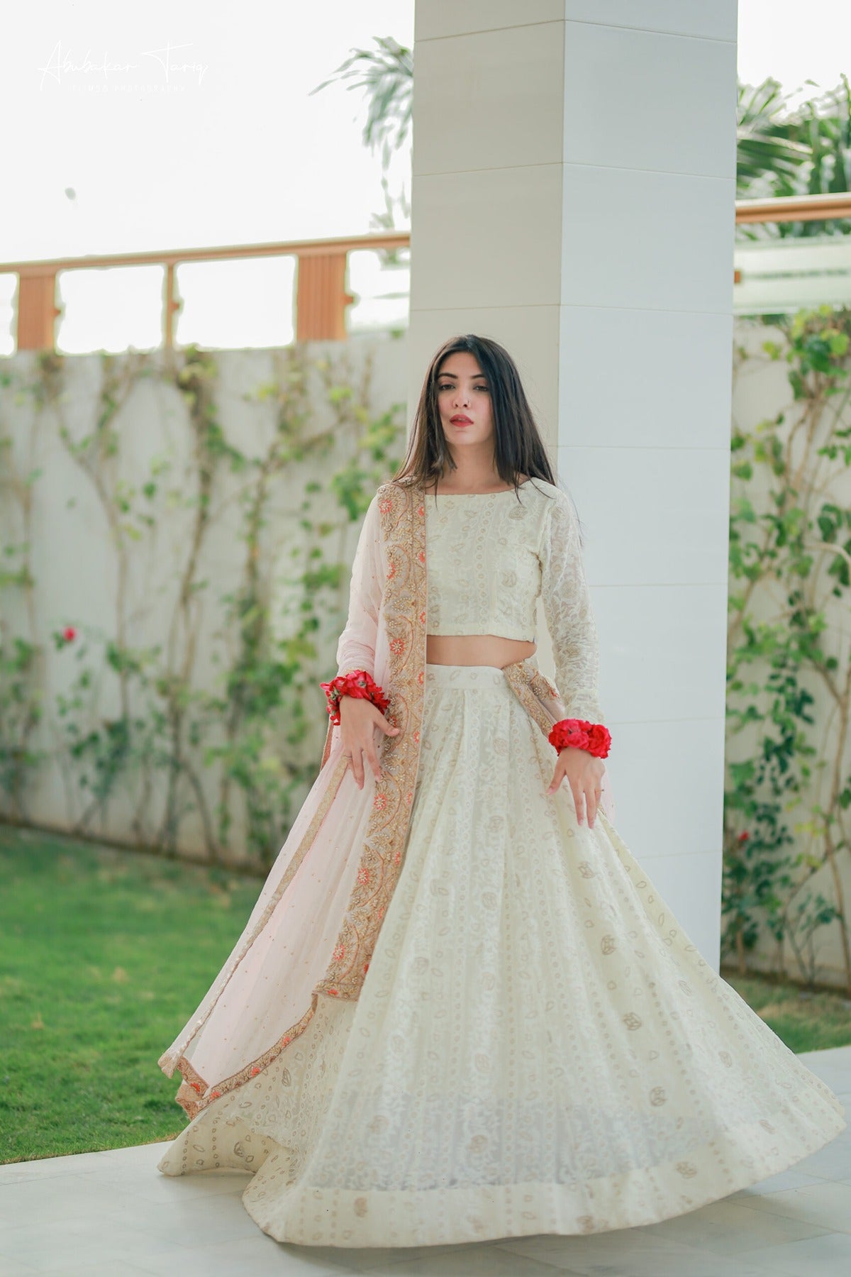 SAAD IBRAHIM | LEHENGA CHOLI | SOLID IVORY CHIKANKARI LONG FLARED LEHENGA CHOLI SET WITH HAND EMBELLISHED DUPATTA