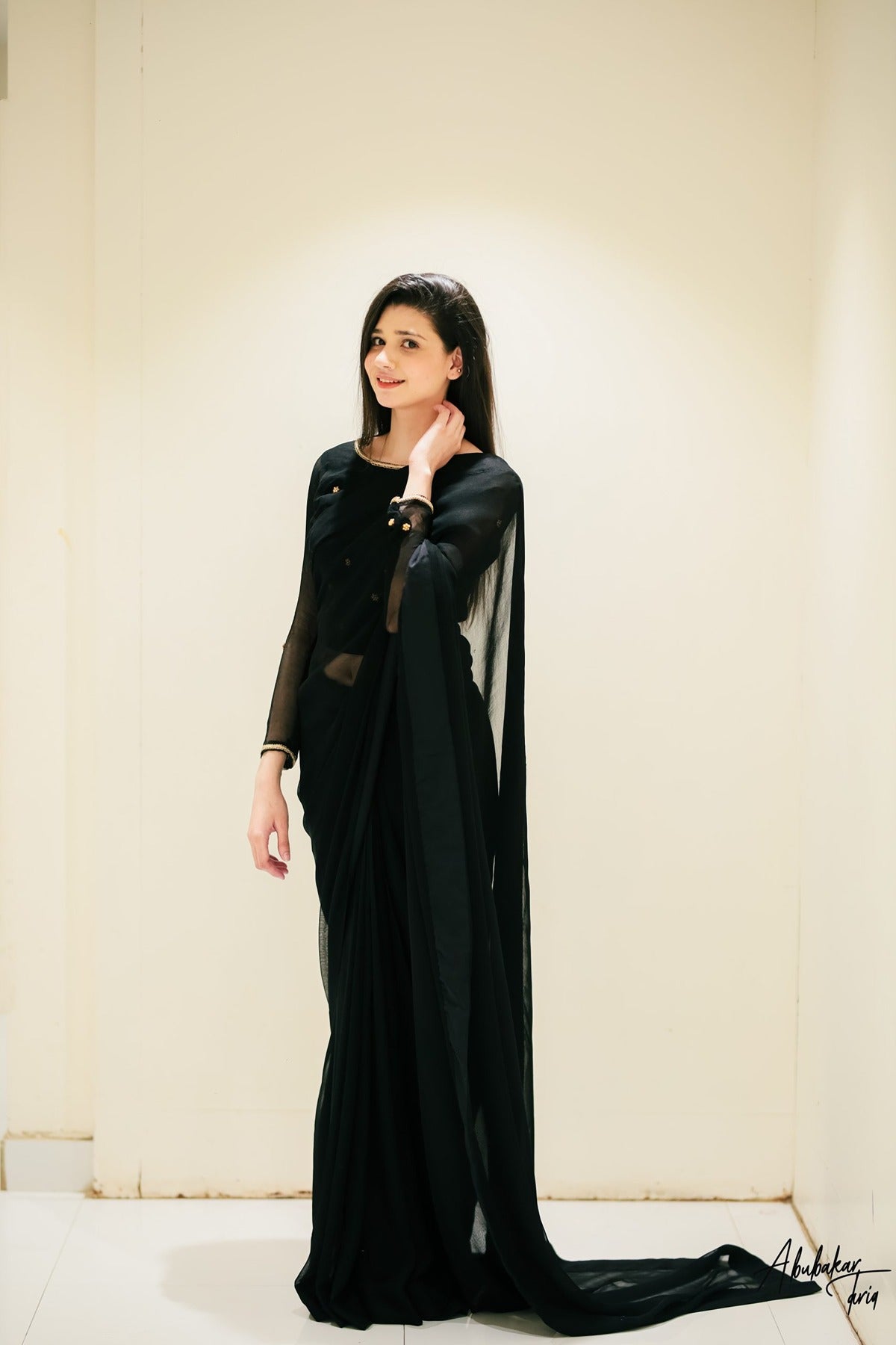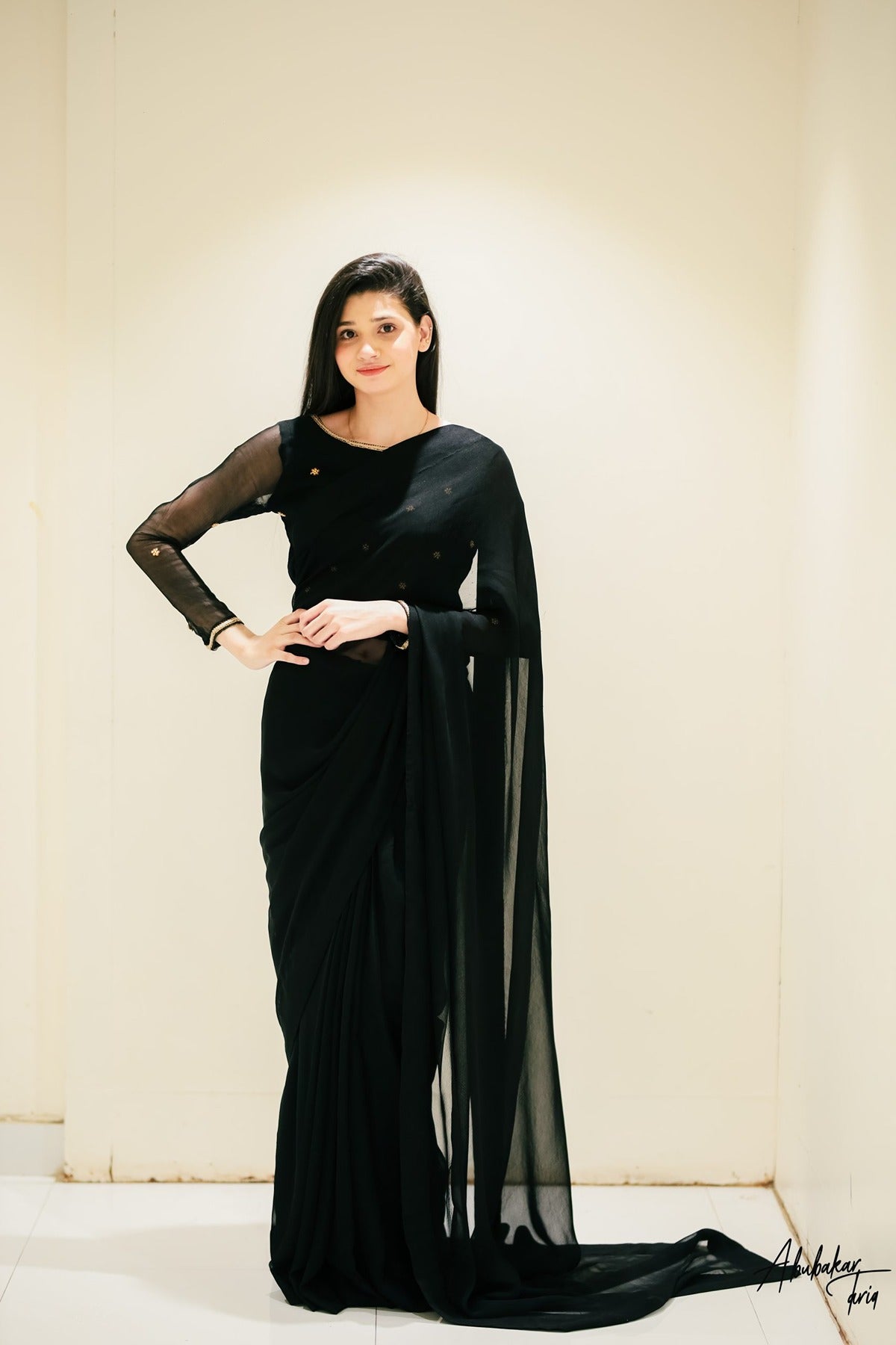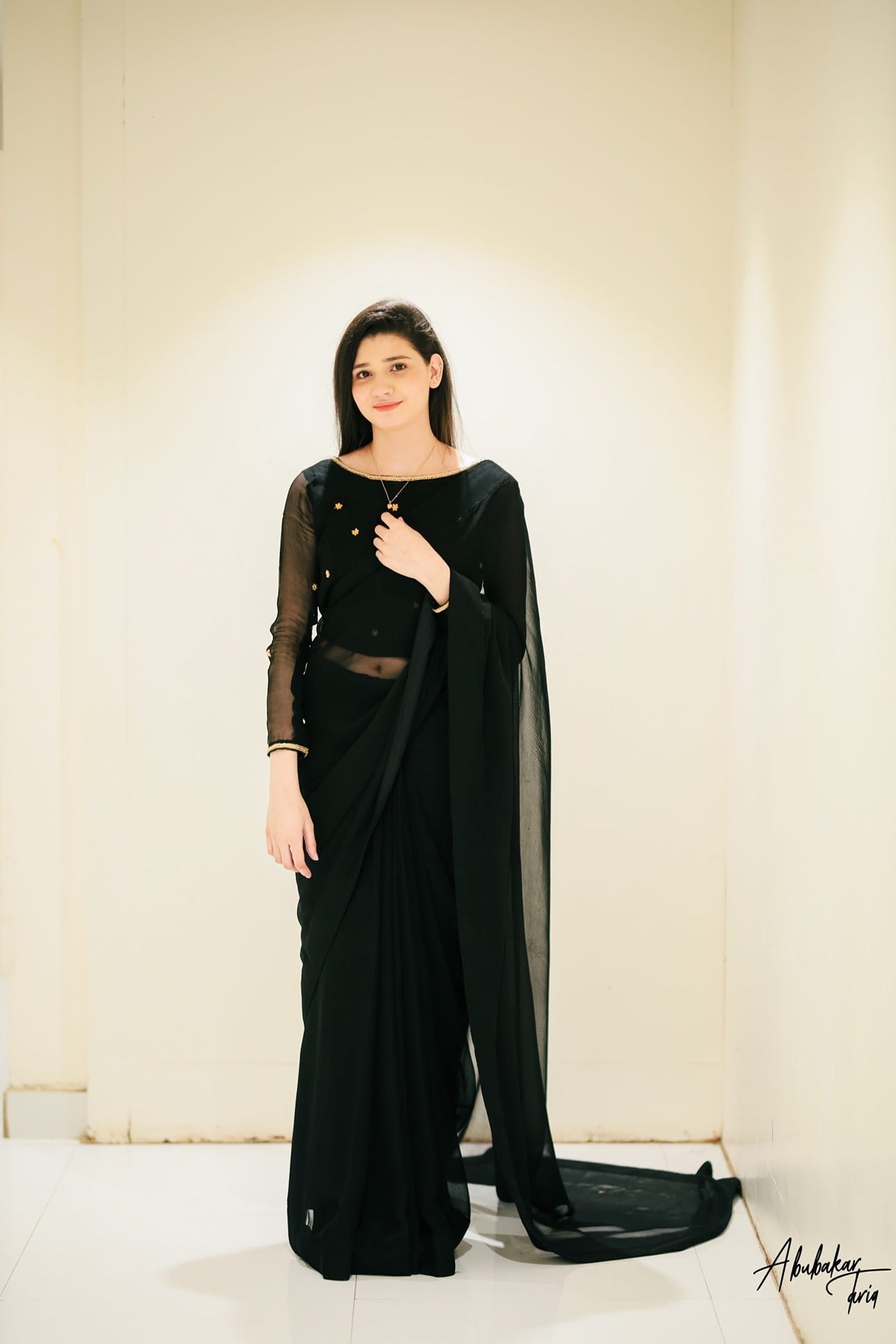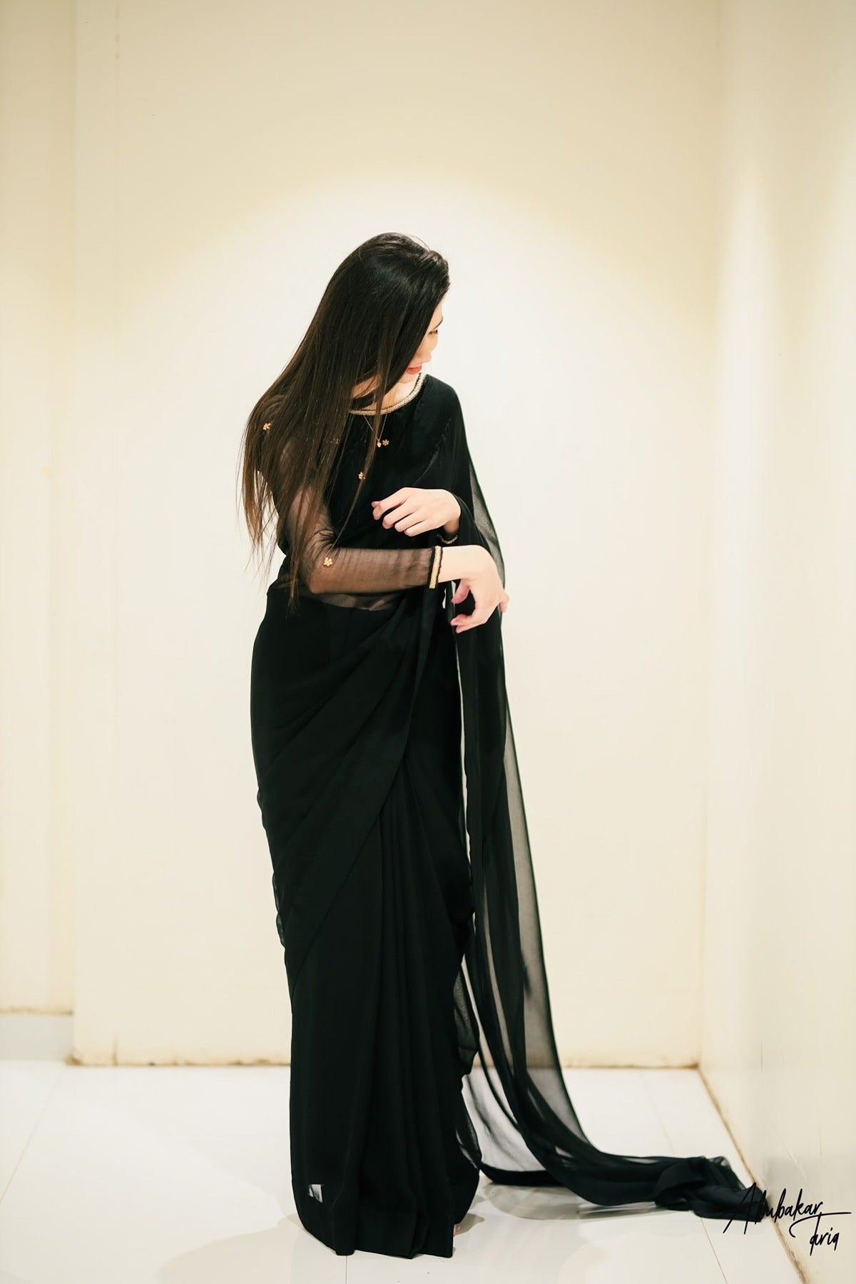 SAAD IBRAHIM | SAREES | SOLID BLACK CHIFFON SAREE WITH HAND EMBELLISHED