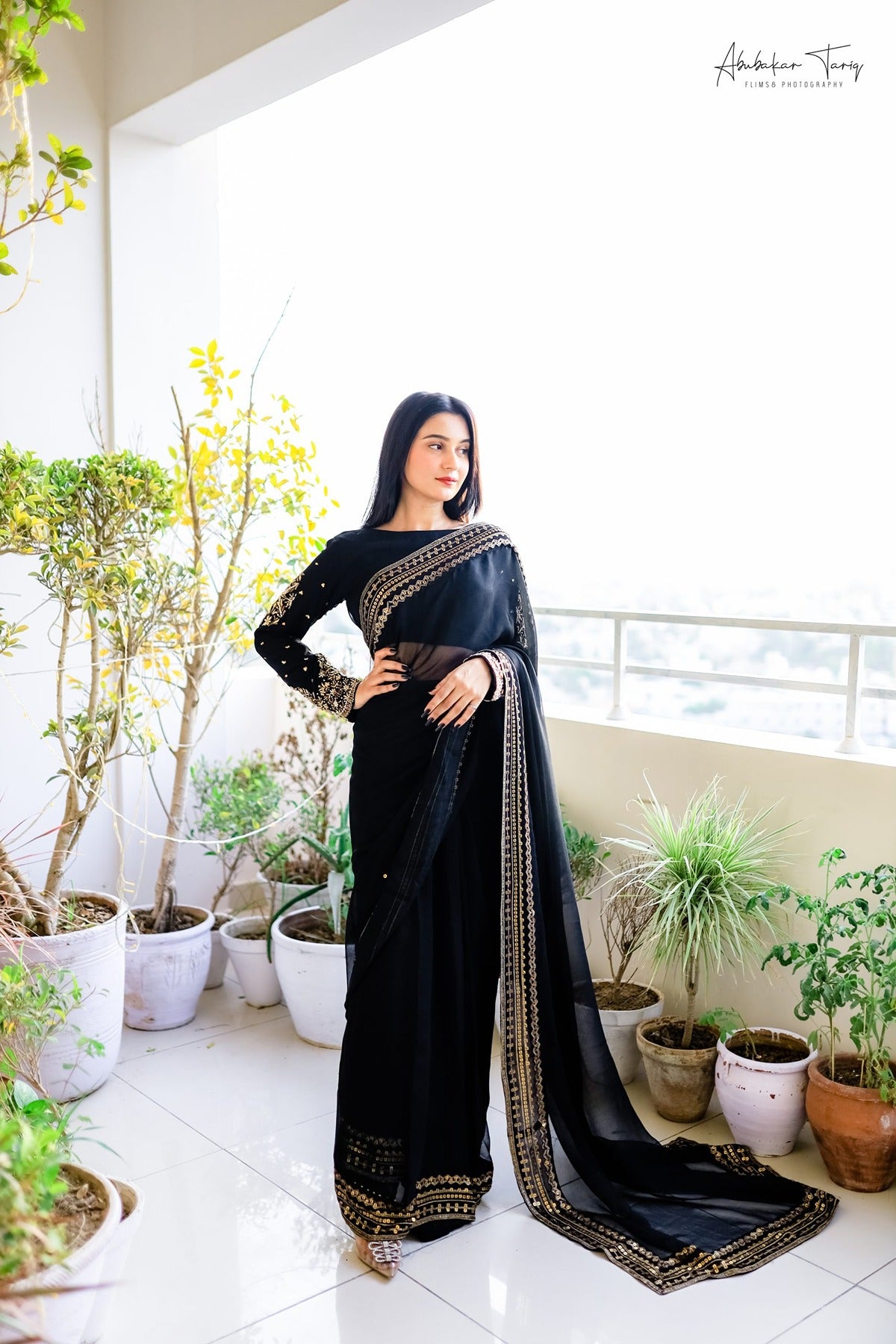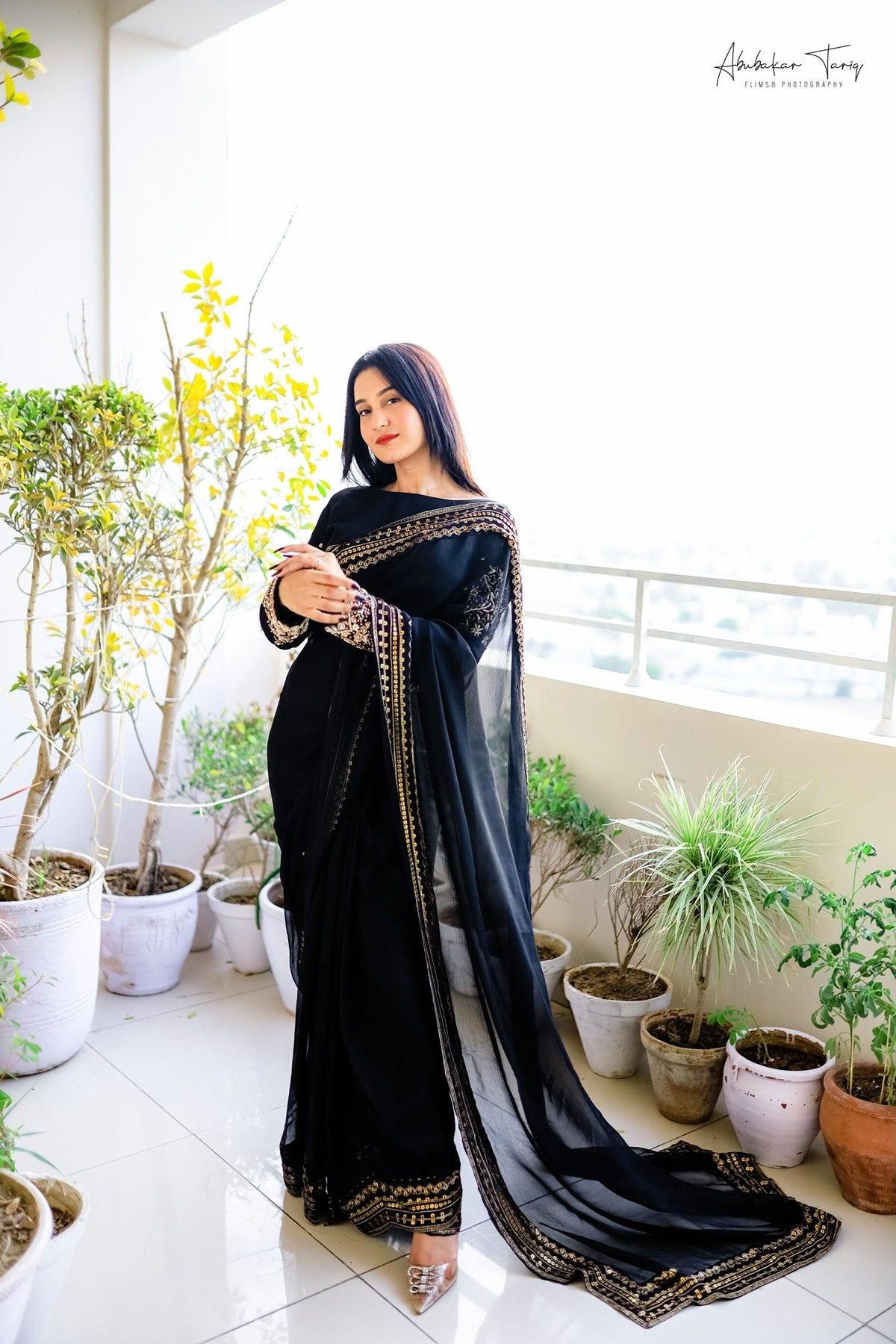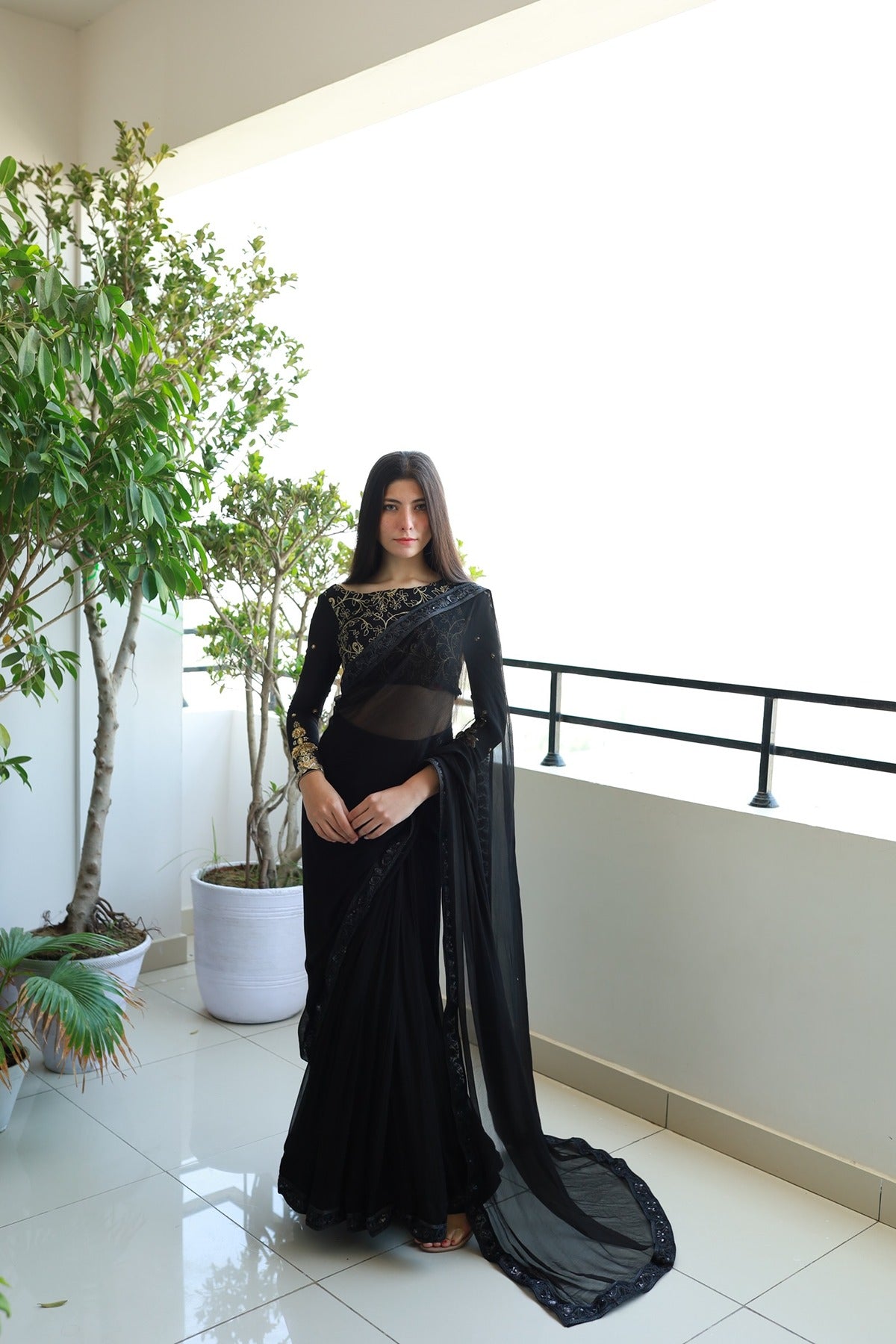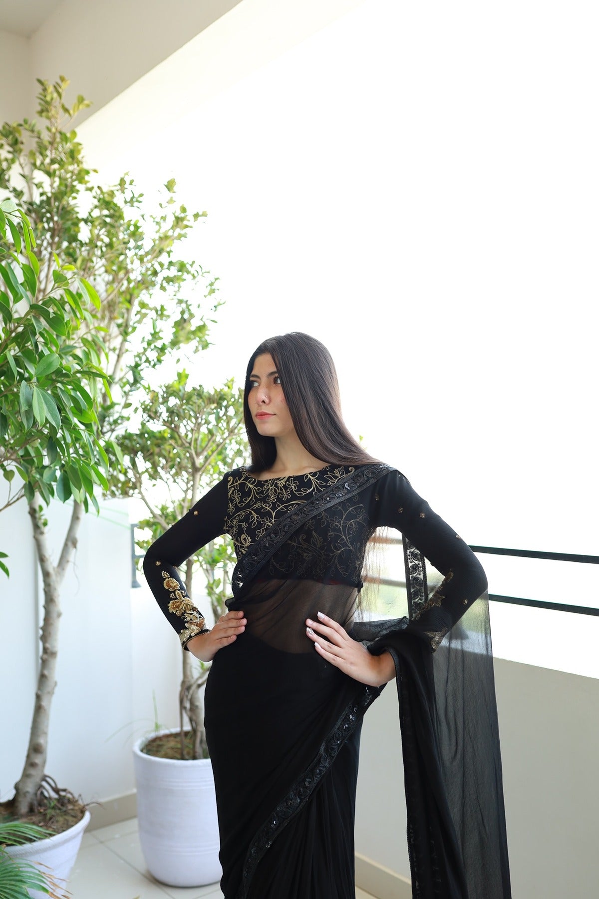 SAAD IBRAHIM | SAREES | SOLID BLACK HAND EMBELLISHED SAREE