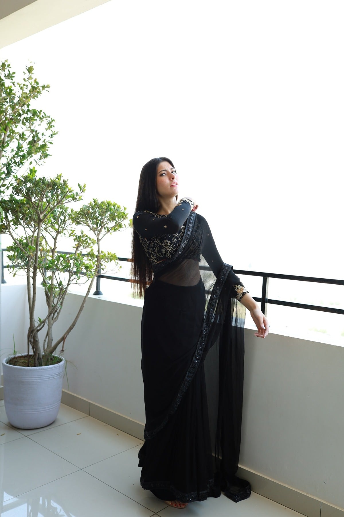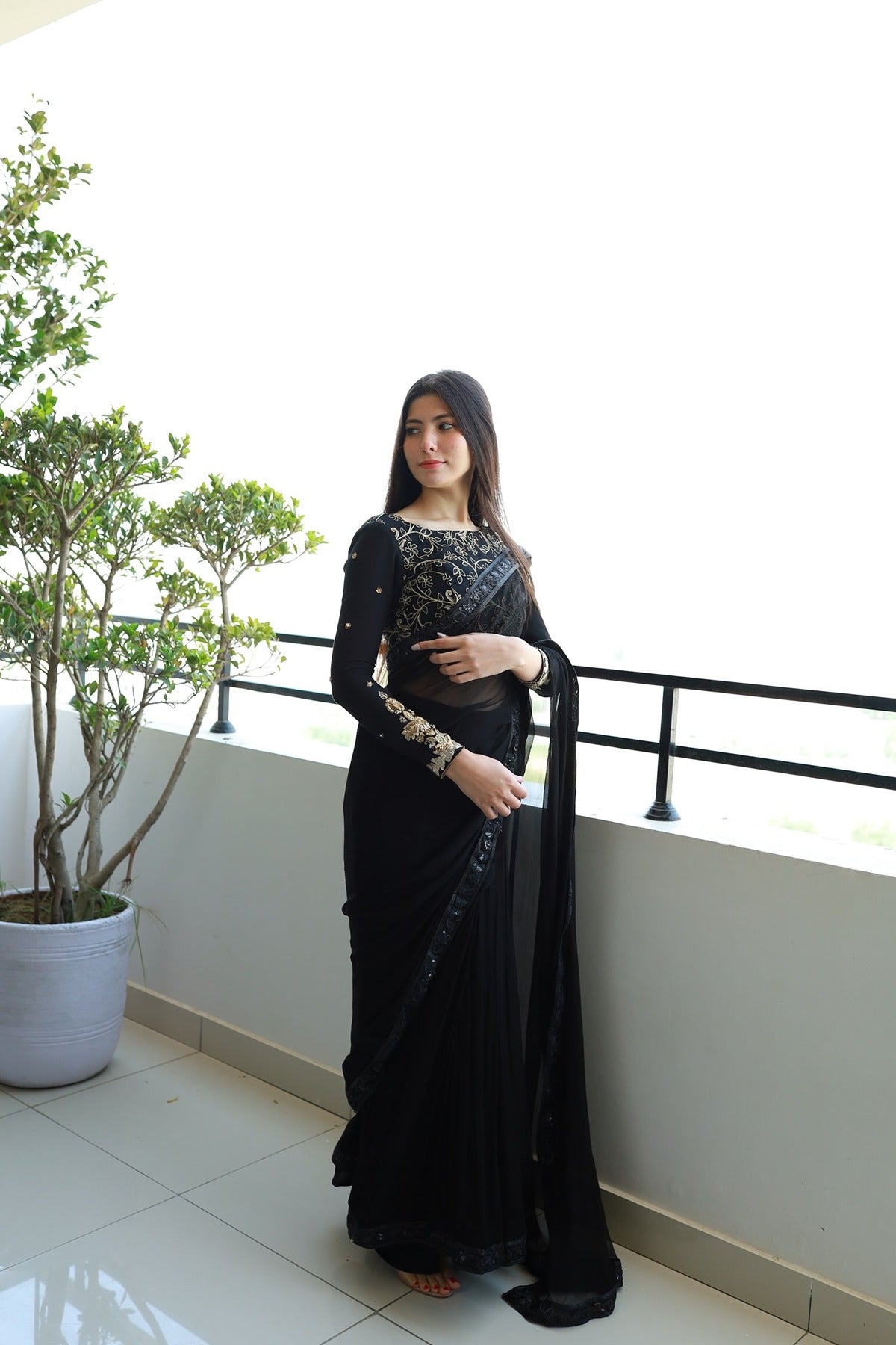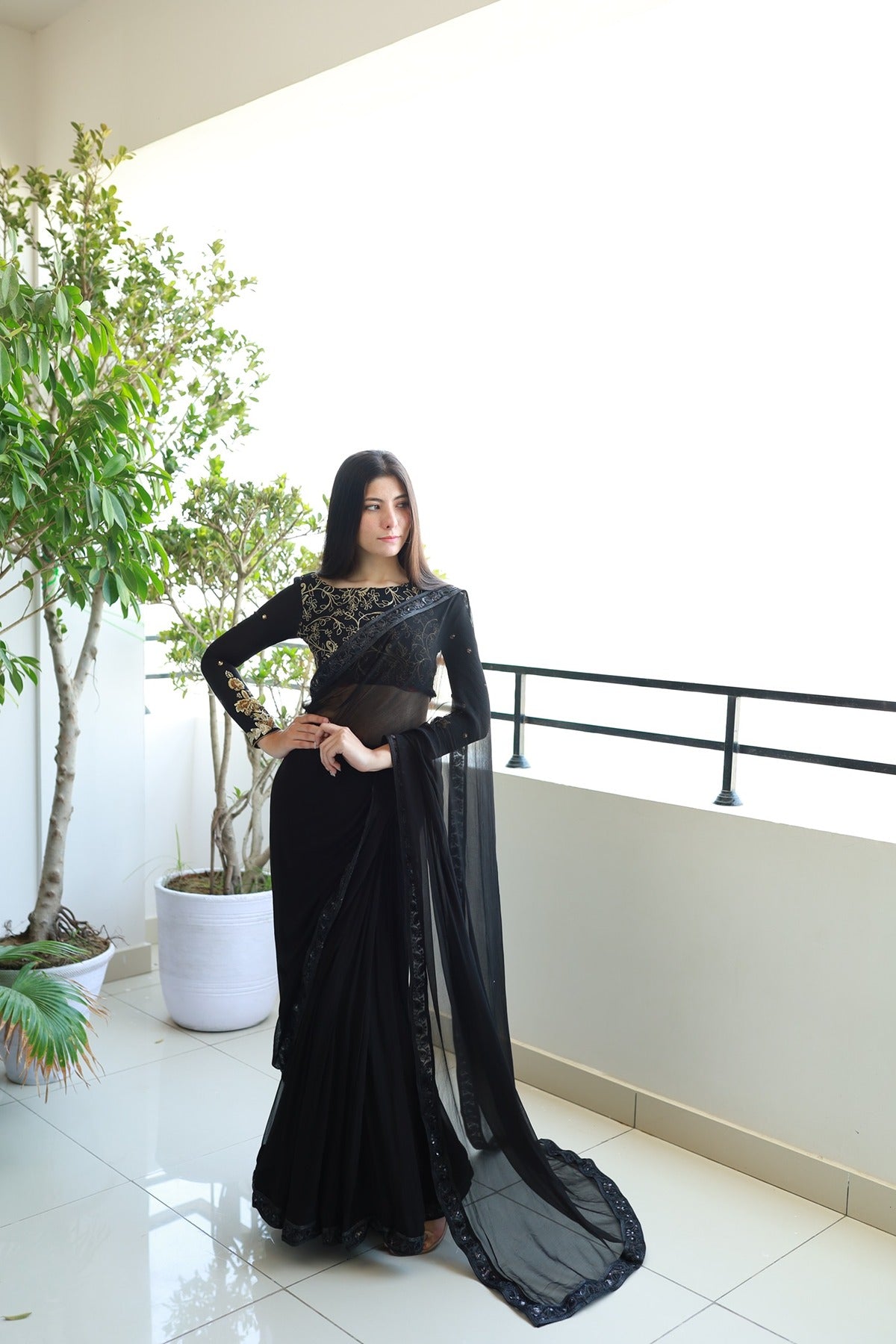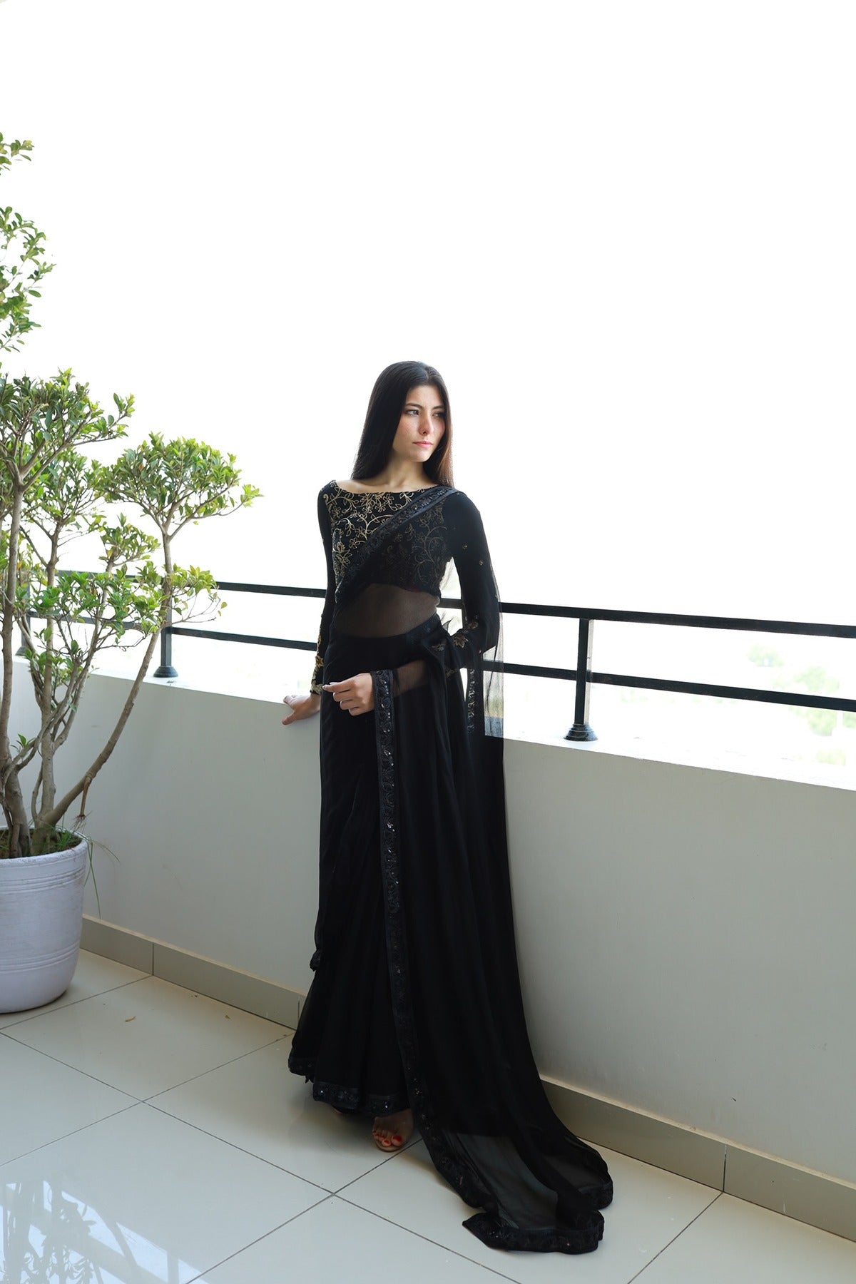 SAAD IBRAHIM | SAREES | SOLID BLACK HAND EMBELLISHED SAREE