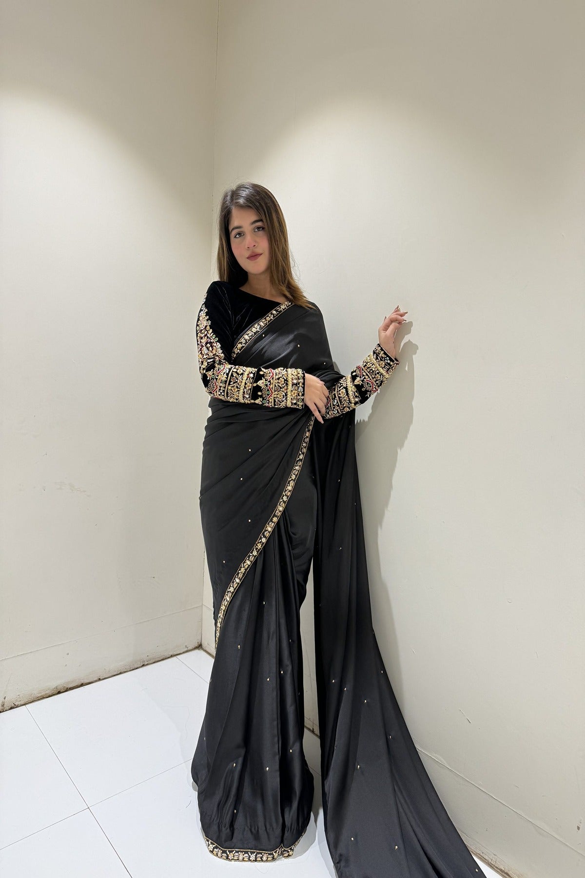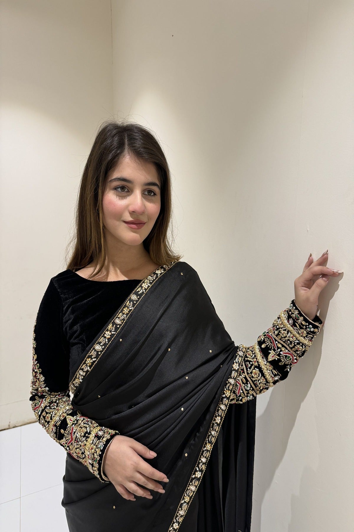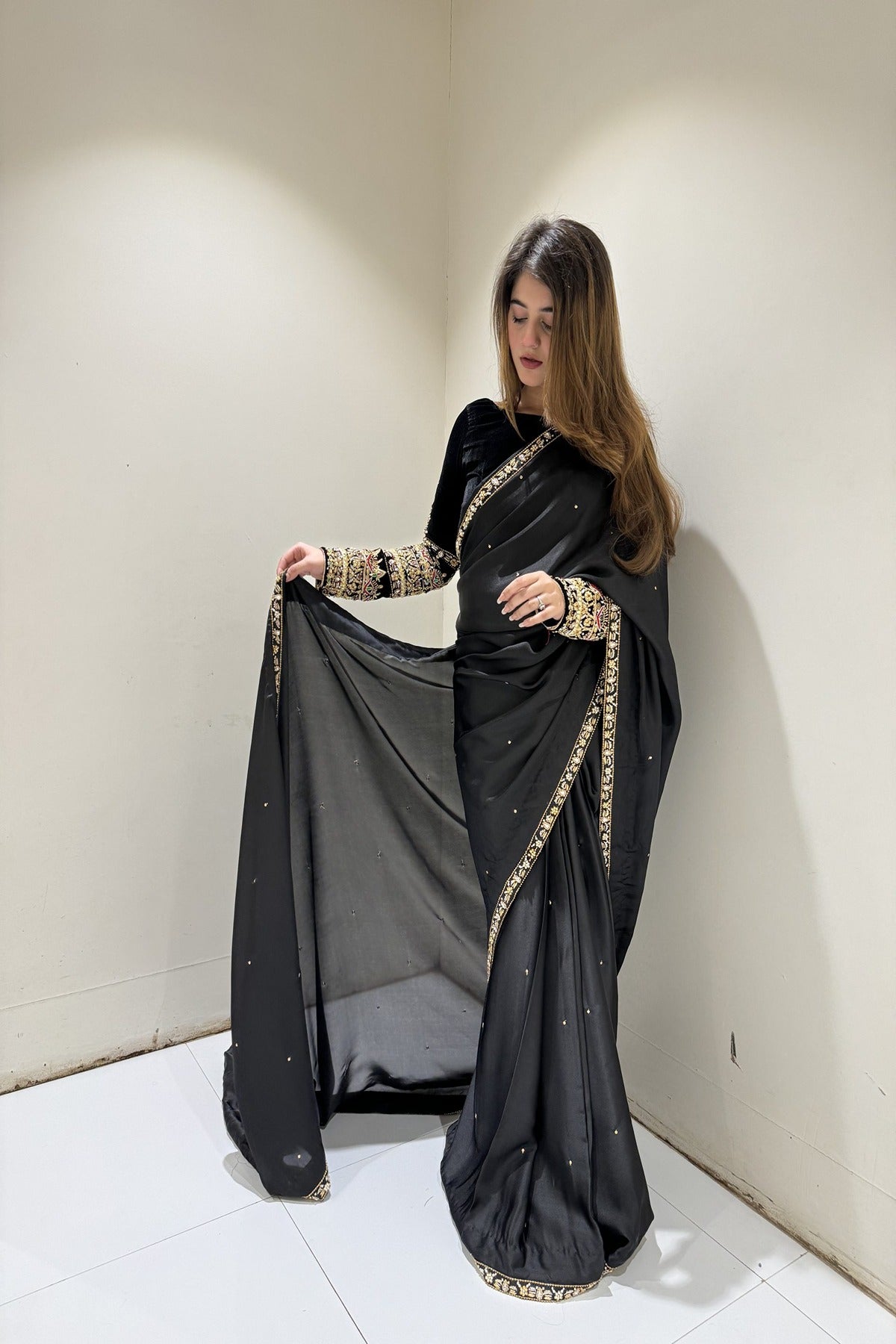 SAAD IBRAHIM | SAREES | SOLID BLACK HAND EMBELLISHED SAREE WITH VELVET BLOUSE