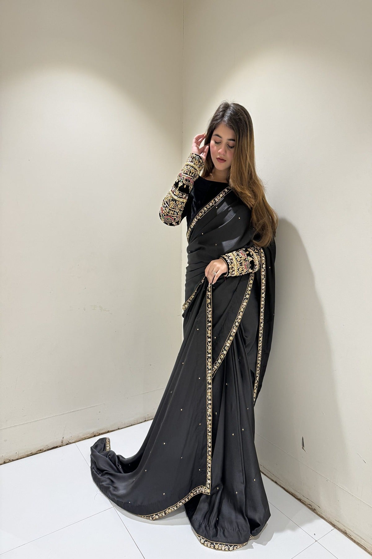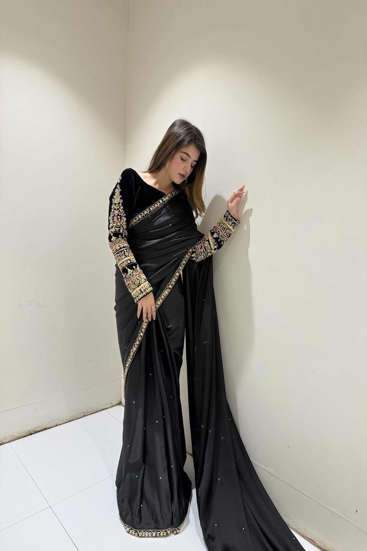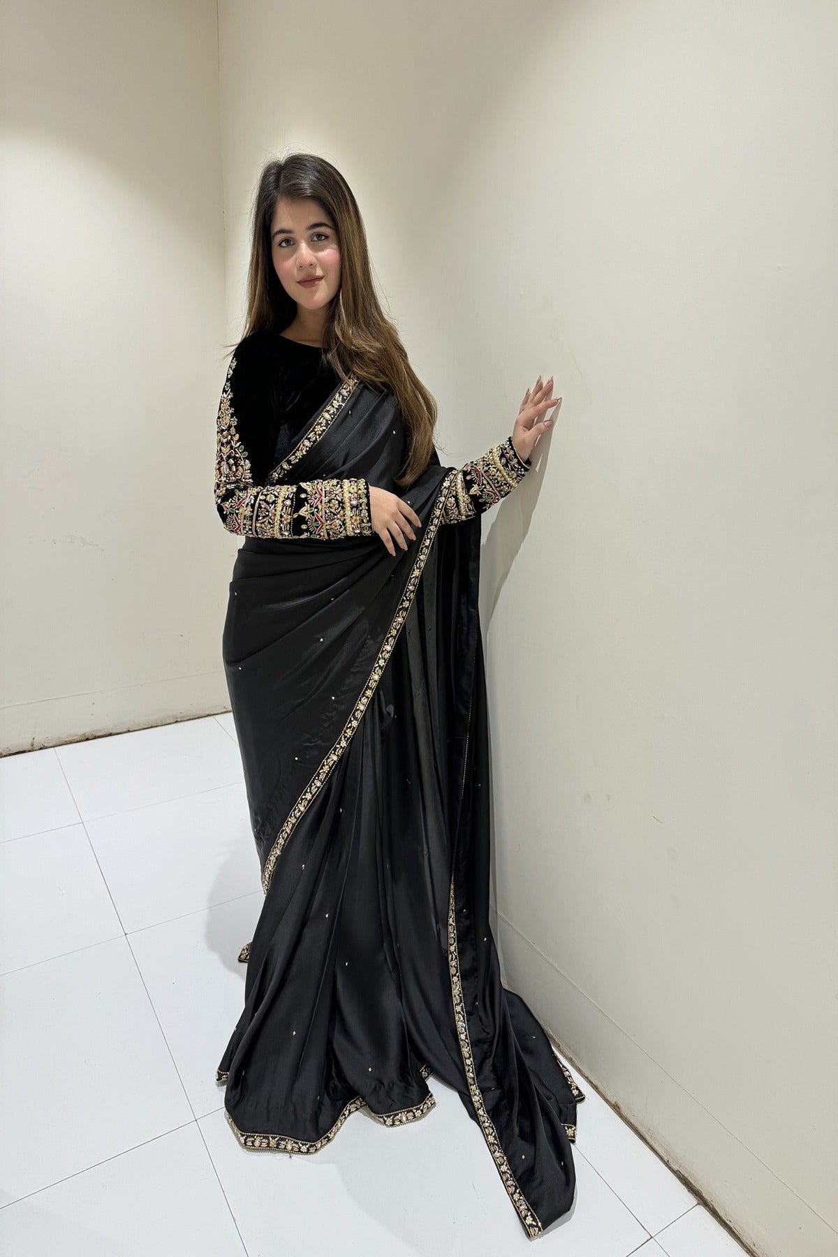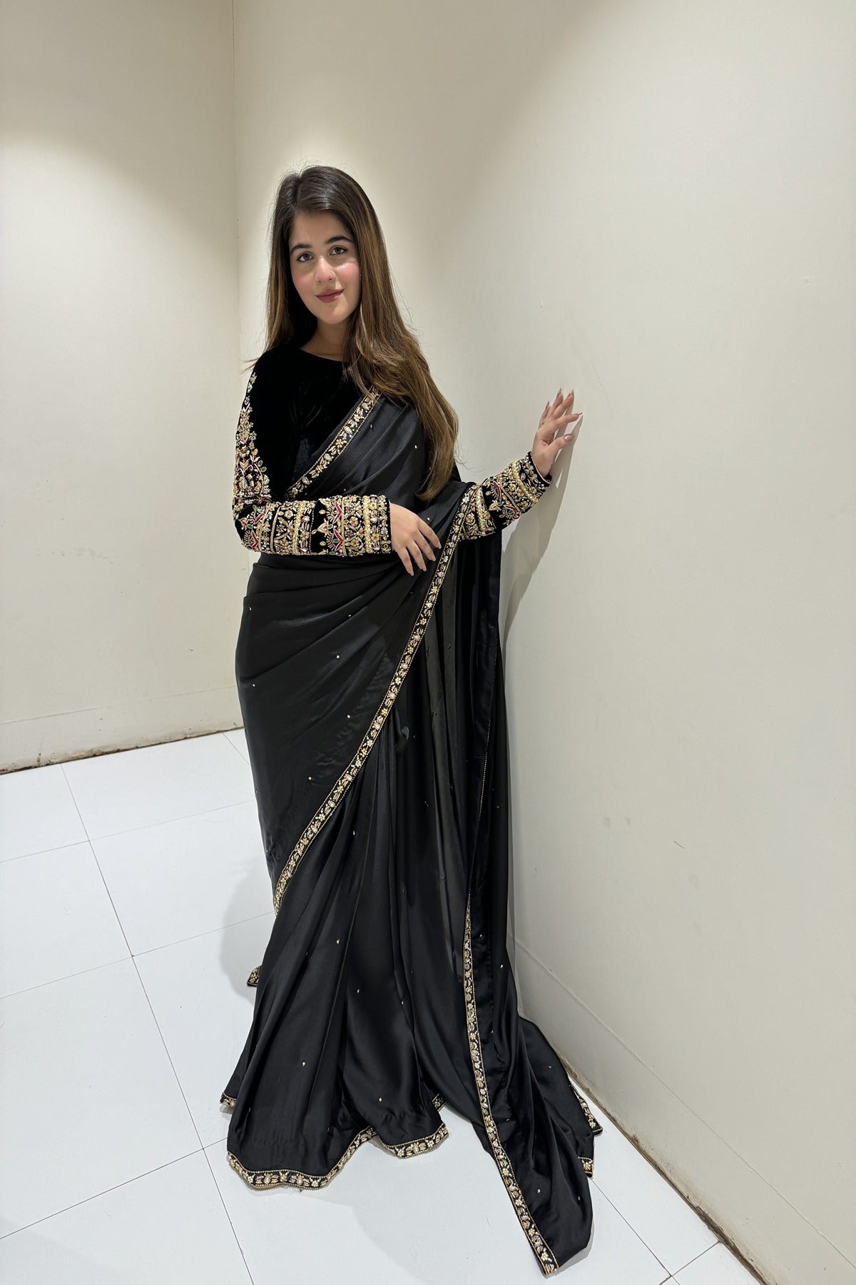 SAAD IBRAHIM | SAREES | SOLID BLACK HAND EMBELLISHED SAREE WITH VELVET BLOUSE