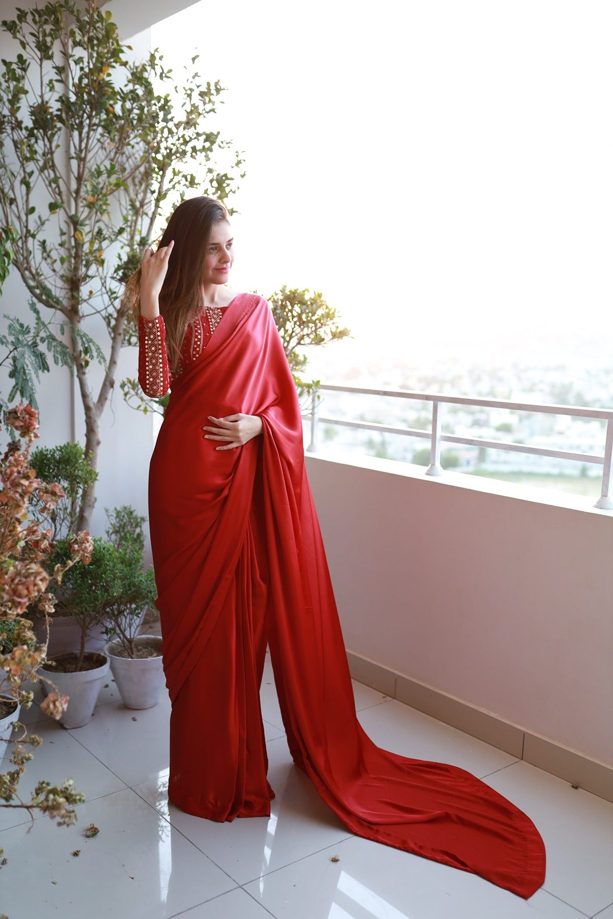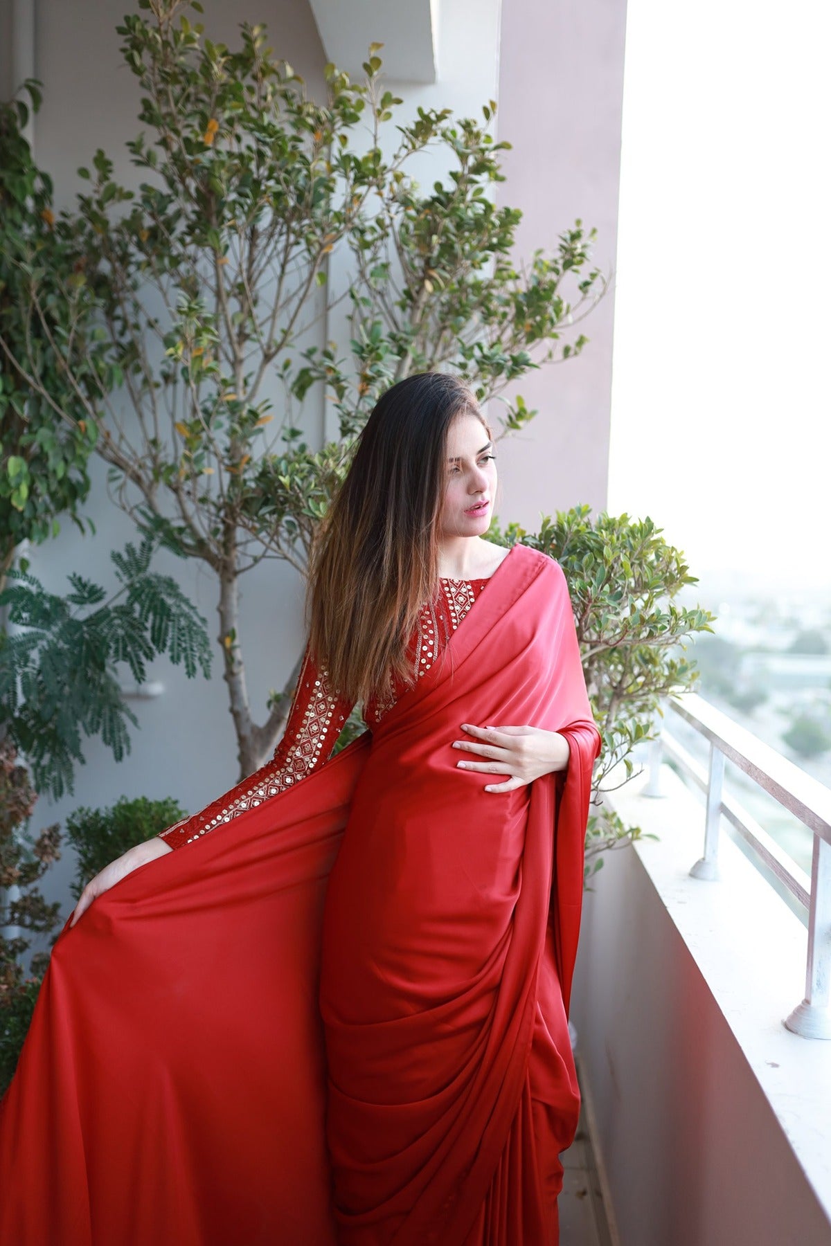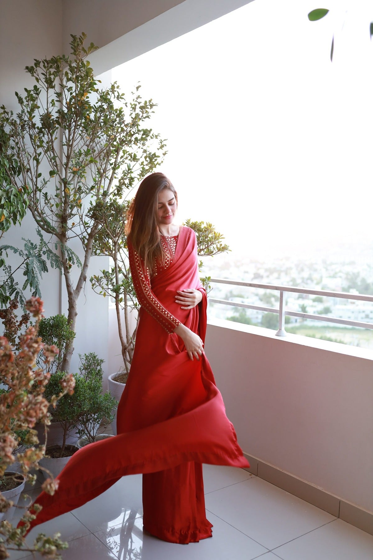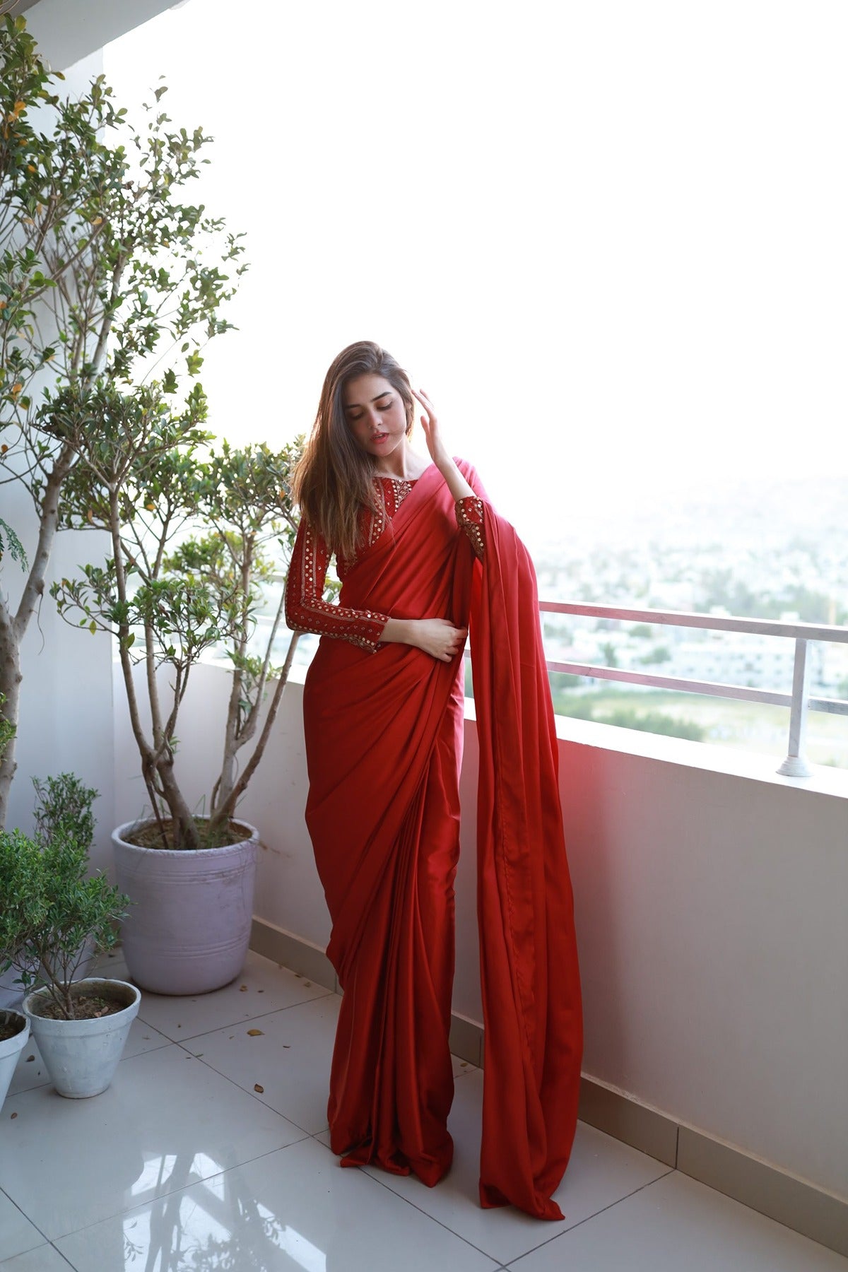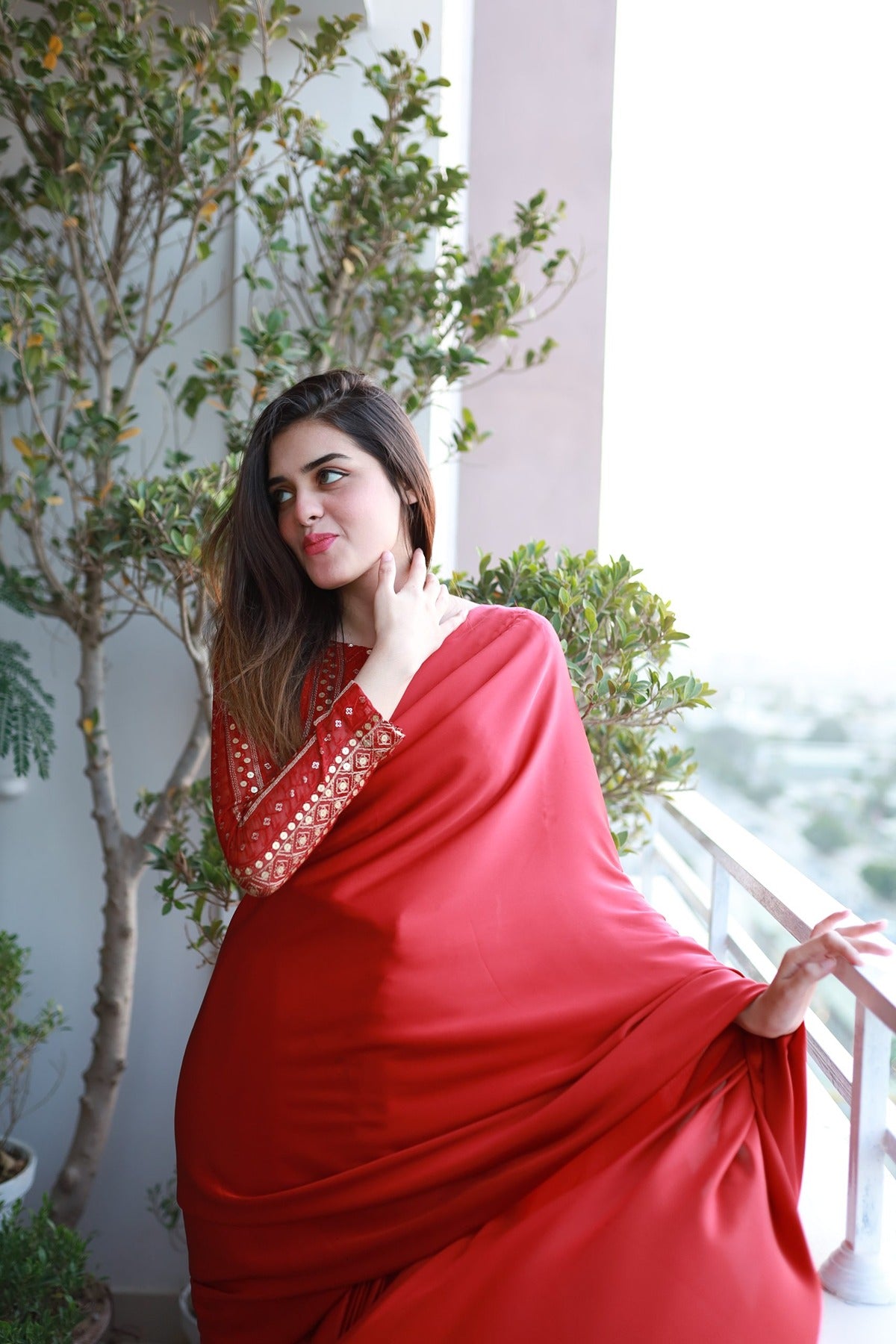 SAAD IBRAHIM | SAREES | SOLID RED SILK SAREE WITH CHIKANKARI BLOUSE