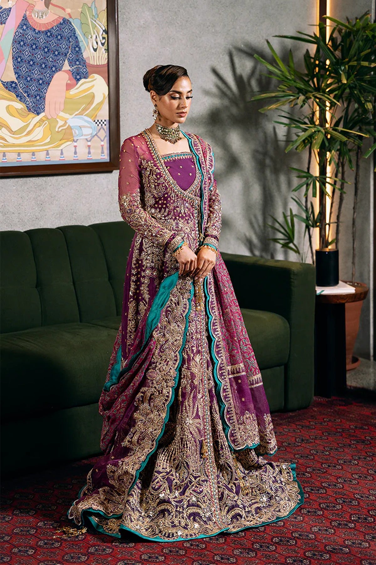 Lavena - This exquisite purple ensemble is a vision of grace, adorned with golden embroidery, shimmering sequins, and delicate embellishments that breathe life into a breathtaking angrakha crafted on fine organza. The intricately embroidered sleeves glisten with sequins, adding a refined touch, while each panel’s matching detail flows in perfect harmony, creating a balanced and graceful silhouette. A luxurious silk dupatta, screen-printed and framed in delicate sequins and embroidery, completes this masterpiece, casting an opulent, enchanting aura—making it a perfect choice for the most special of occasions.
