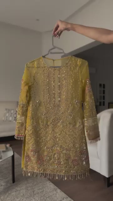 Introducing ‘Sera’ - A timeless blend of elegance and vibrancy, Sera is crafted for the woman who shines. This stunning ensemble features a luminous yellow shirt on sheer organza, adorned with delicate embroidery that dances across the fabric with every move. Paired with a graceful gharara, Sera embodies a harmonious mix of tradition and modernity. The outfit is completed with a screen-printed dupatta, adding a touch of intricate charm that elevates the look further.