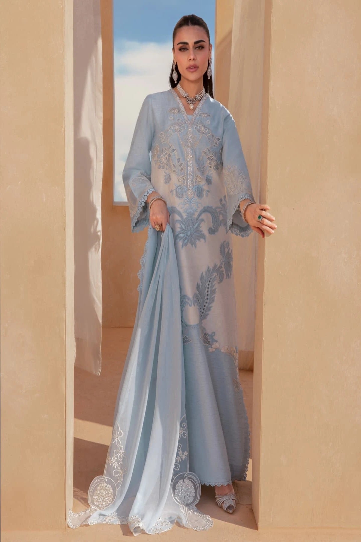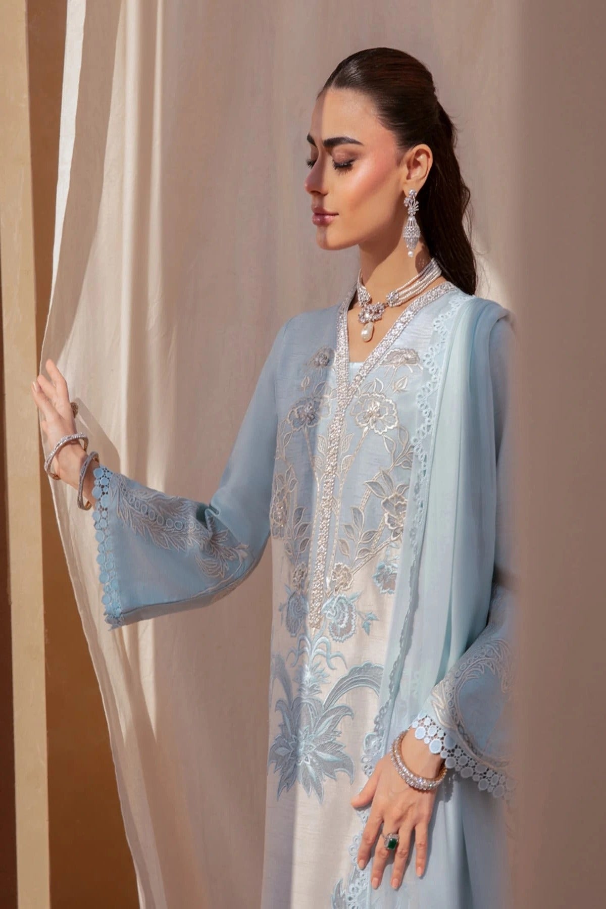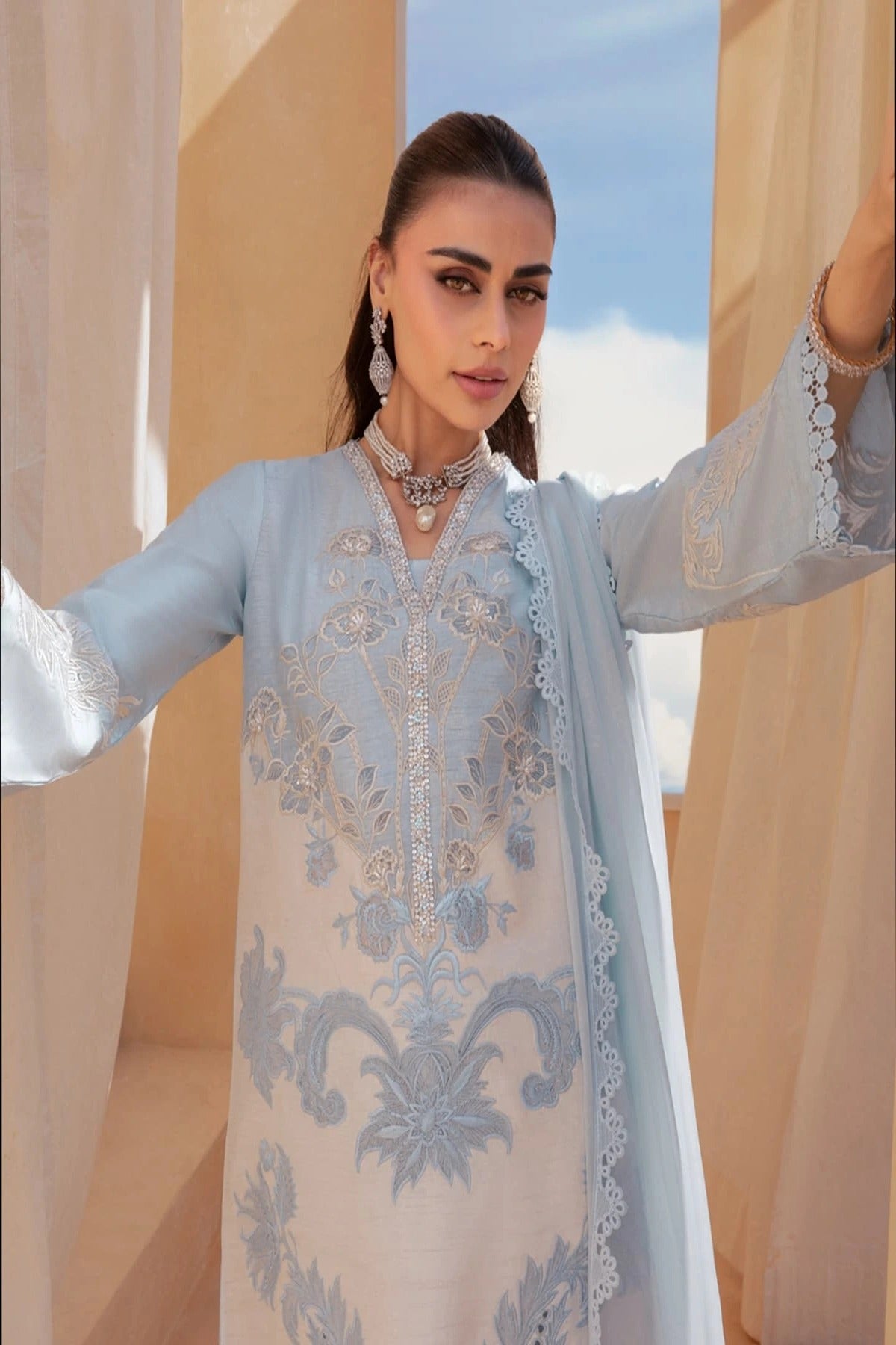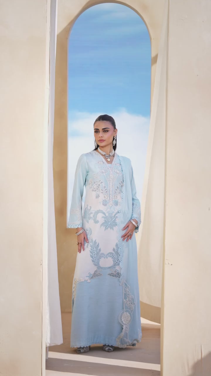 A serene artwork of craftsmanship in soothing blue hues which is meticulously created with subtle details and expound stitches. For this season,elevate your aesthetic game with an ensemble that epitomizes opulence and class.