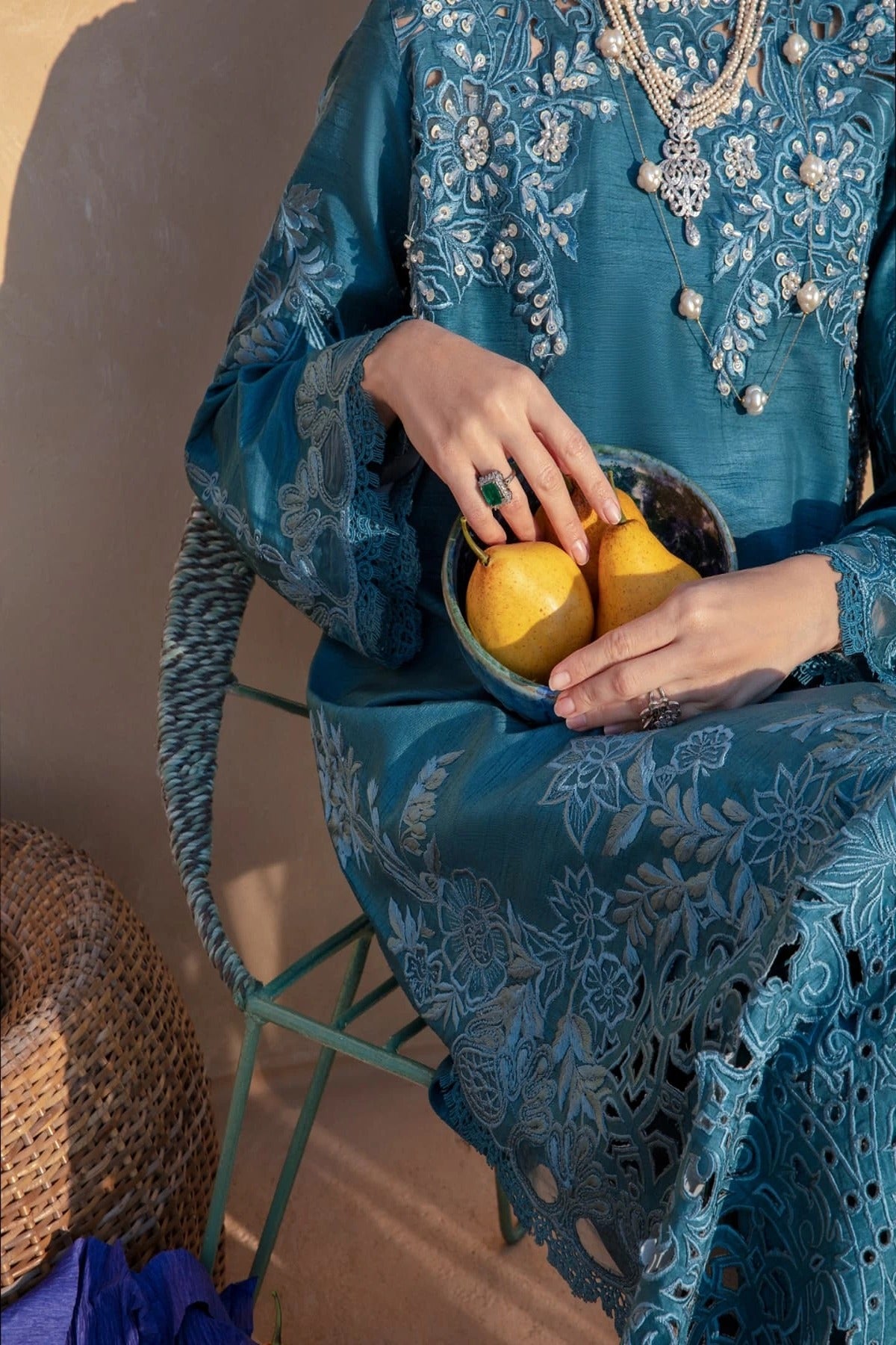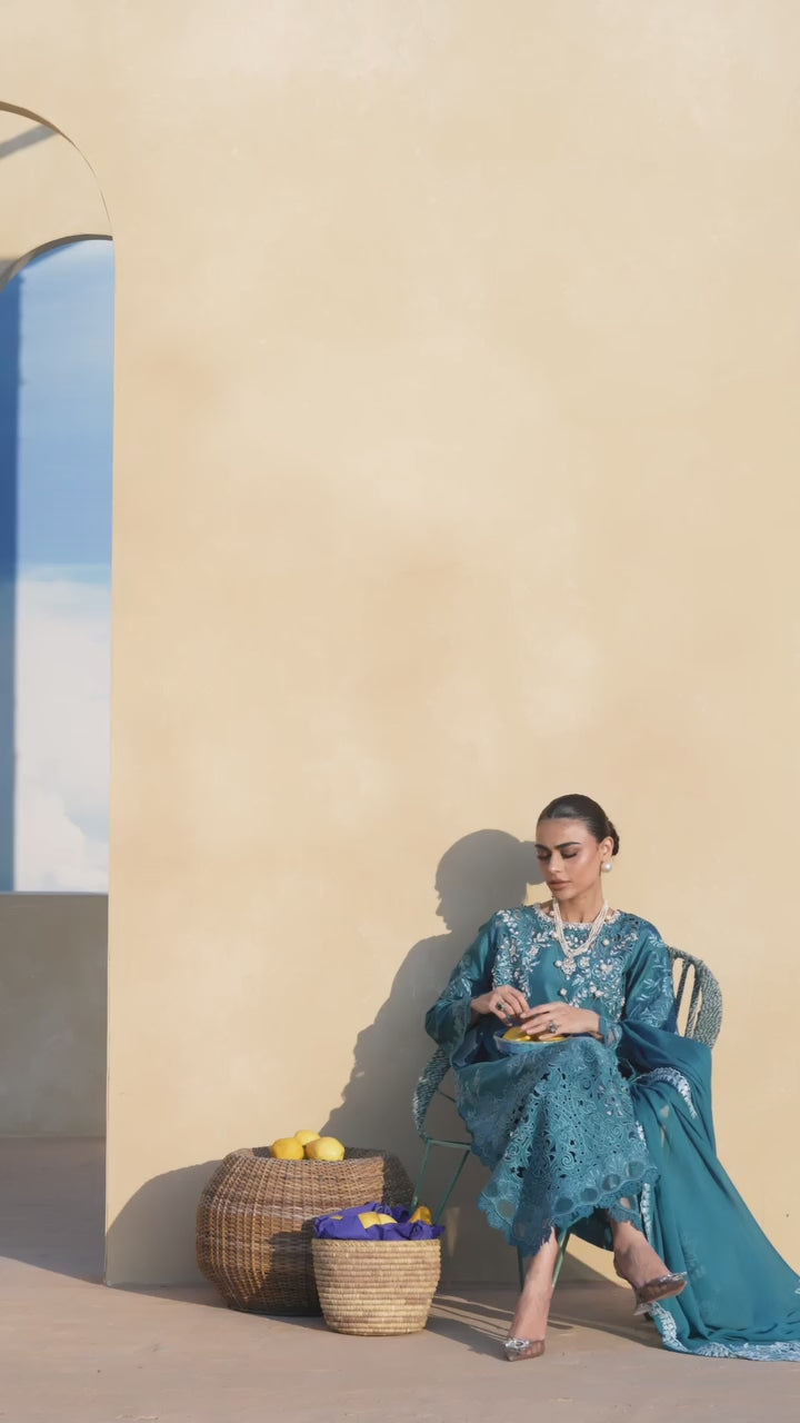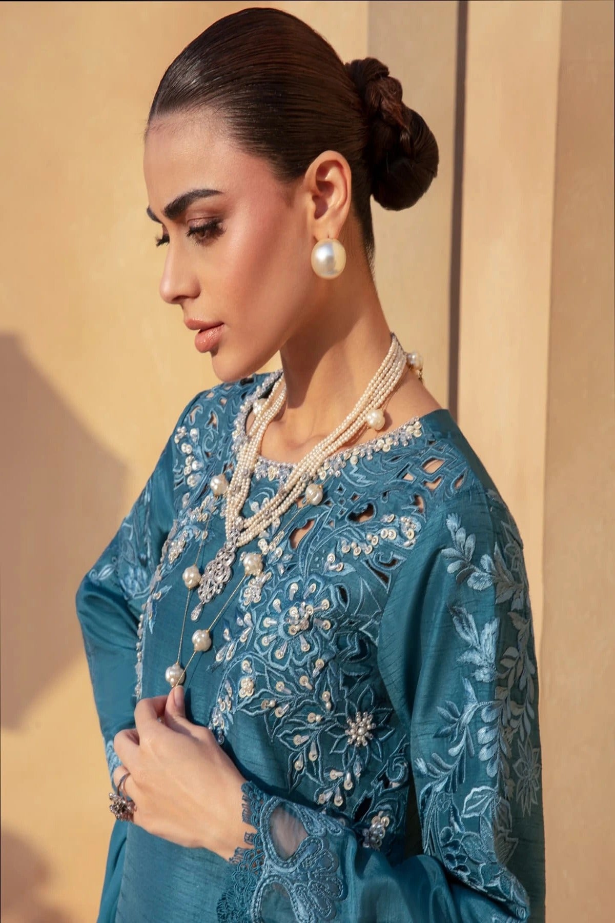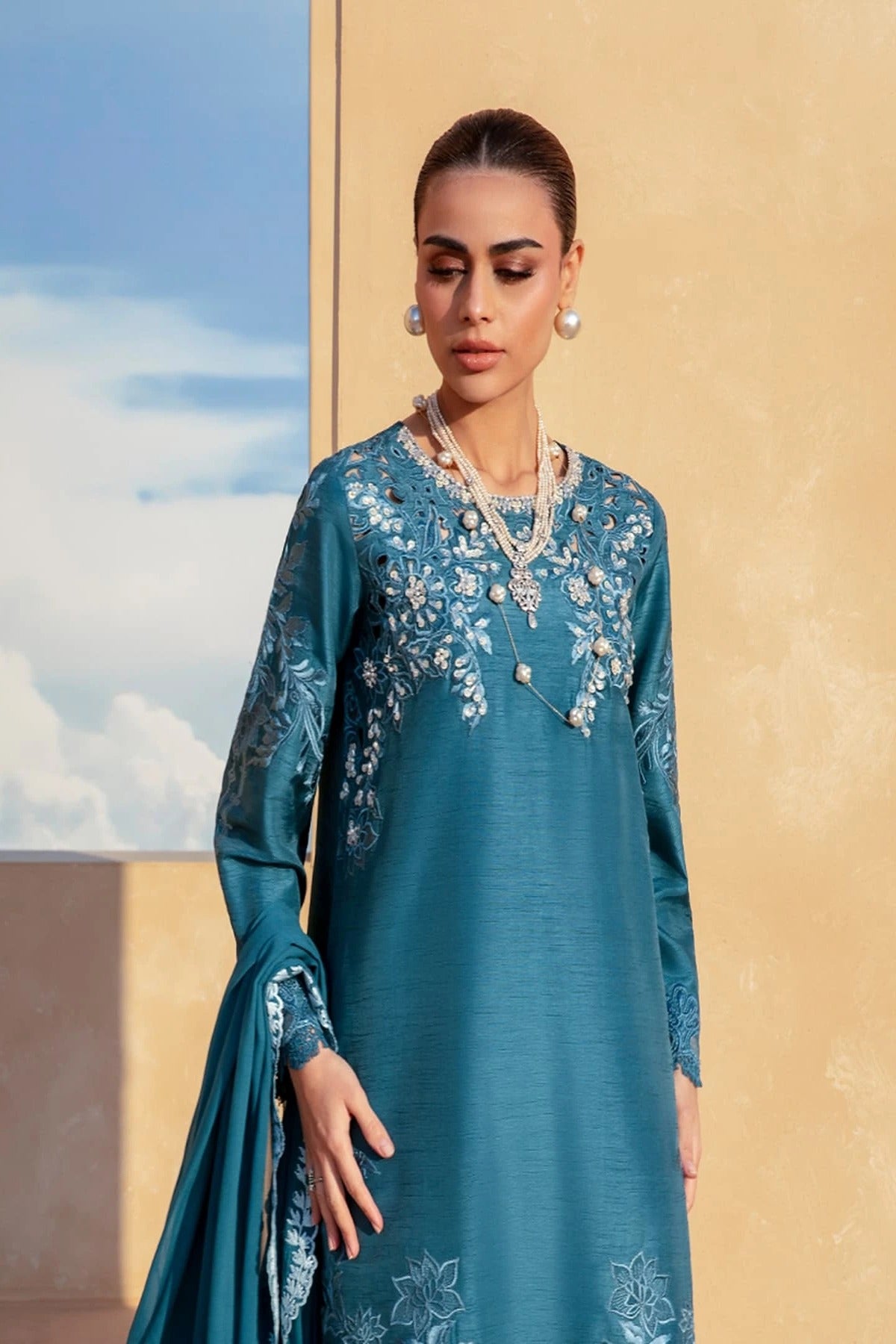 A tranquil teal workmanship of splendor. The ensemble embodies conventional grandeur with its sublime stitches and exquisite silhouette. Suited for bringing in flair to your apparel this season.