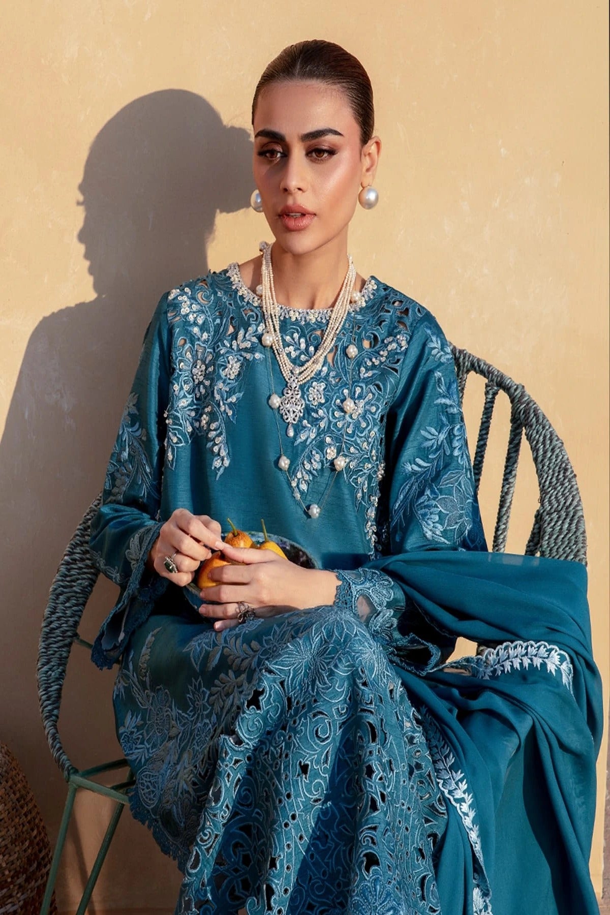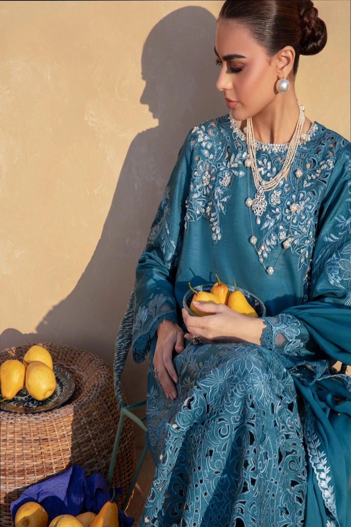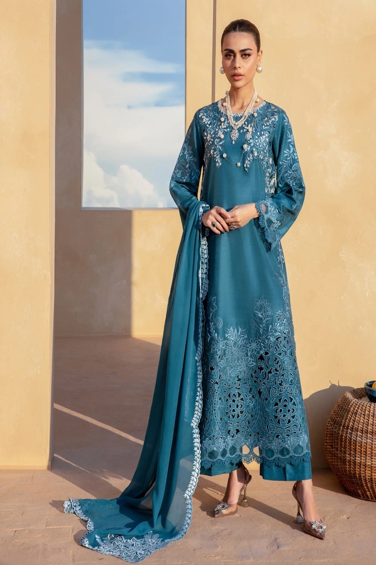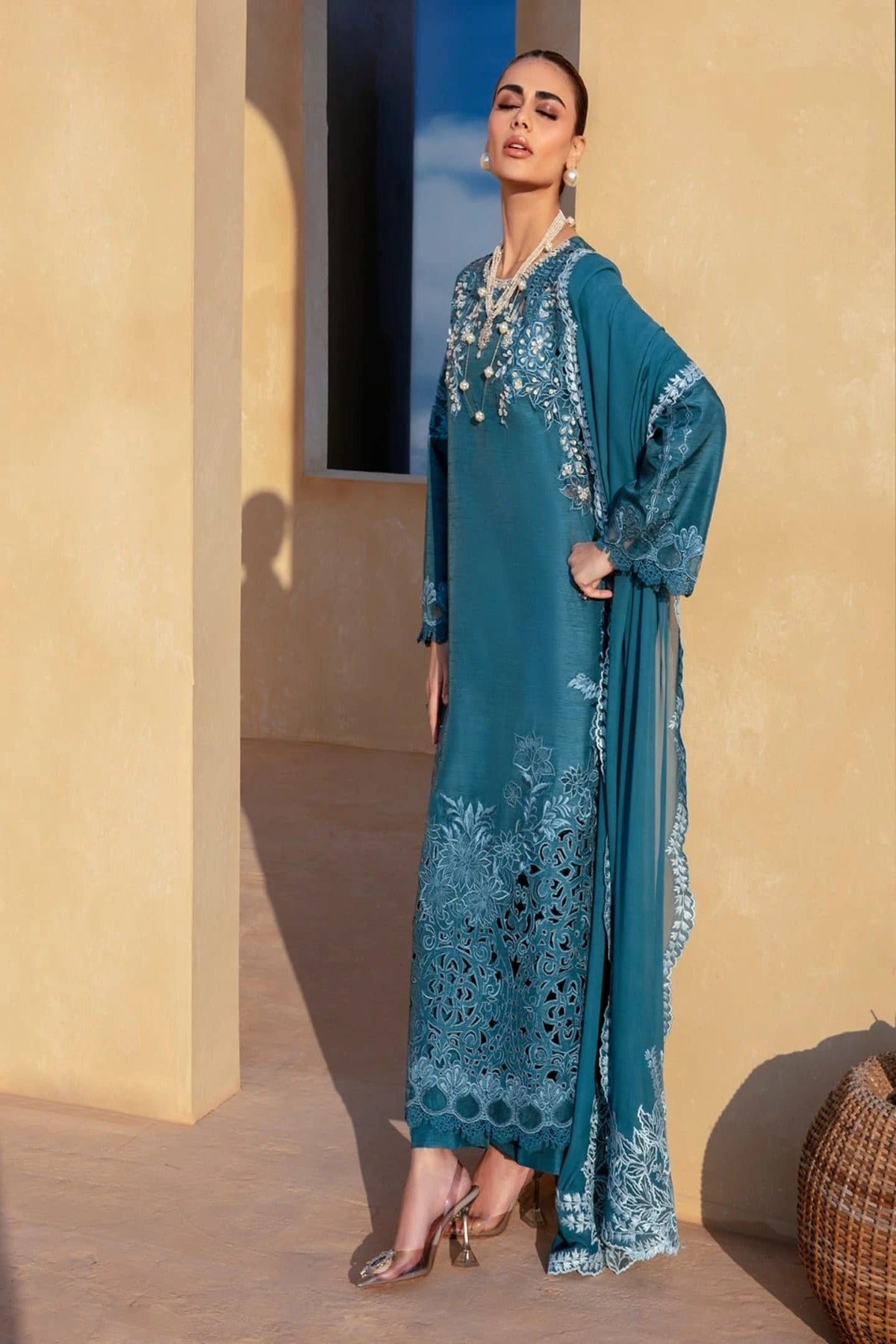 A tranquil teal workmanship of splendor. The ensemble embodies conventional grandeur with its sublime stitches and exquisite silhouette. Suited for bringing in flair to your apparel this season.
