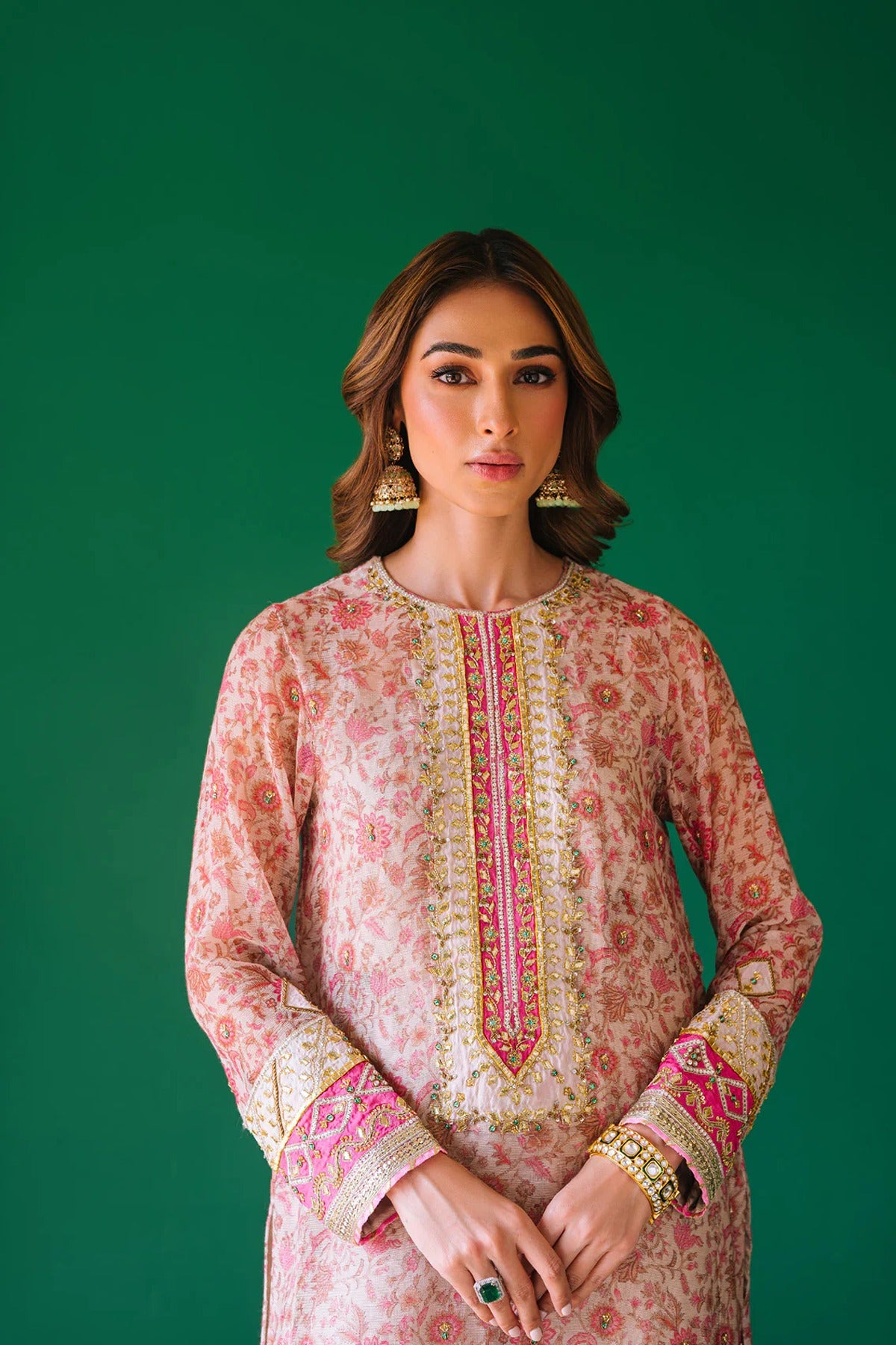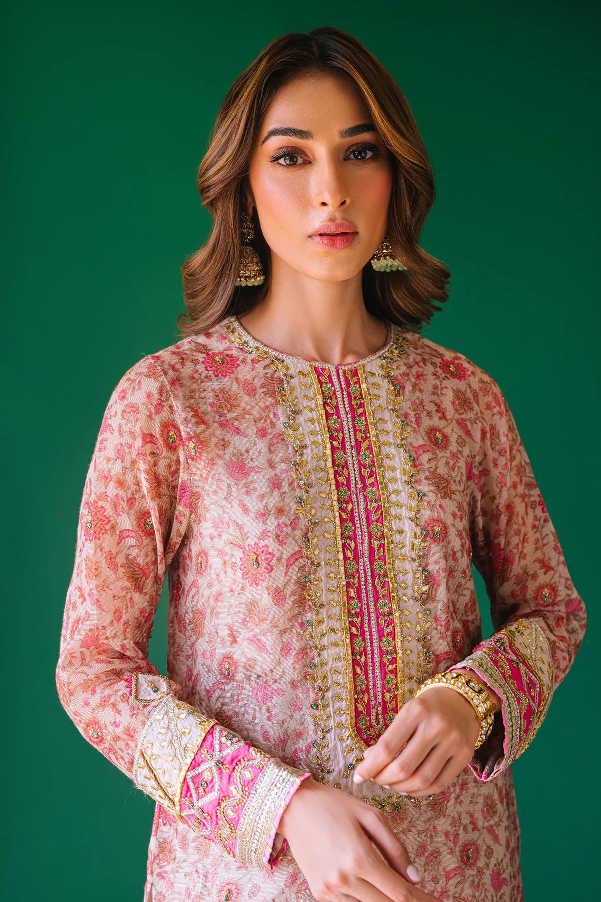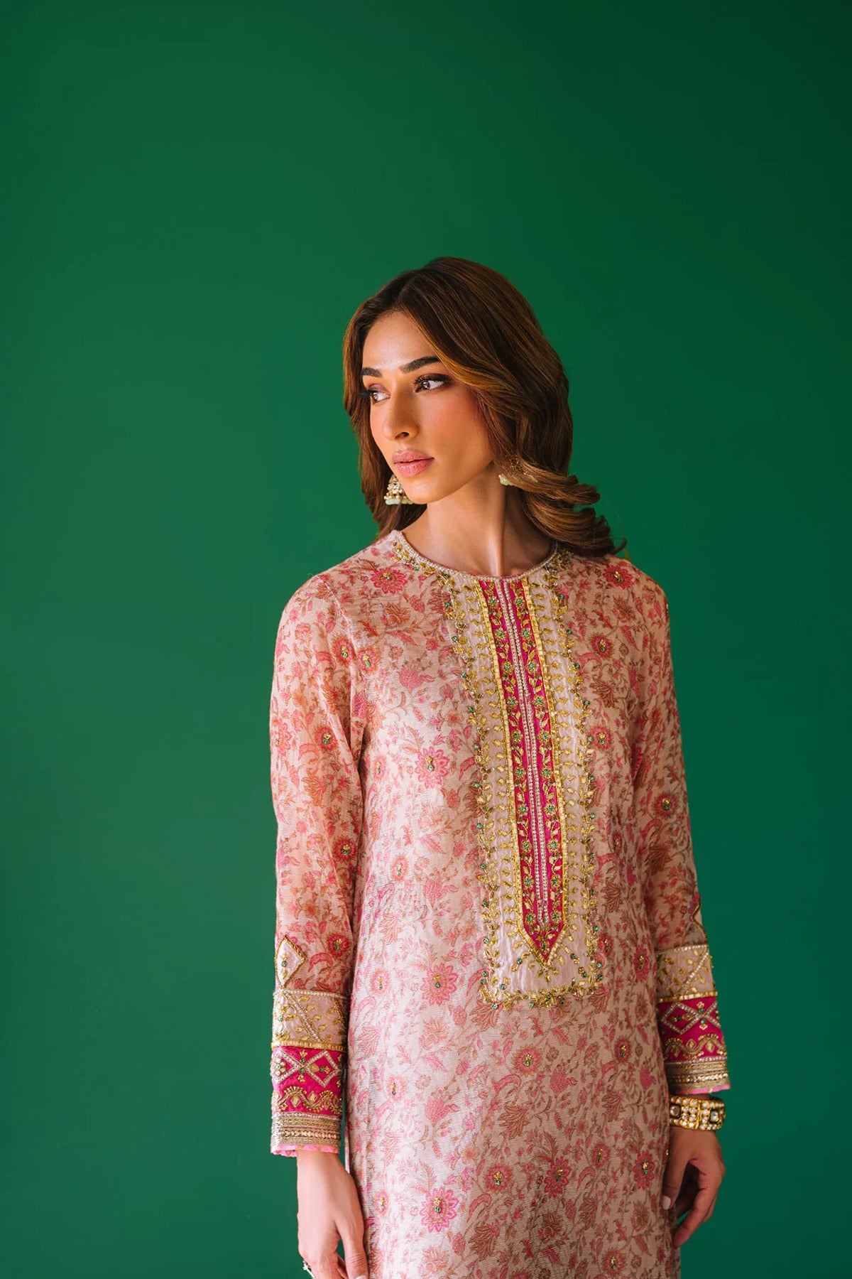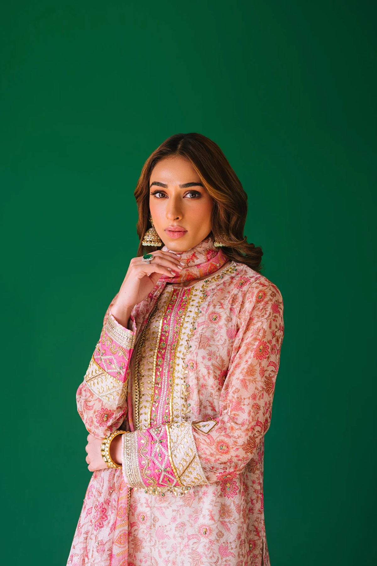 - A Digital print cotton shirt with intricate and gorgeous hand embellishments on neckline and sleeves. We love the gota pati work, kora, dabka, rhinestones and pearls. Lace detailing on sleeves and daaman.