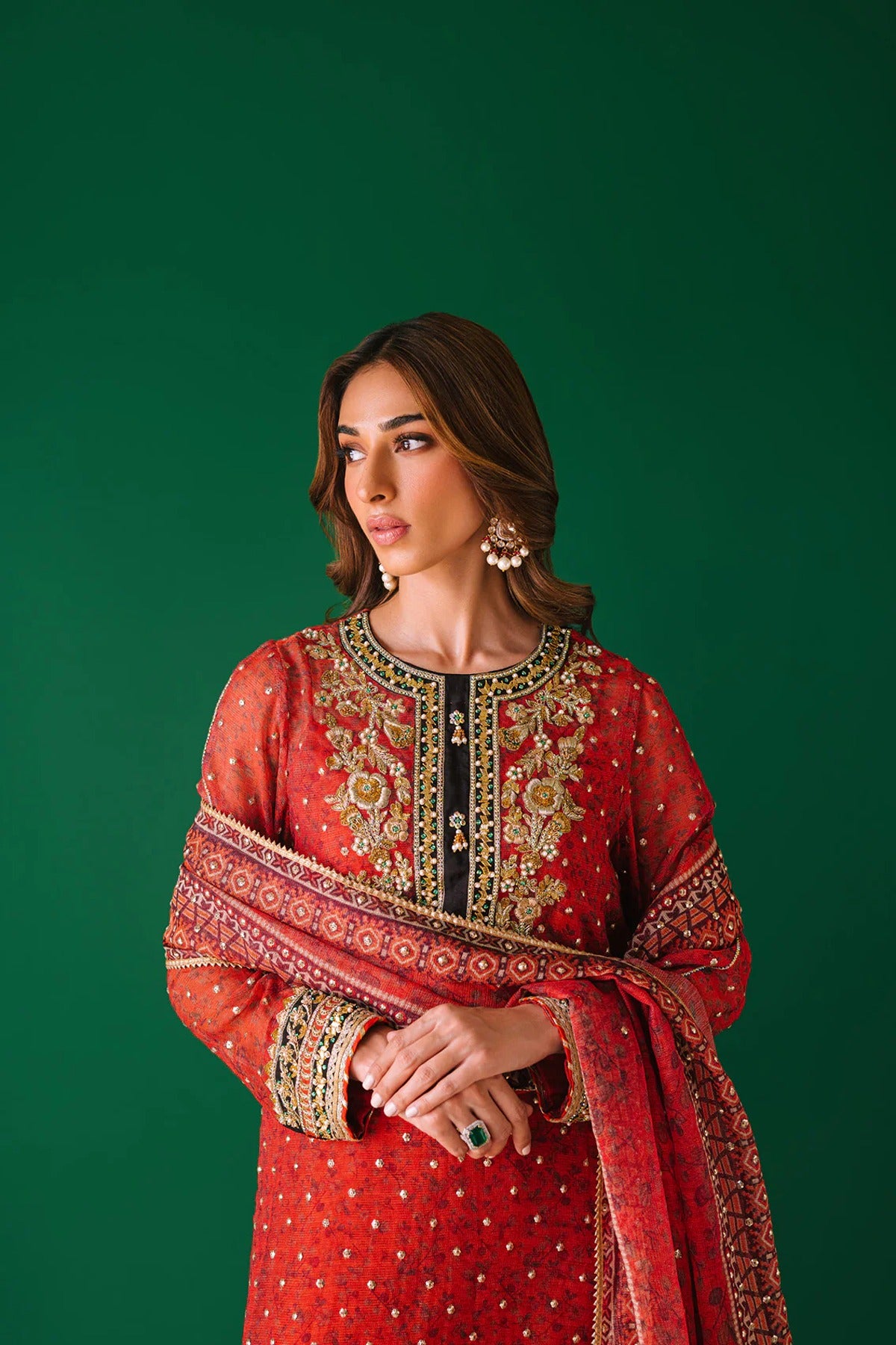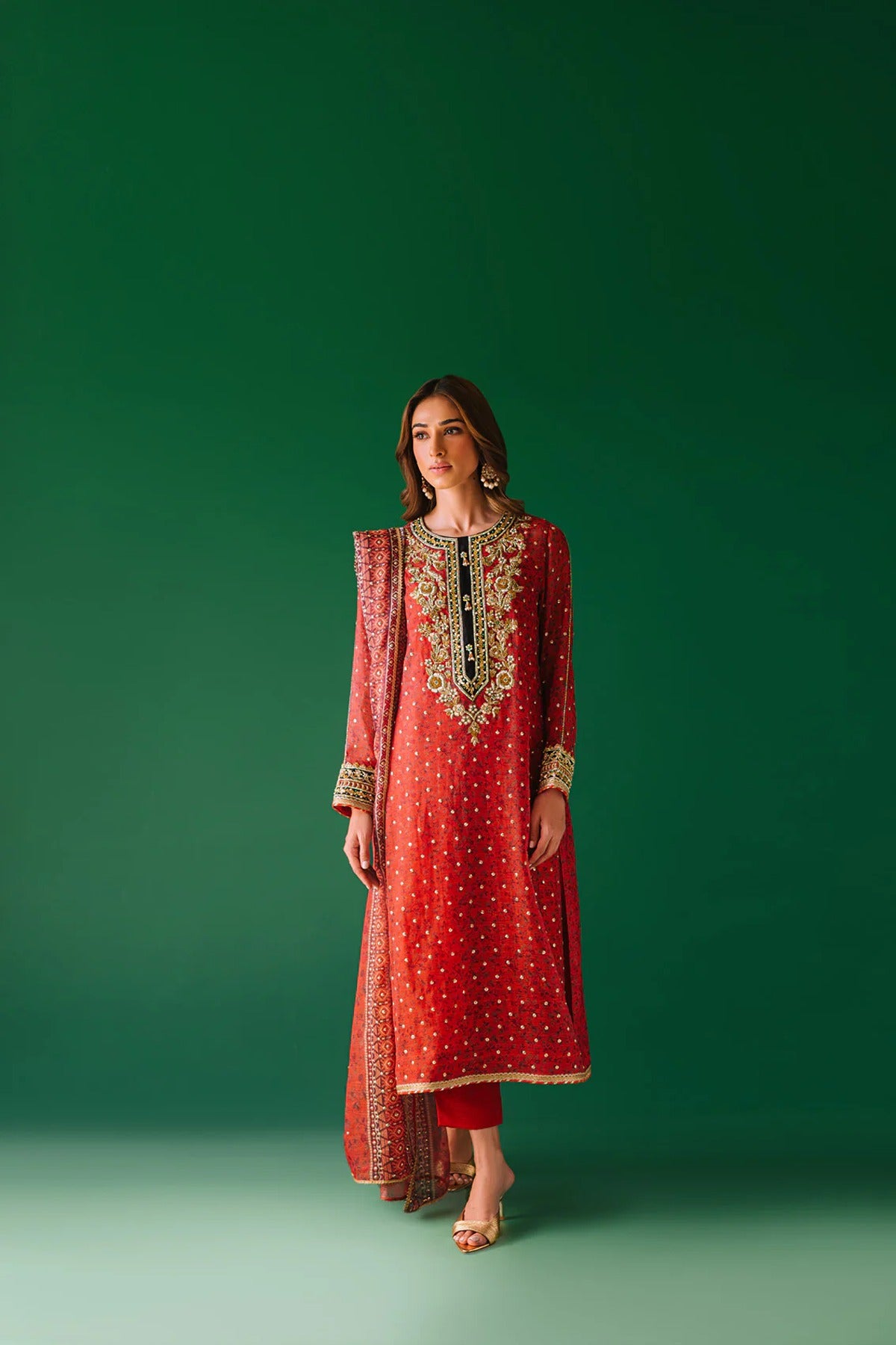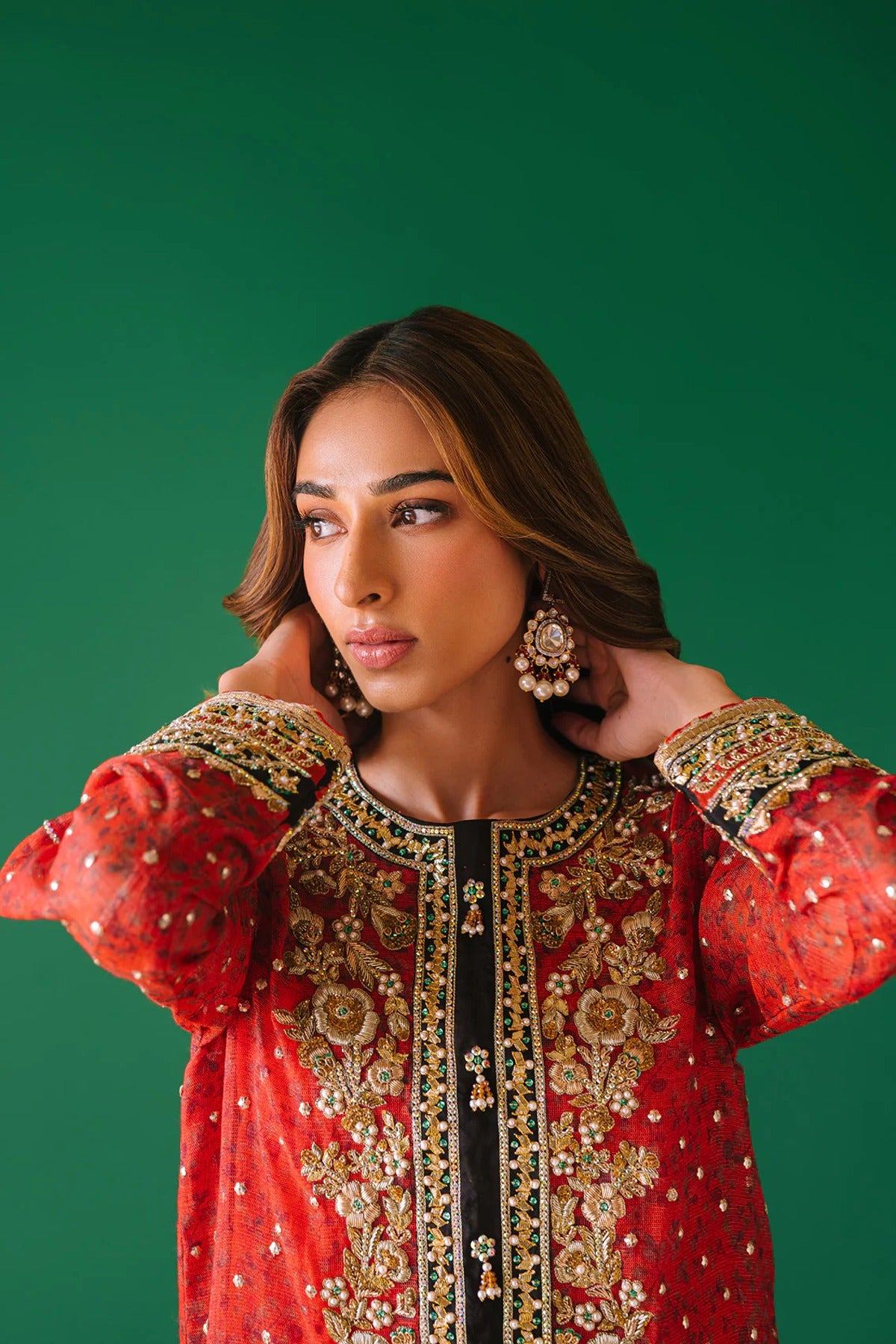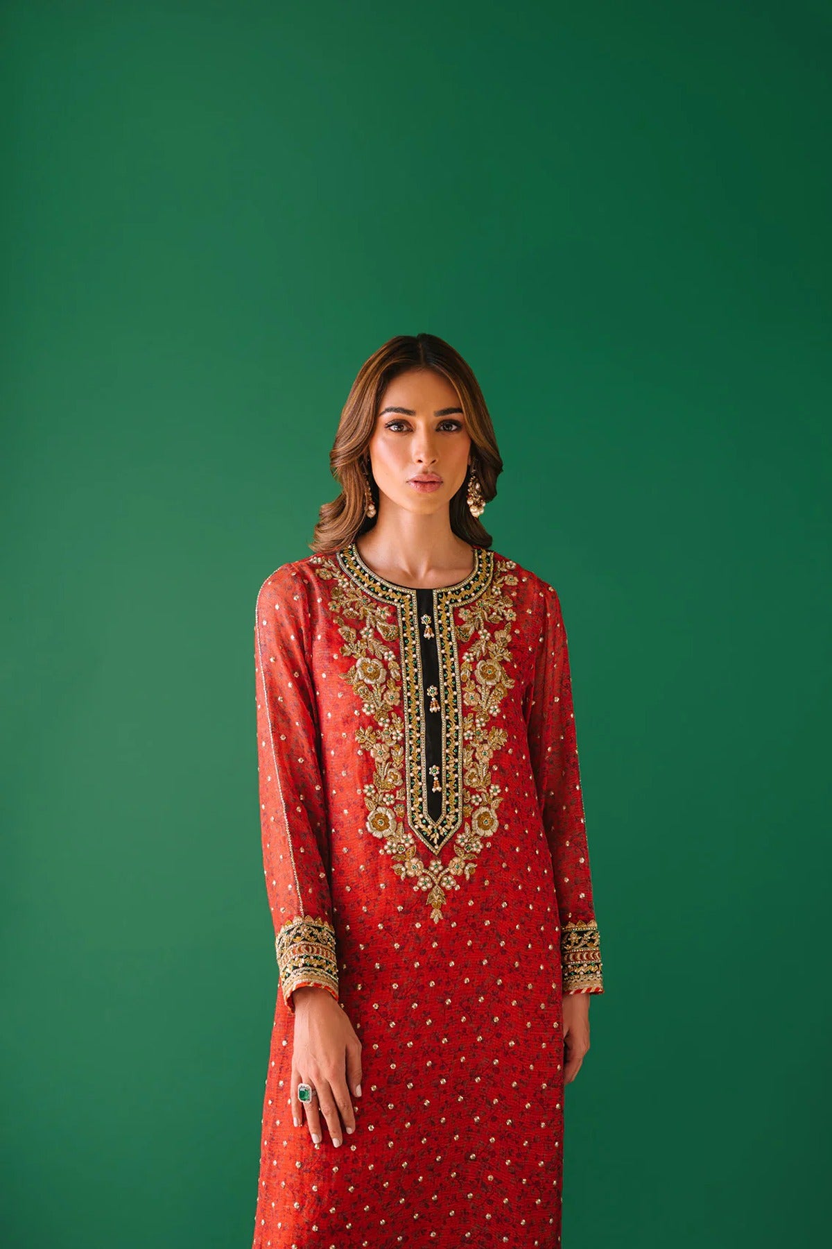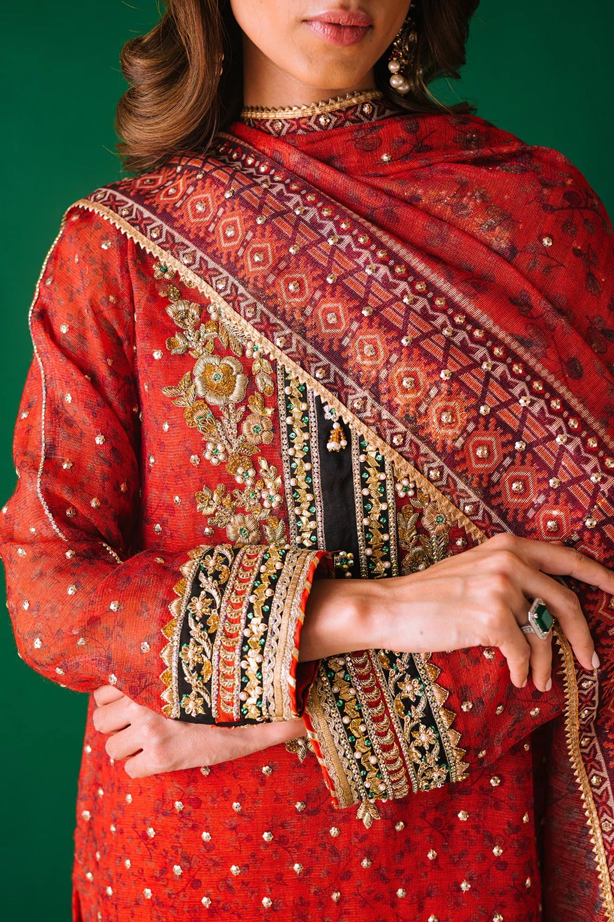 - A cotton net digital print shirt with intricate hand embellishments on neckline and sleeves. Gota pati, dabka, kora, rhinestones and pearls. We love the sequins spray all over the shirt also with lace detailing.