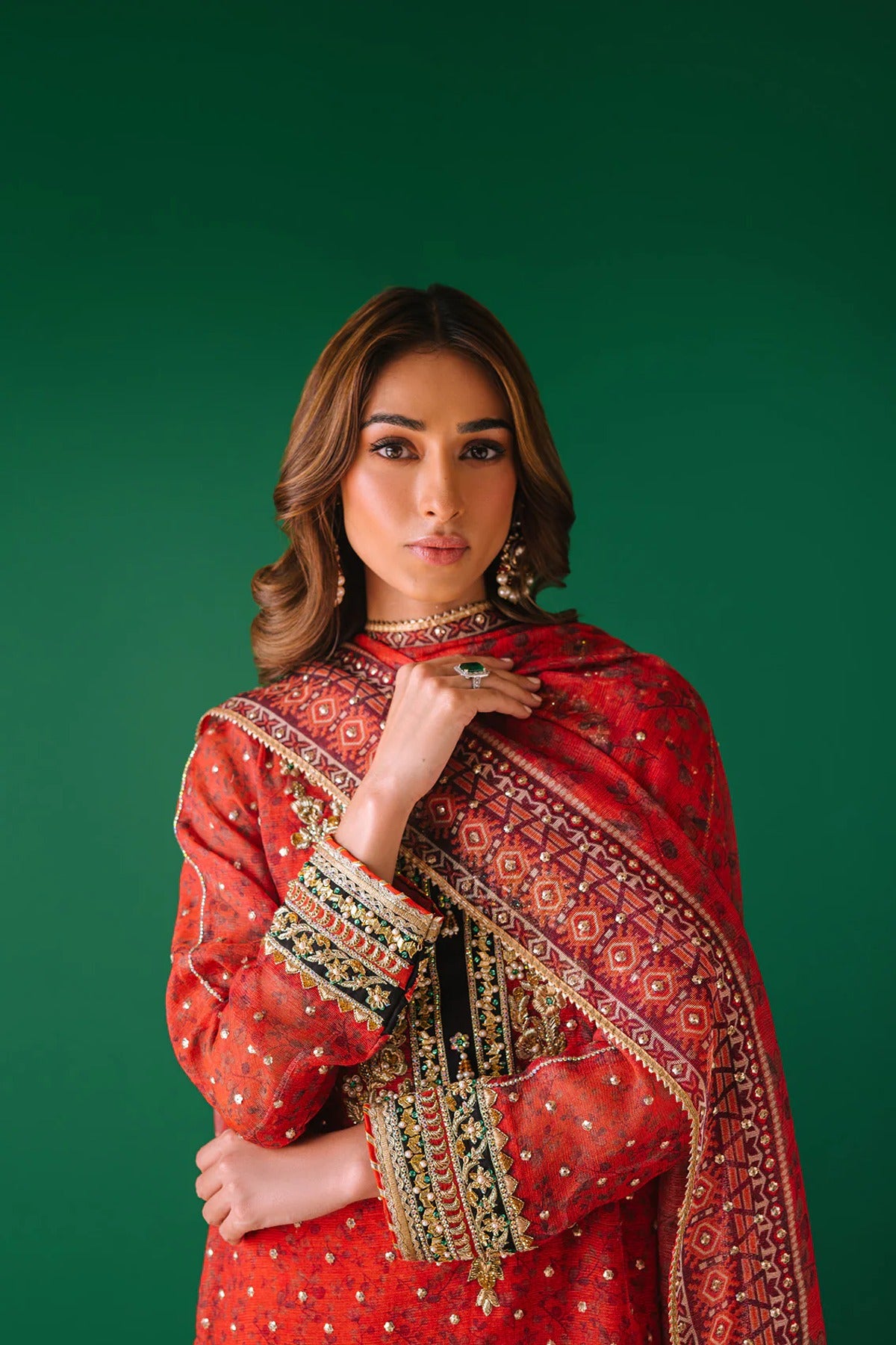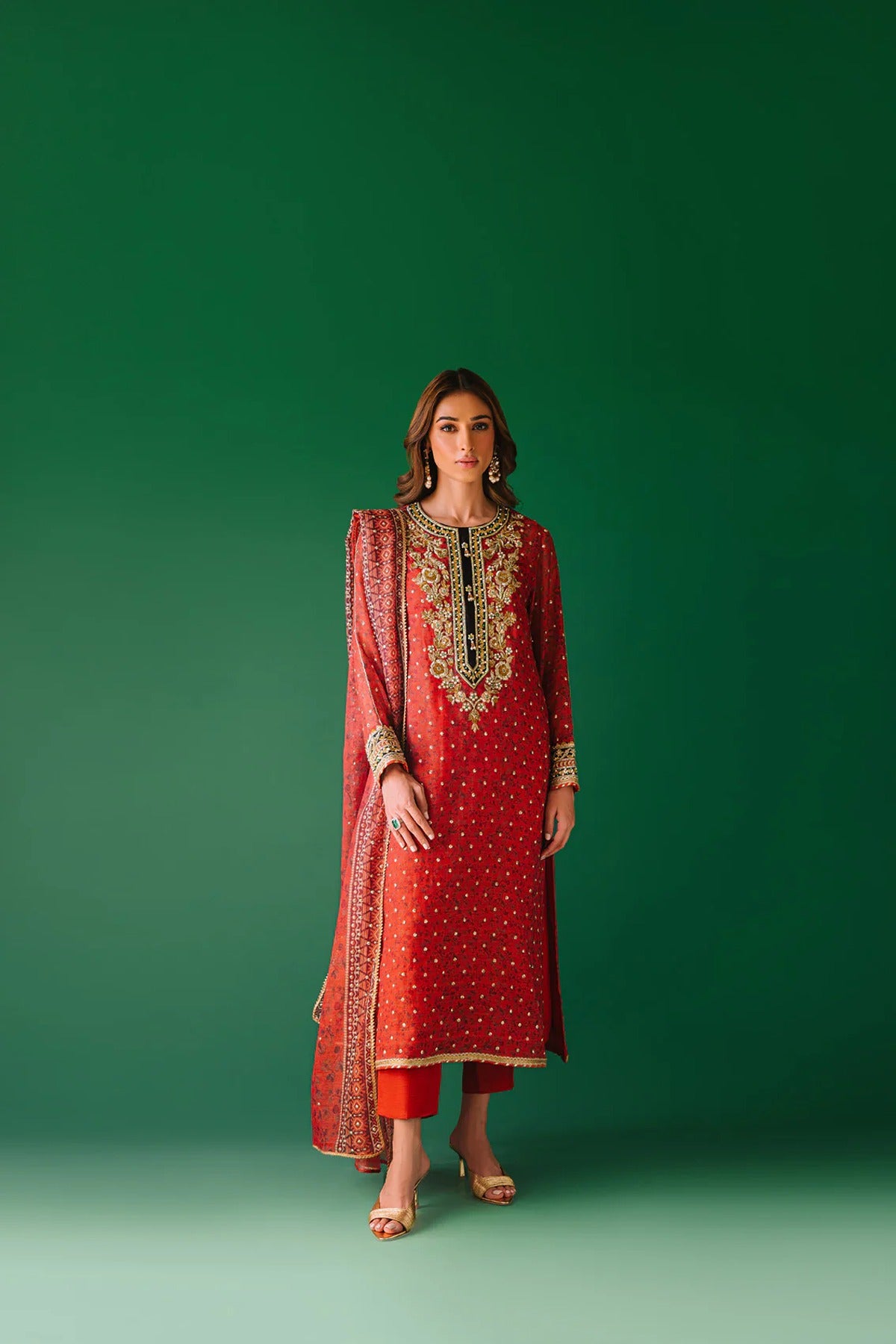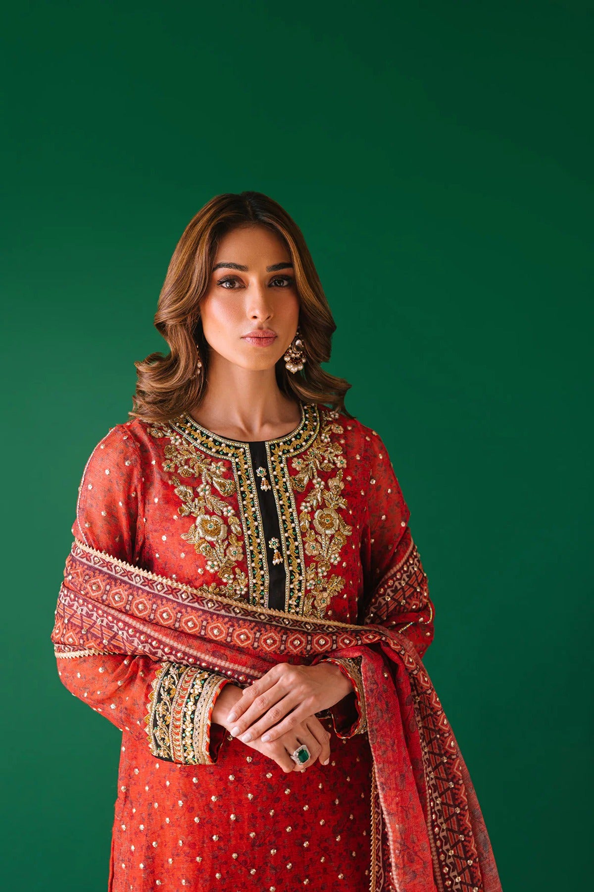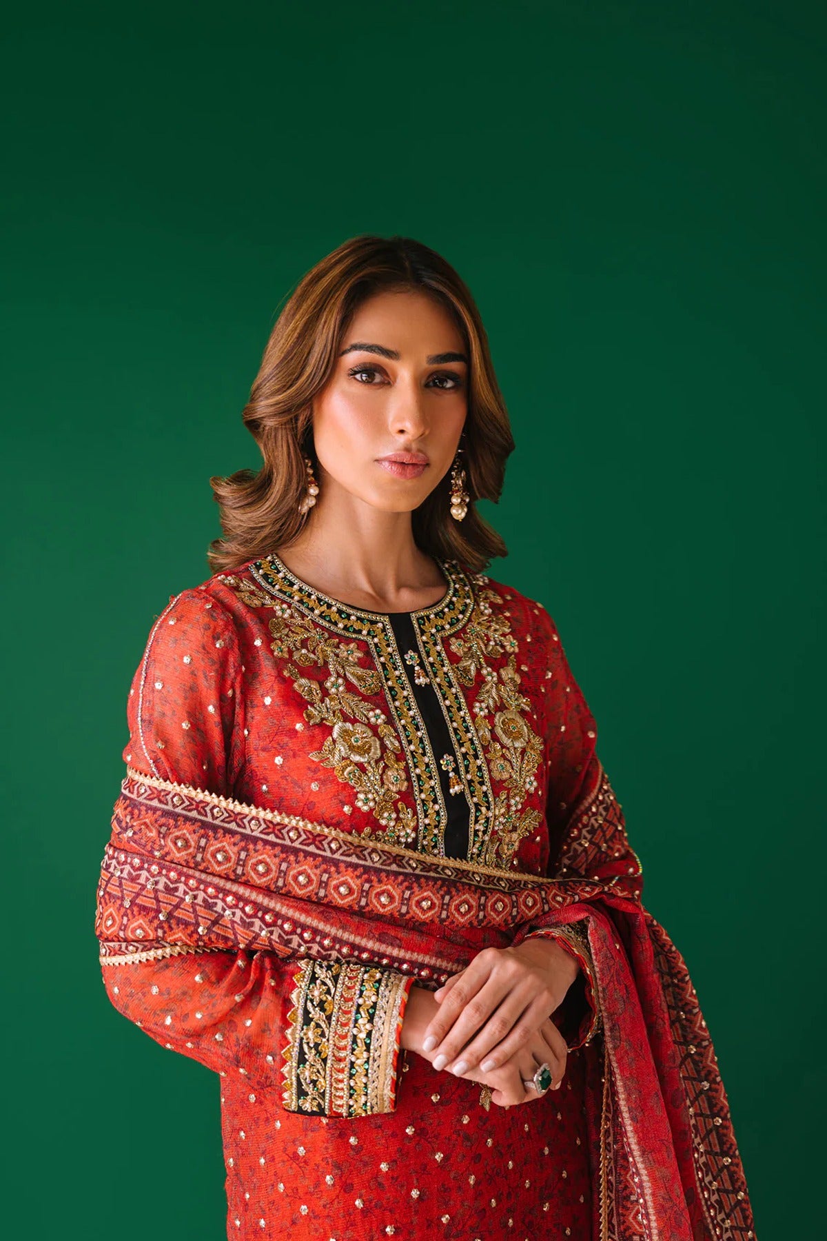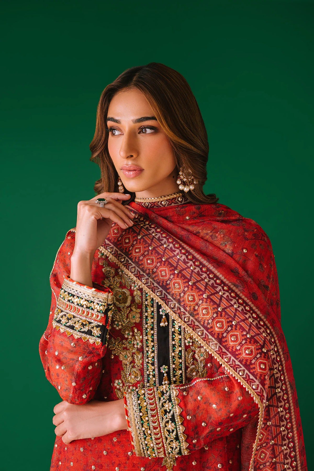 - A cotton net digital print shirt with intricate hand embellishments on neckline and sleeves. Gota pati, dabka, kora, rhinestones and pearls. We love the sequins spray all over the shirt also with lace detailing.