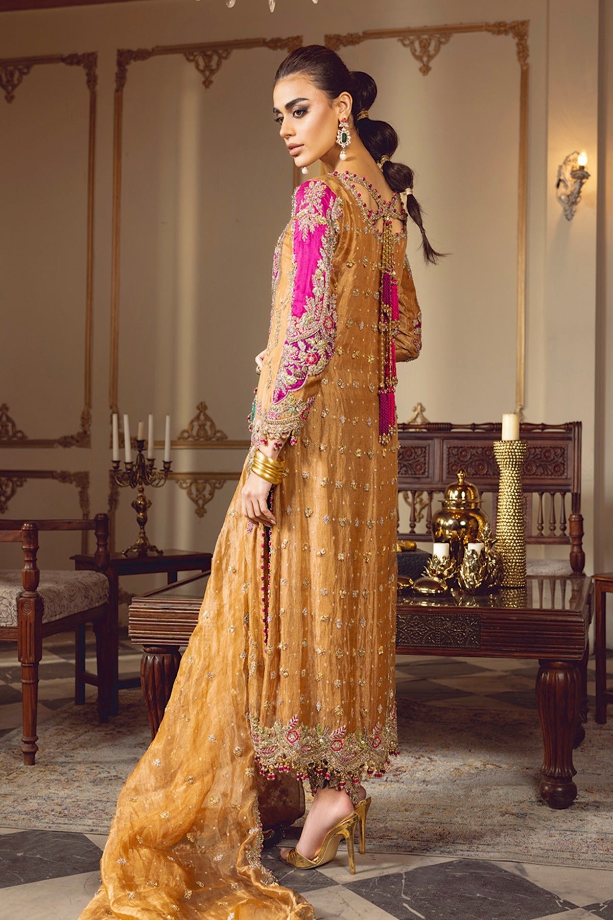 In the dimly lit room, SULTANIQUE emerges like a spectral bloom created with pure tissue in pale tangerine tone adorned with ethereal floral motifs paying homage to tales of ancient traditions. The ensemble celebrates old school elegance with each taanka laden carefully on the eclectic appliques creating a myriad of colors amalgamating convention with modernity. The turquoise green raw silk pants break the monotone of color and fabric exuding festivity and a mood of color and happiness.