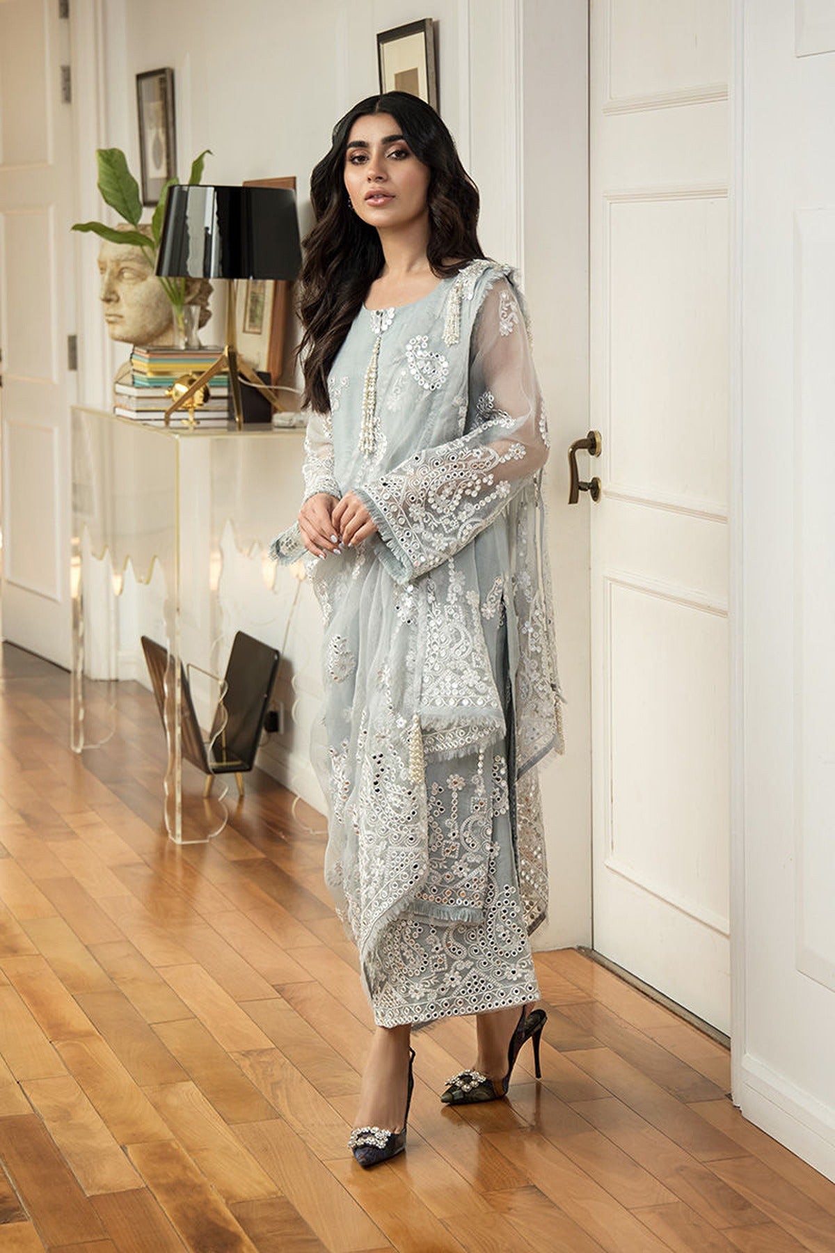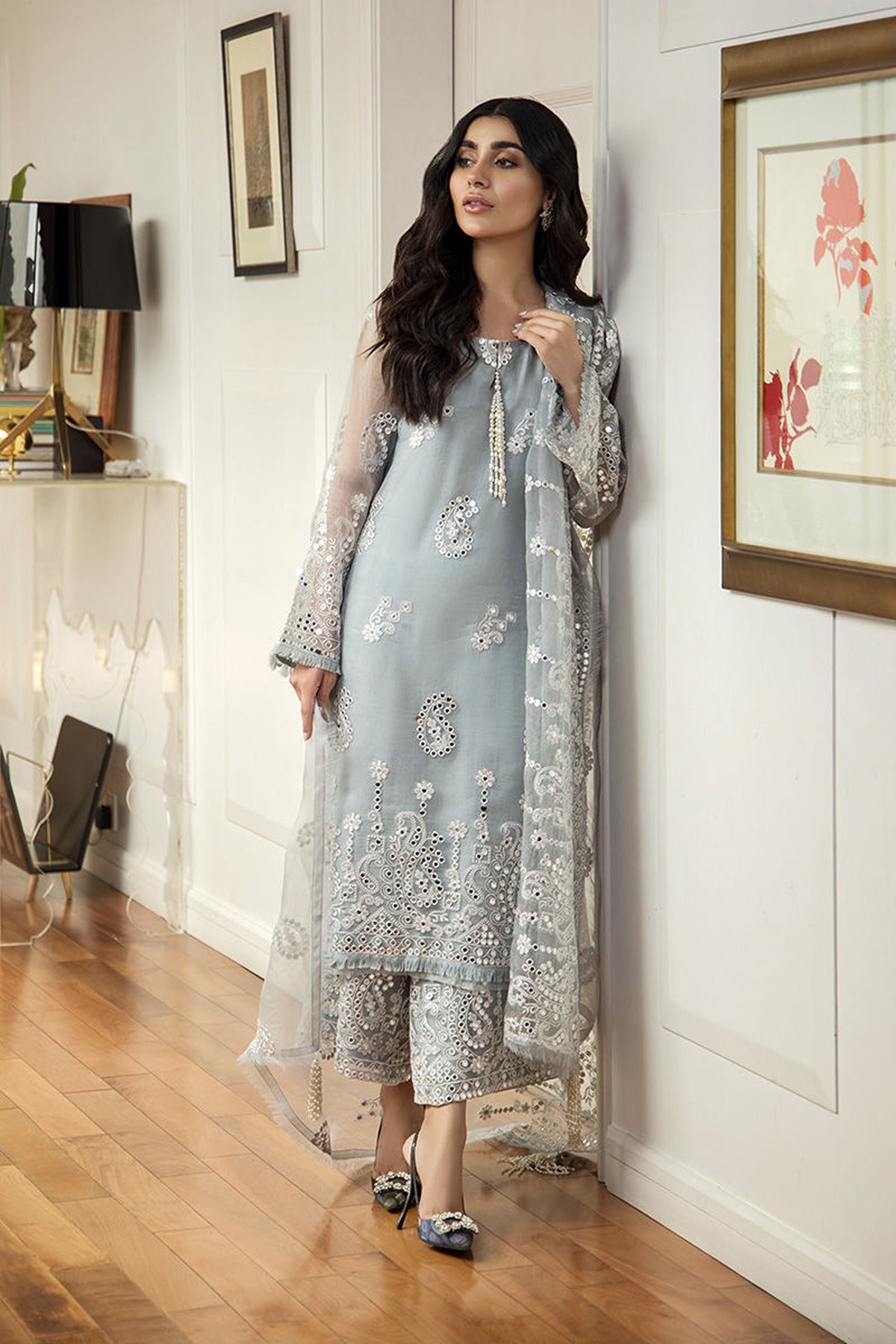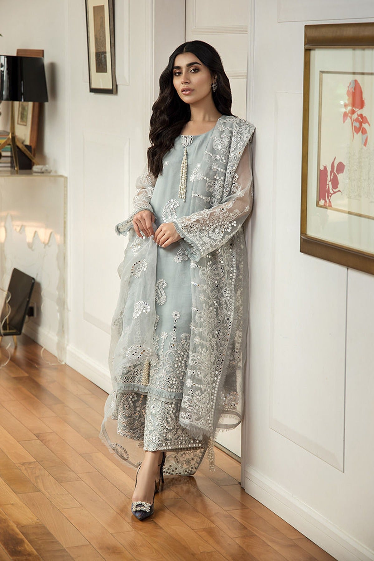 Earl features elegant grey pure organza separates adorned with exquisite sheesha and delicate threadwork. The draped dupatta is enhanced with handmade brooches and tassels, while the neckline is gracefully finished with hand-strung pearl tassels. Inspired by nature, the intricate detailing subtly blends floral and leaf motifs, adding to its timeless charm.