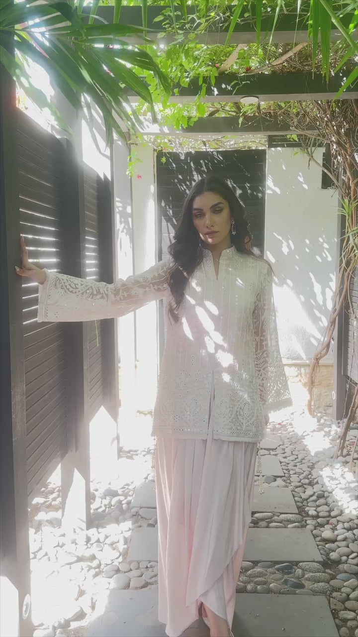 The ensemble includes a raw silk sarong with pleats in the front, paired with a shirt crafted from pure organza adorned with embroidery all over and hand-made pearl tassels on the sides.