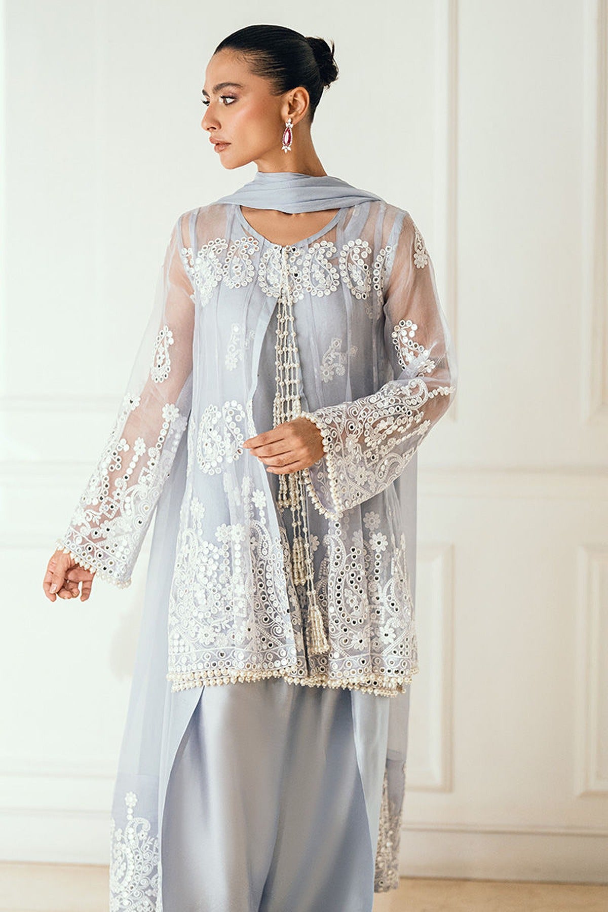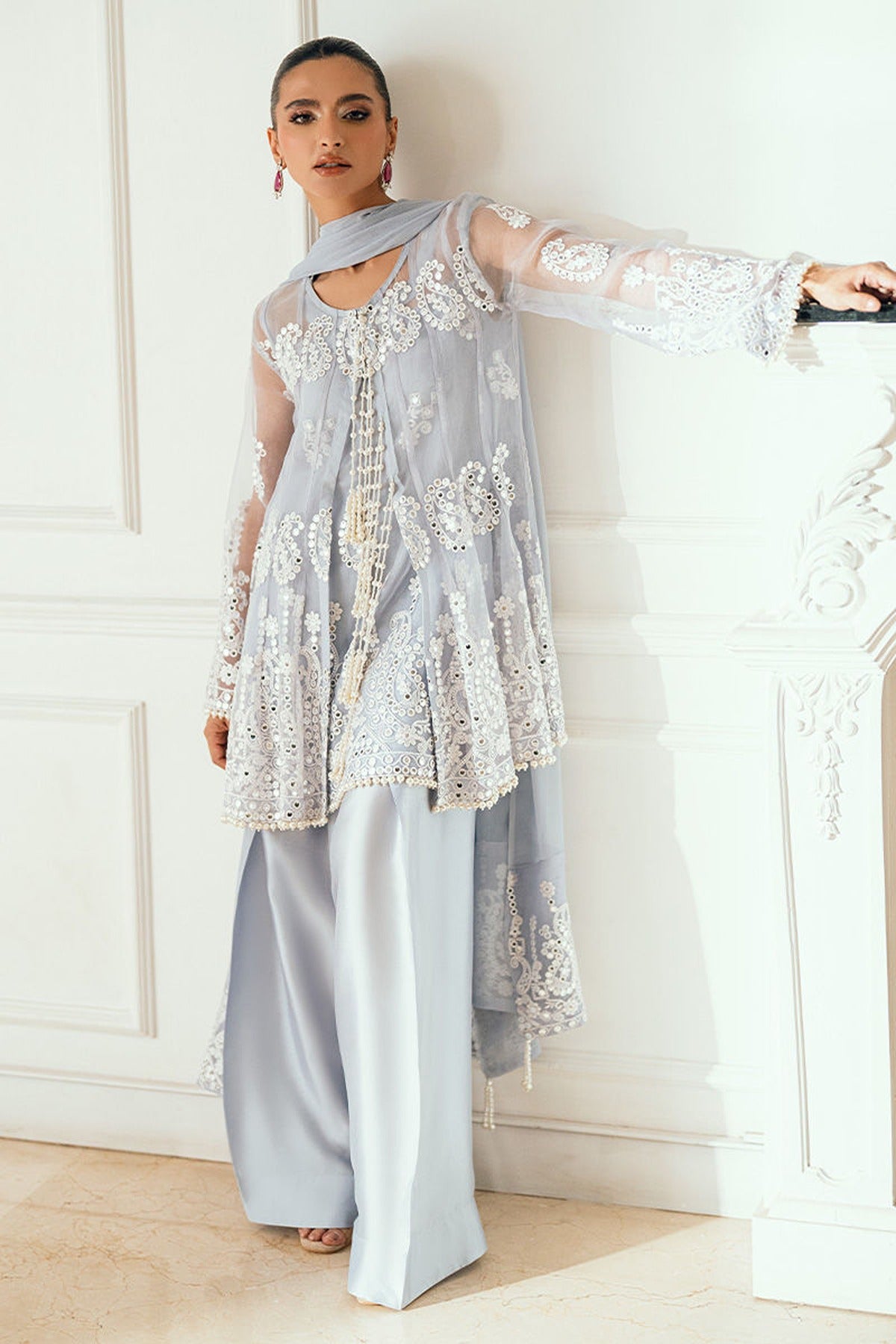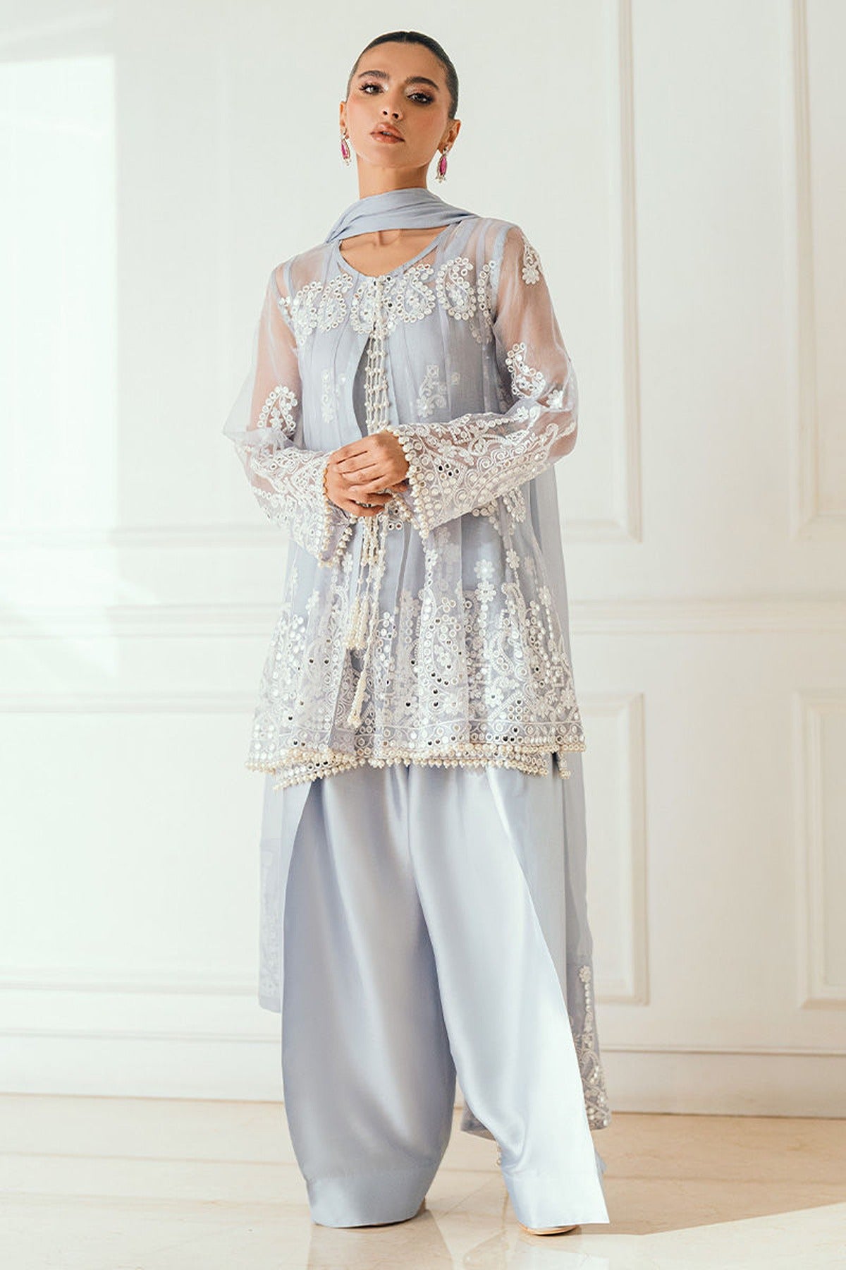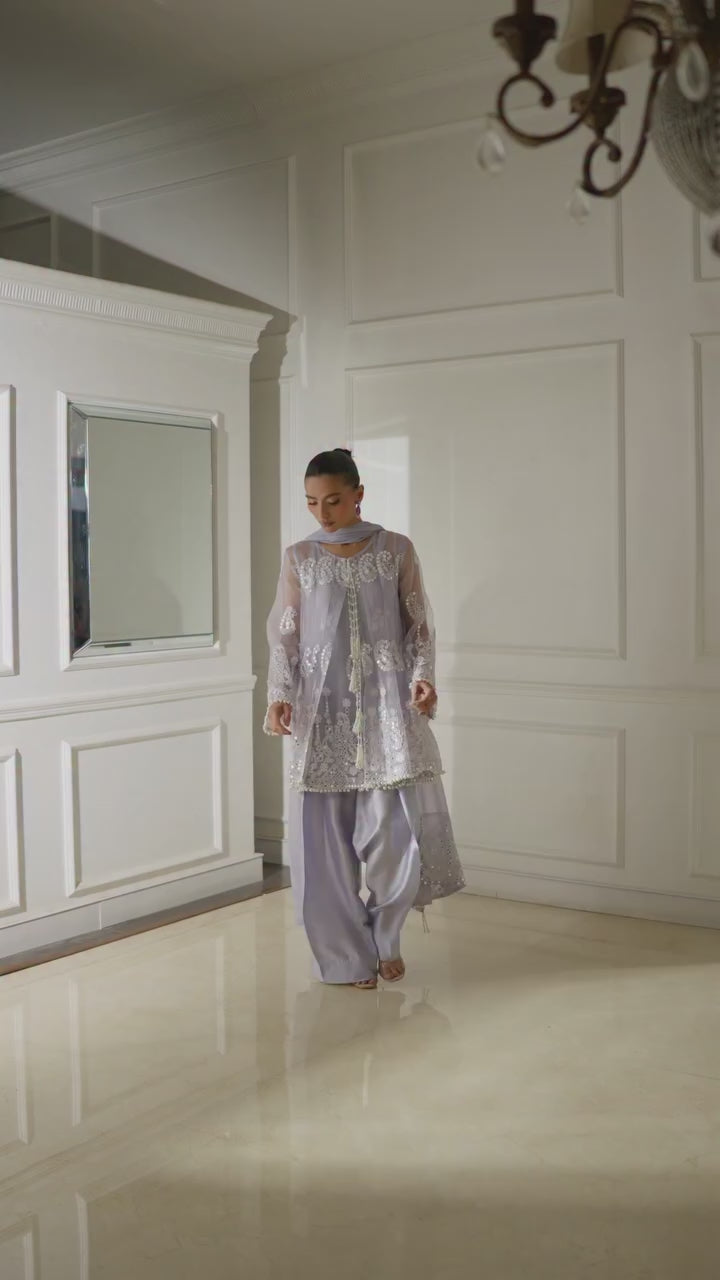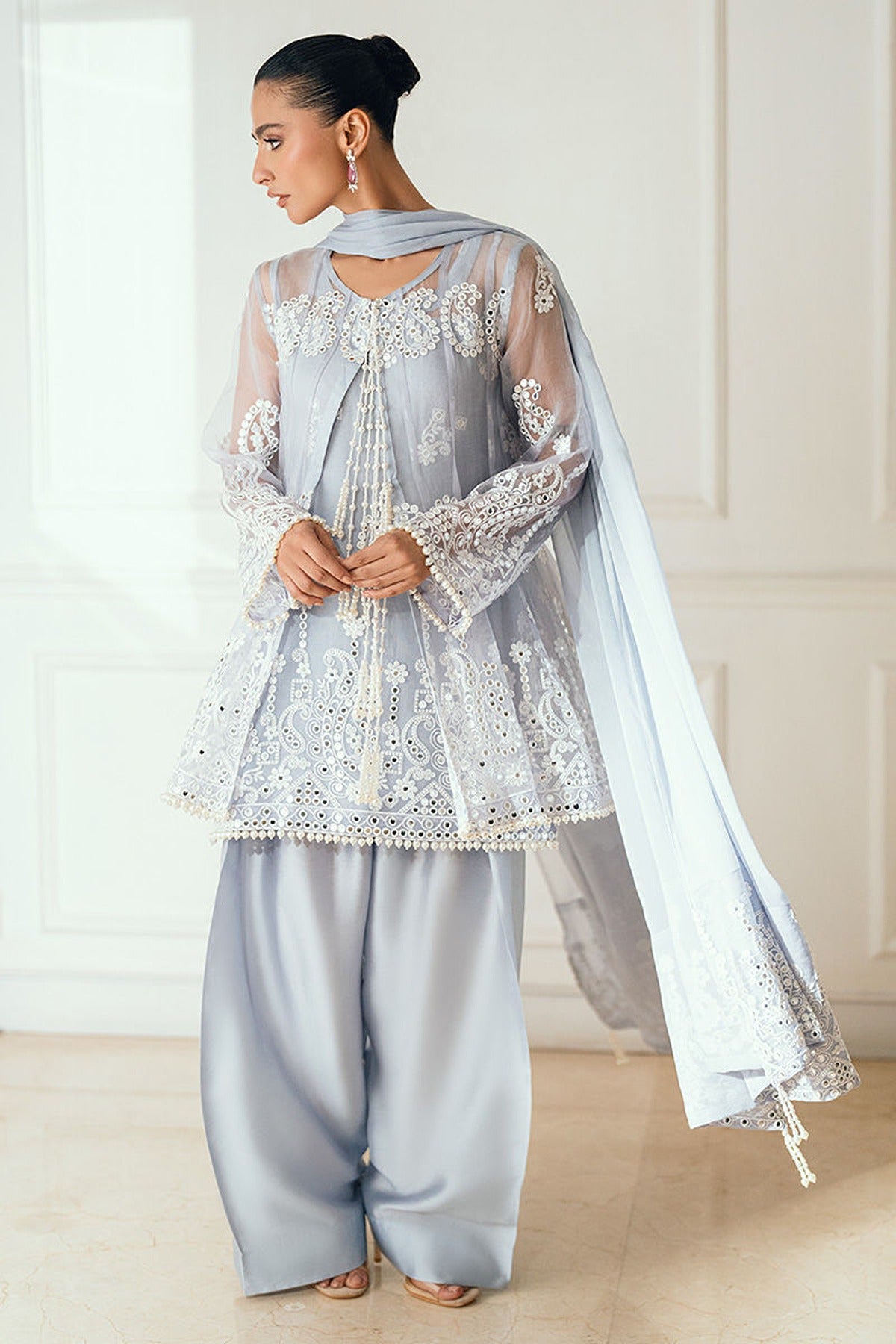 Ania is a dreamy lavender blue pure organza peplum paired with a matching slip, featuring delicate embroidery and foil work all over. Handmade pearls adorn the damaan, sleeves, and front strings, adding a touch of luxury. The ensemble is completed with a chiffon dupatta accented with embroidered and foil borders on the pallus, and a silk farshi shalwar for a graceful finish. A cotton silk lining beneath the slip ensures comfort and ease of wear.