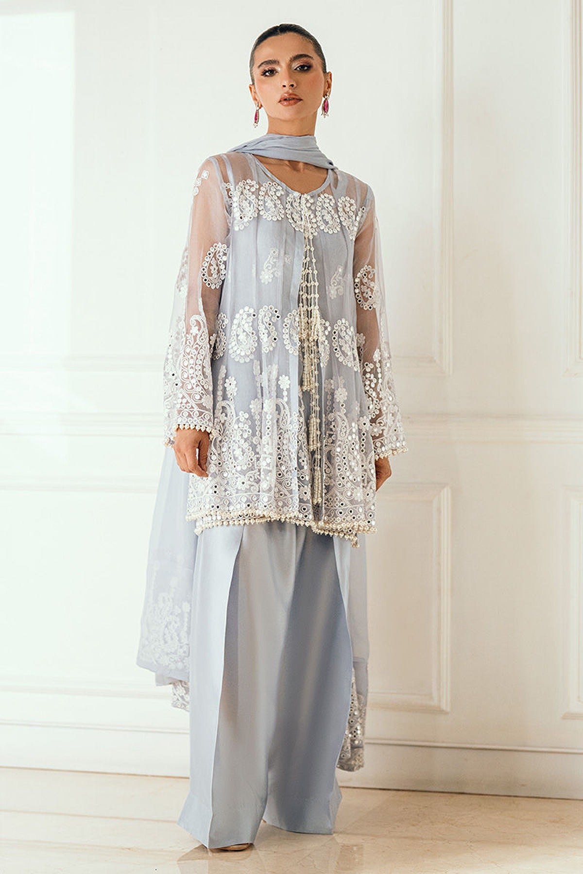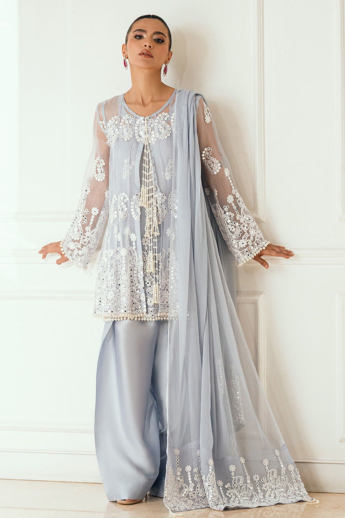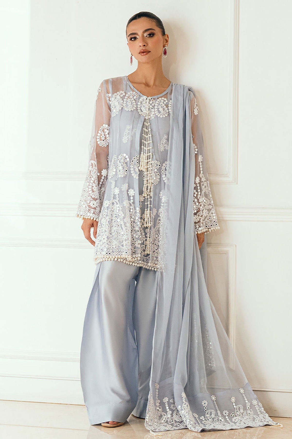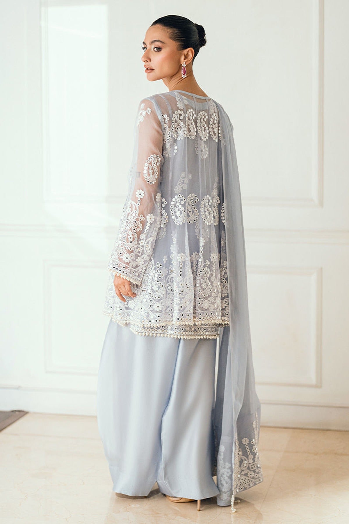 Ania is a dreamy lavender blue pure organza peplum paired with a matching slip, featuring delicate embroidery and foil work all over. Handmade pearls adorn the damaan, sleeves, and front strings, adding a touch of luxury. The ensemble is completed with a chiffon dupatta accented with embroidered and foil borders on the pallus, and a silk farshi shalwar for a graceful finish. A cotton silk lining beneath the slip ensures comfort and ease of wear.