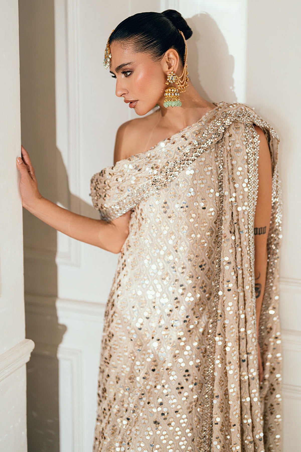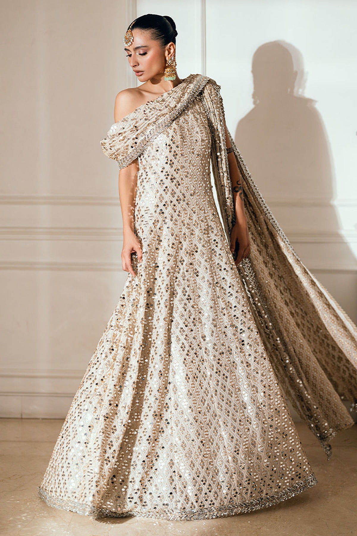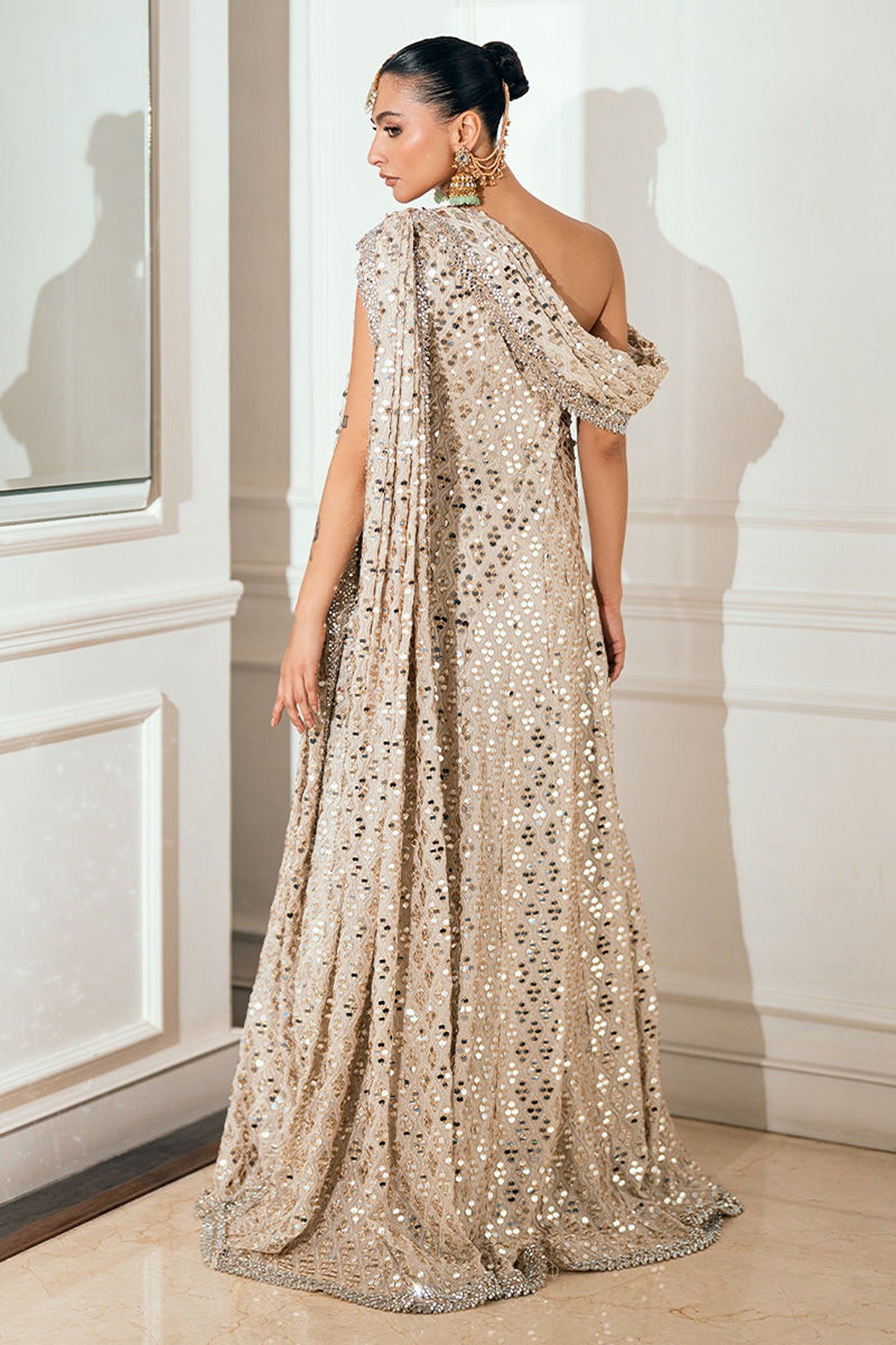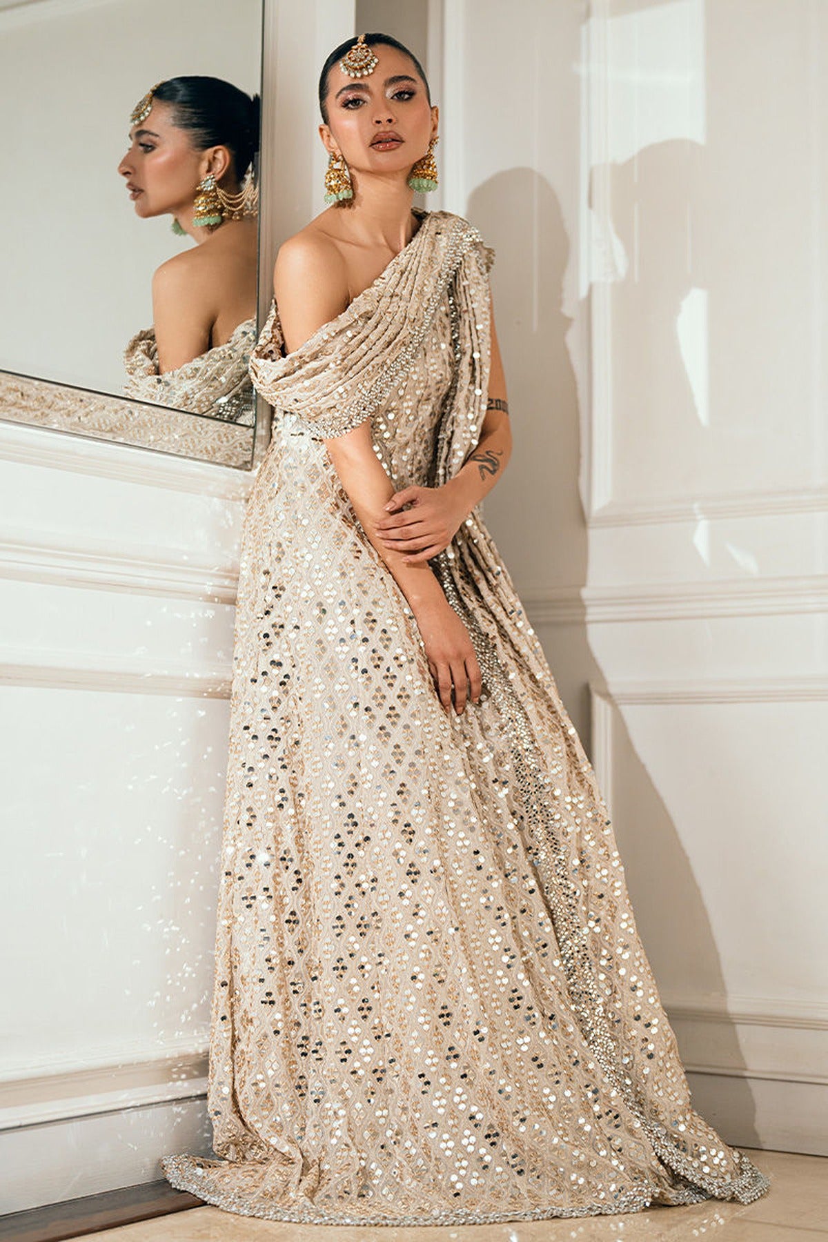 Laleh is a graceful chiffon peshwas adorned with intricate thread zara embroidery and foil work all over, complemented by a mirror-worked border on the damaan and dupatta. The dupatta is attached to the shirt, creating a seamless and elegant silhouette that exudes sophistication.