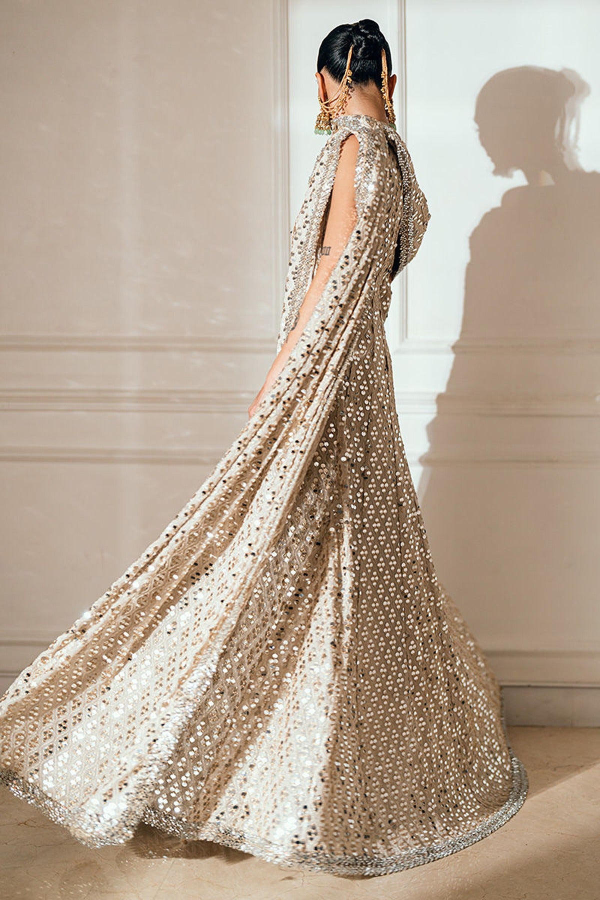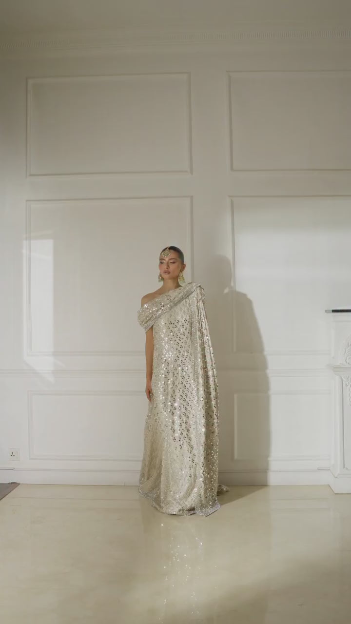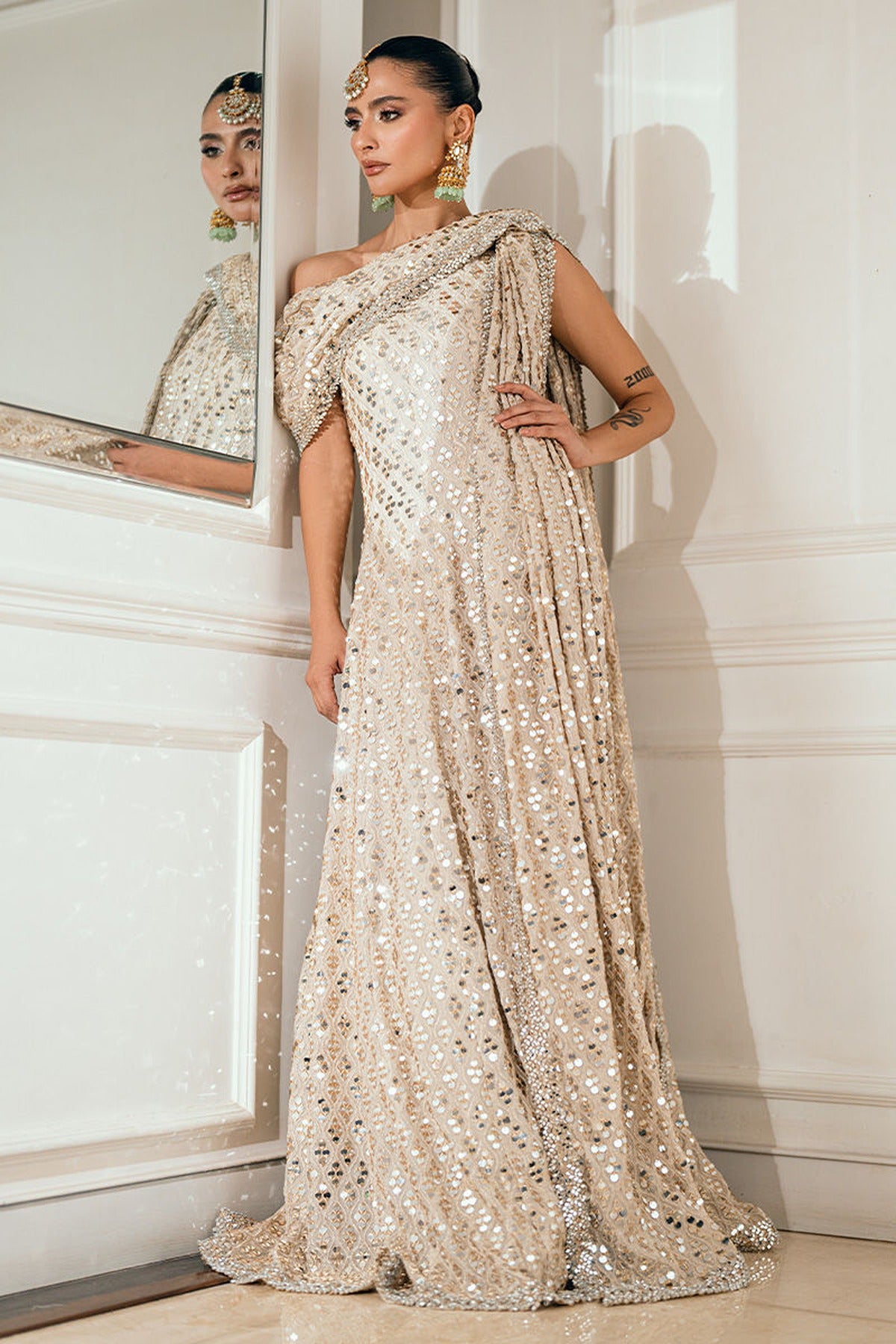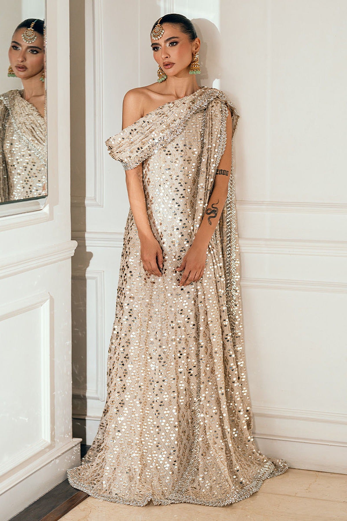 Laleh is a graceful chiffon peshwas adorned with intricate thread zara embroidery and foil work all over, complemented by a mirror-worked border on the damaan and dupatta. The dupatta is attached to the shirt, creating a seamless and elegant silhouette that exudes sophistication.