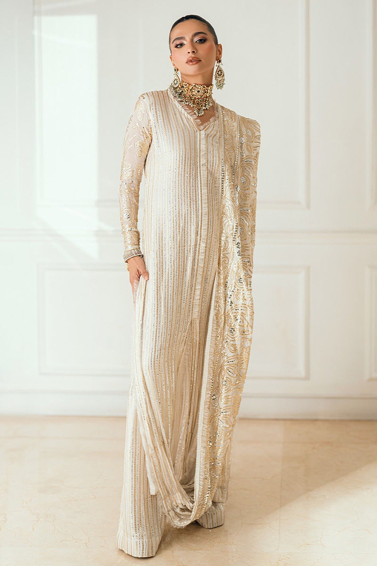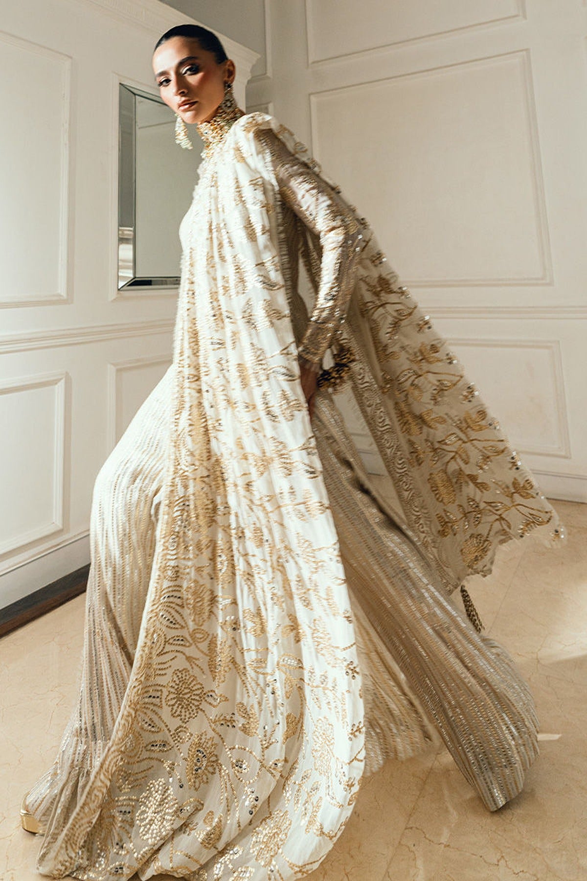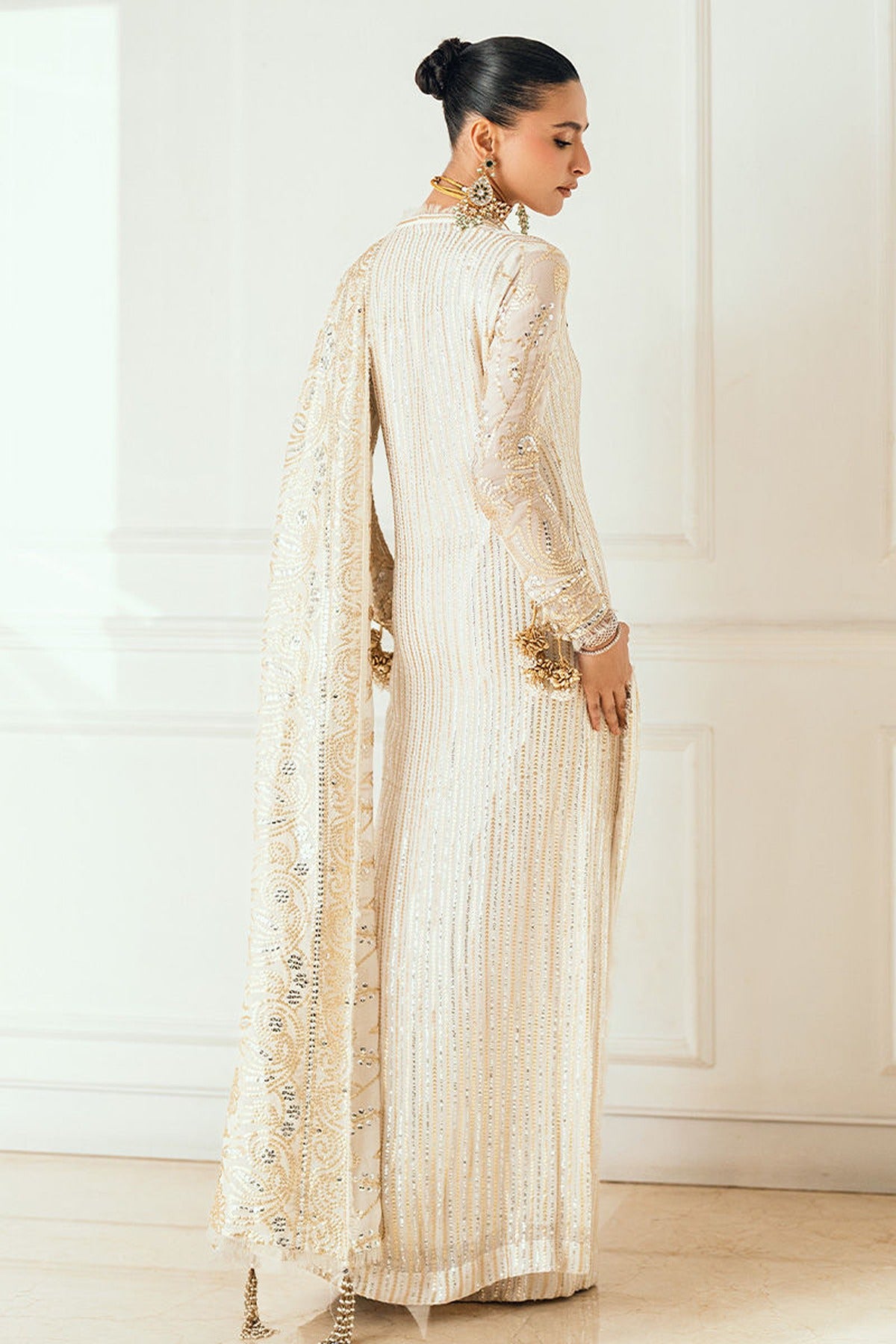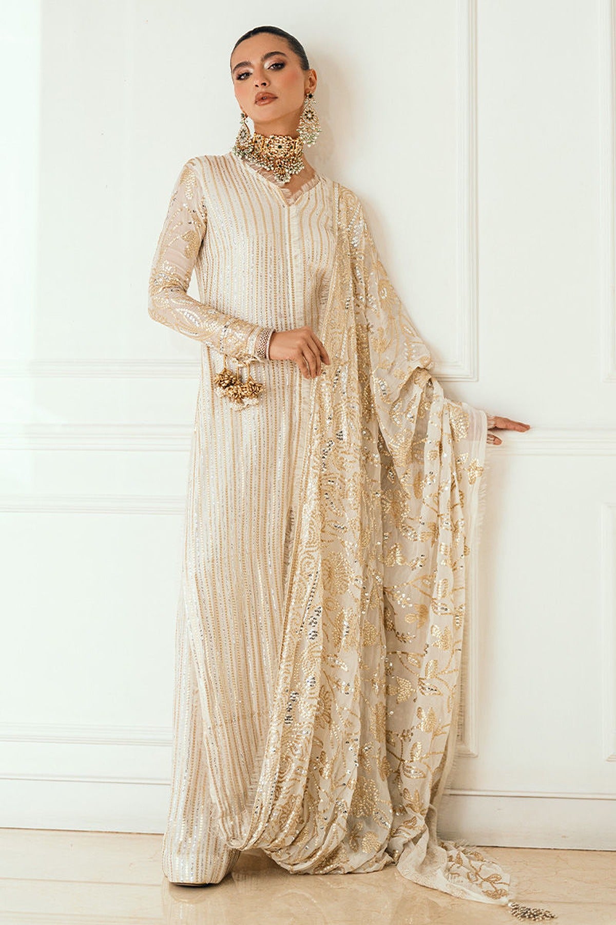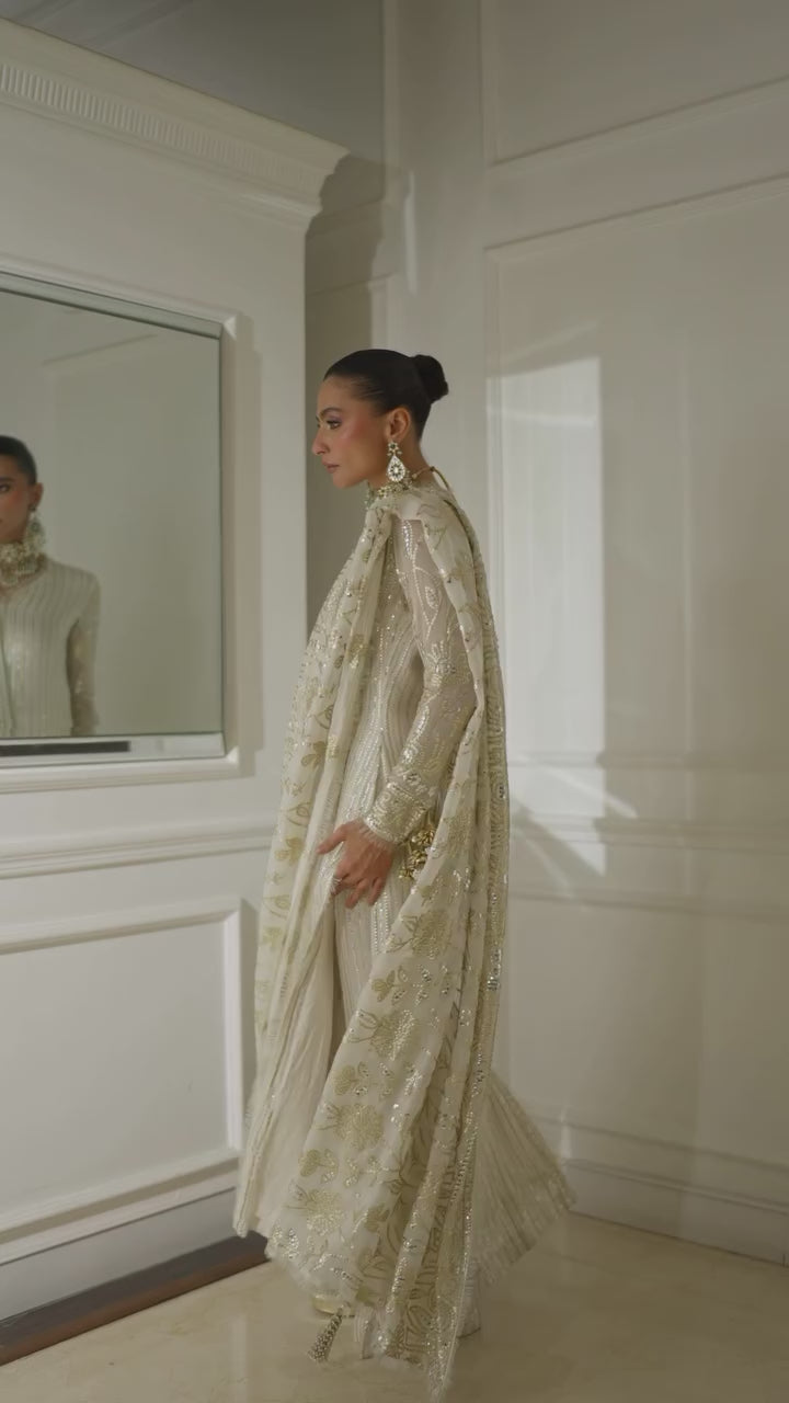 Nisha is an elegant off-white chiffon ensemble featuring intricate sequin work on both the shirt and pants. The outfit is complemented with a full sequin jaal dupatta, attached to the shirt for a cohesive and luxurious look. The shirt and pants are lined with cotton silk for comfort, while handmade threadwork on the shirt and delicate tassels on the sleeves add refined detailing.