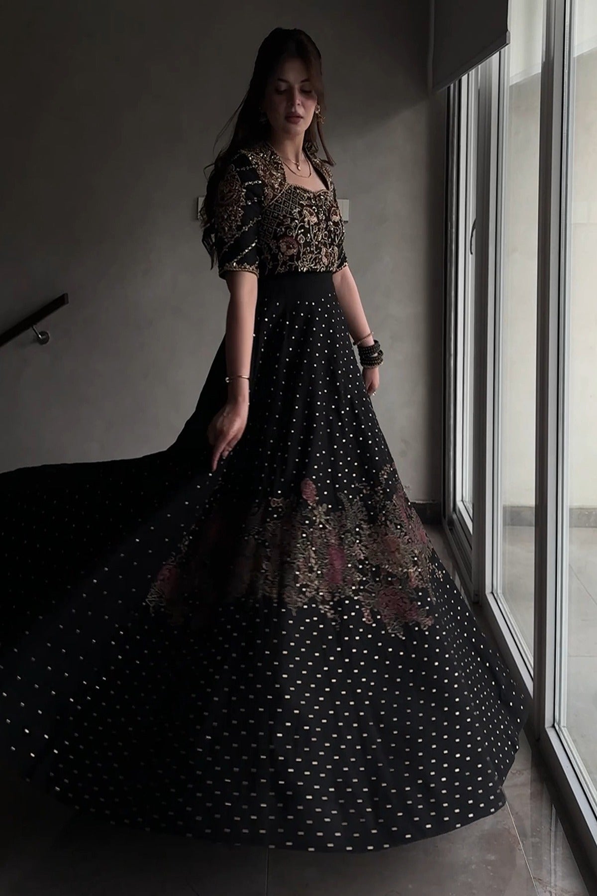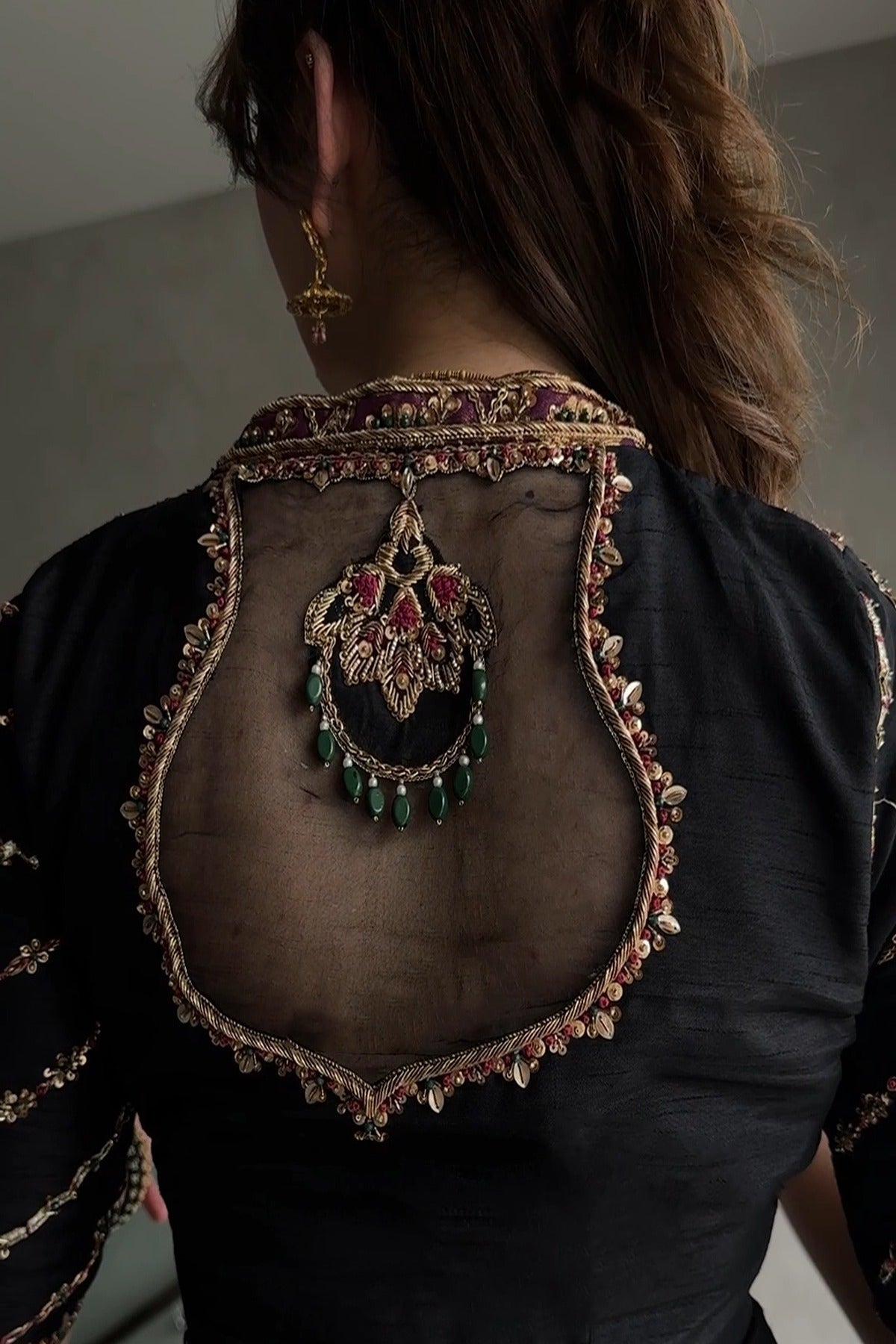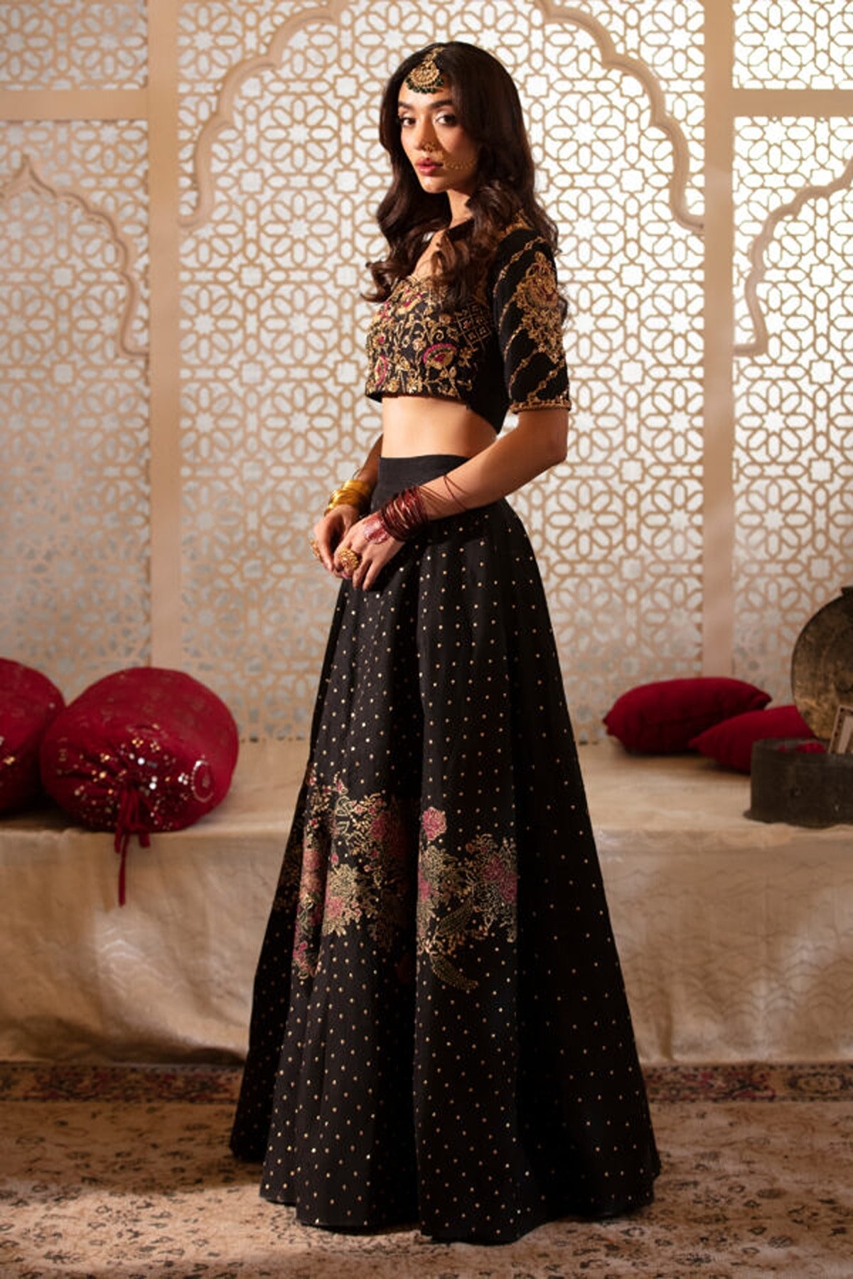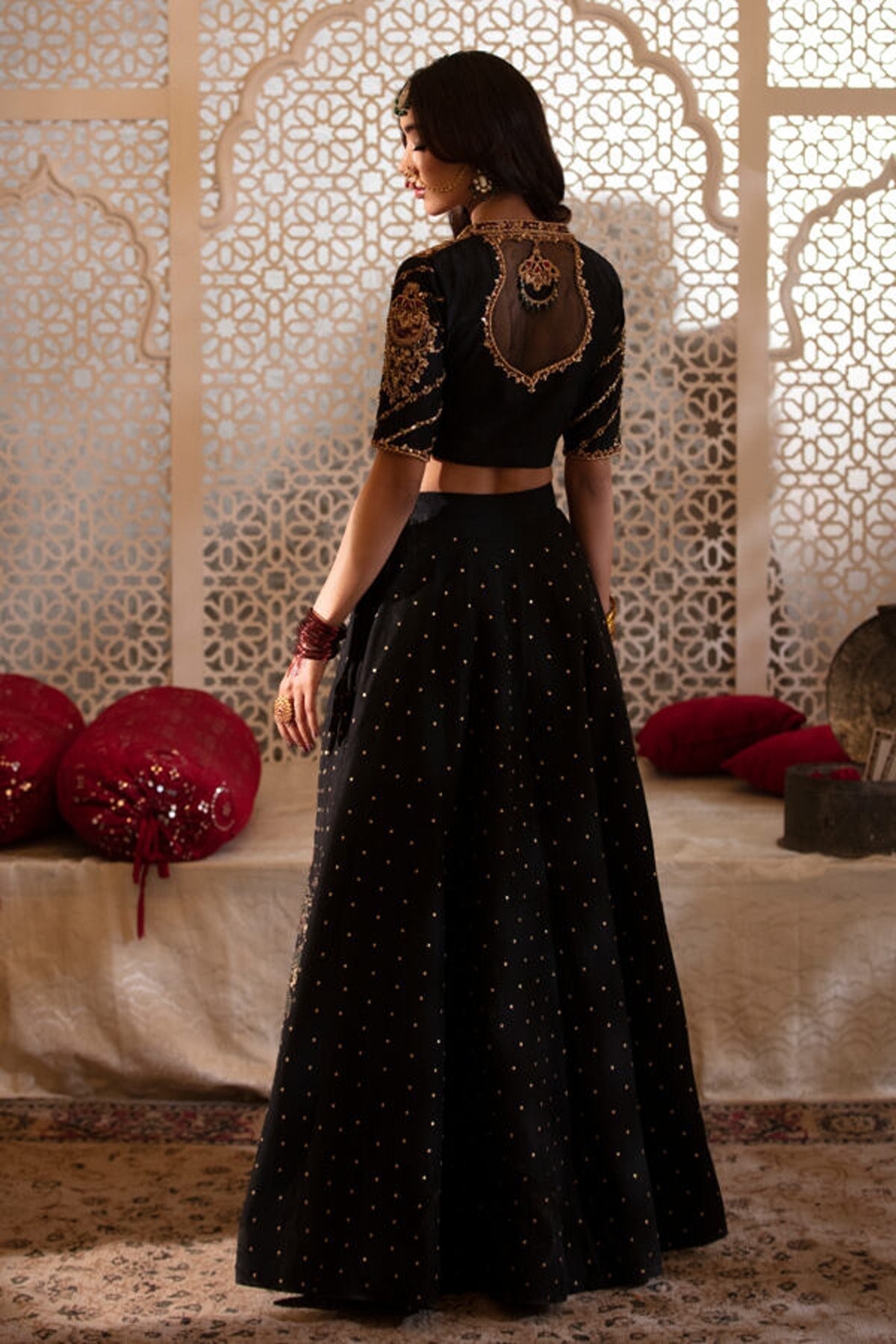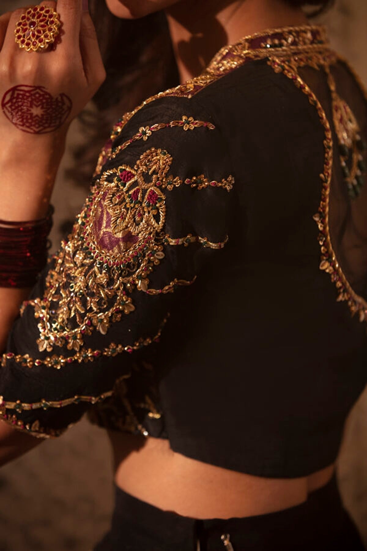 A sleek black lehnga choli, combining traditional adda work with modern block printing, creating a unique and captivating look
