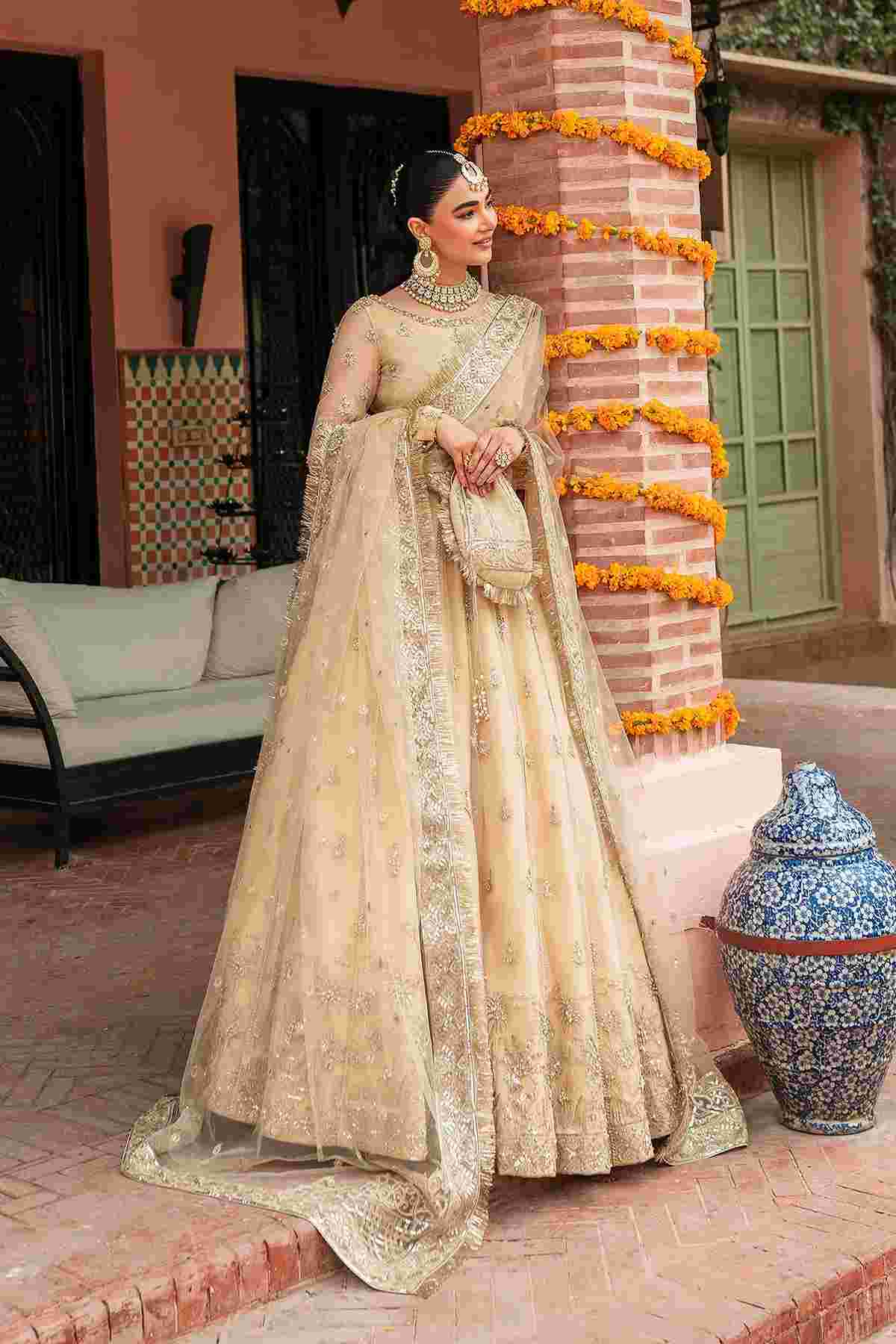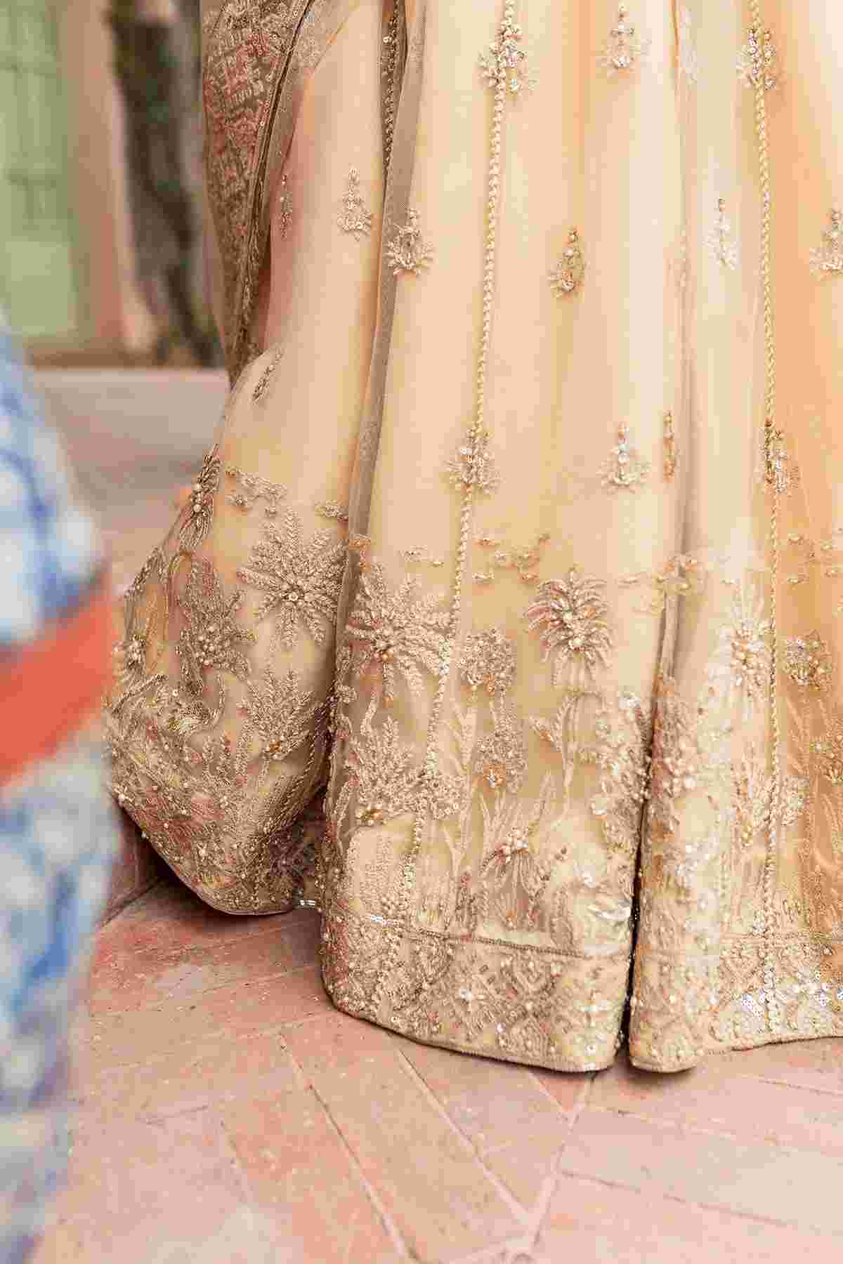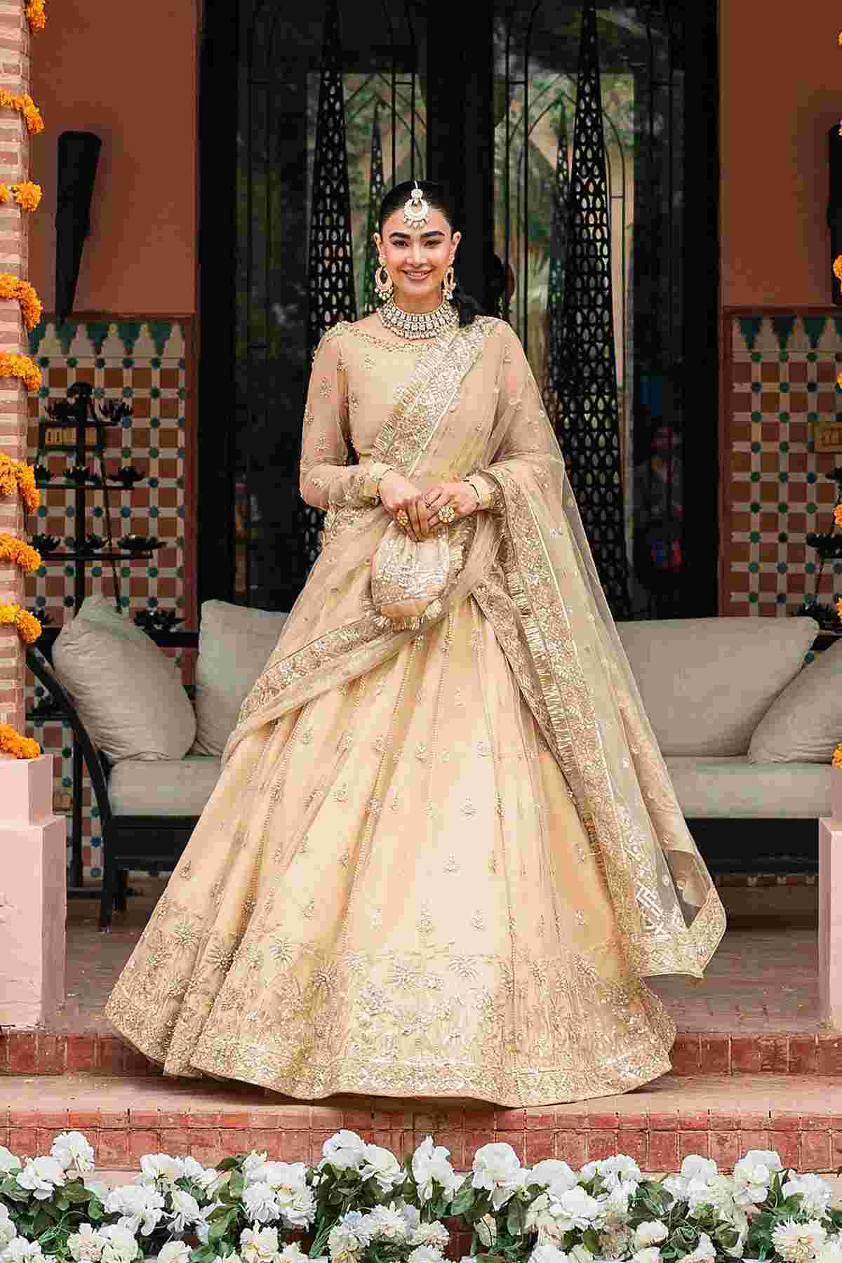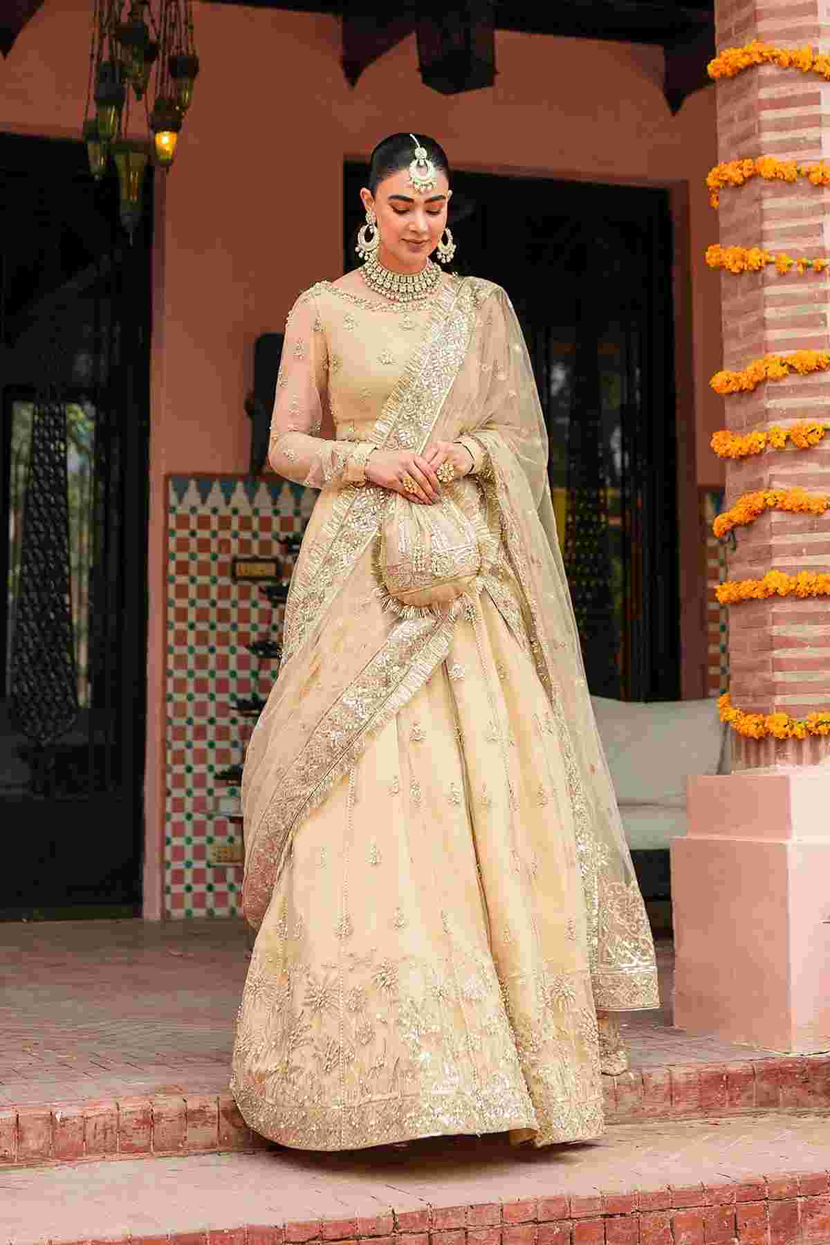 The beauty, Zarafshan is the center of this festive season. An ivory hue fit for royalty with a magical floral booti spray on the choli and sleeves enhanced with dubka and naqshi handwork. The 12 net panels have the continuing spray with a tribal floral border detailed with pearl, cutdana and crystal embellishments. The soft bareeze net dupatta has a four side tilla and resham embroidered border with micro sequin detailing that perfectly compliments this strikingly regal ensemble.