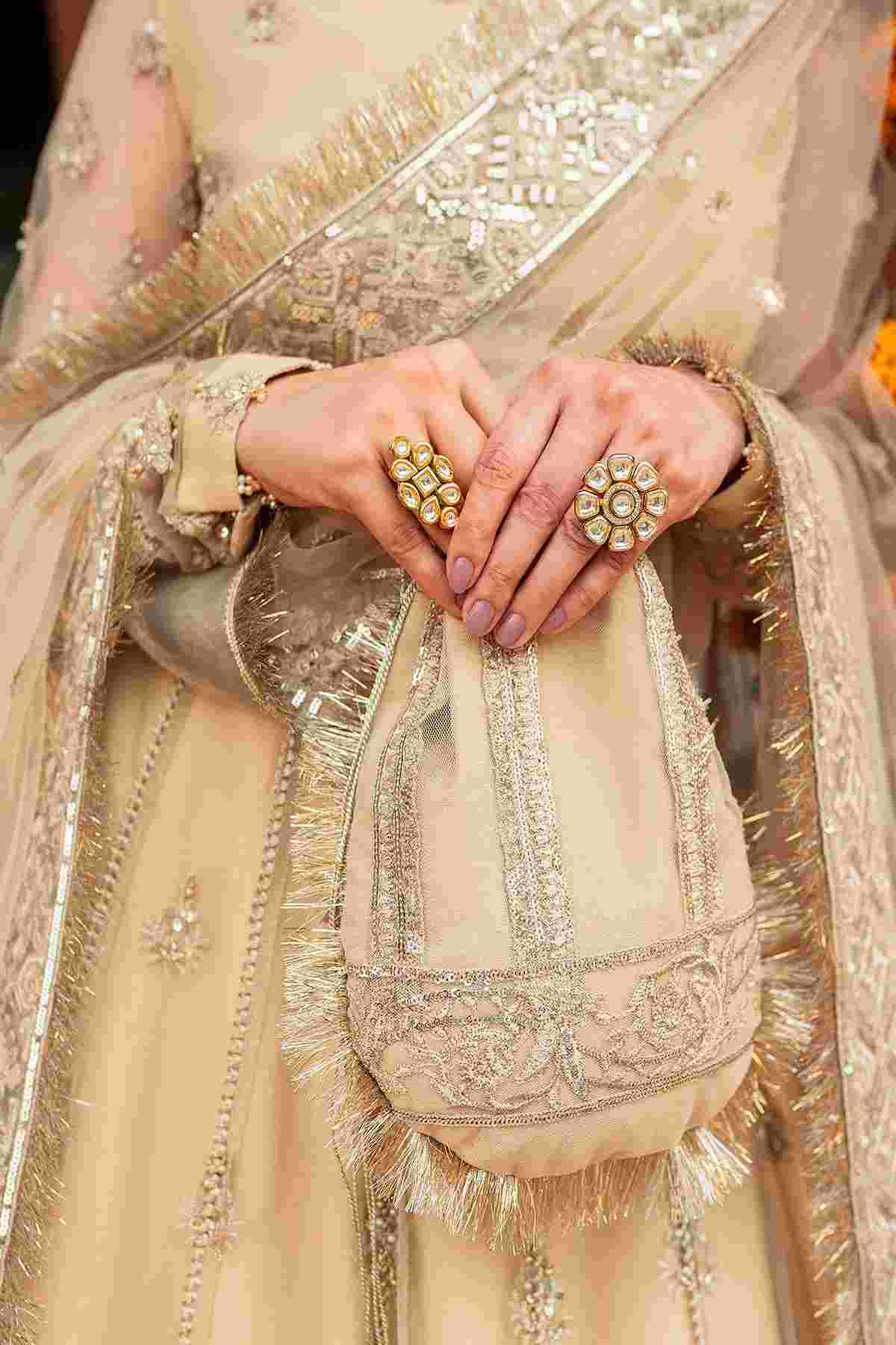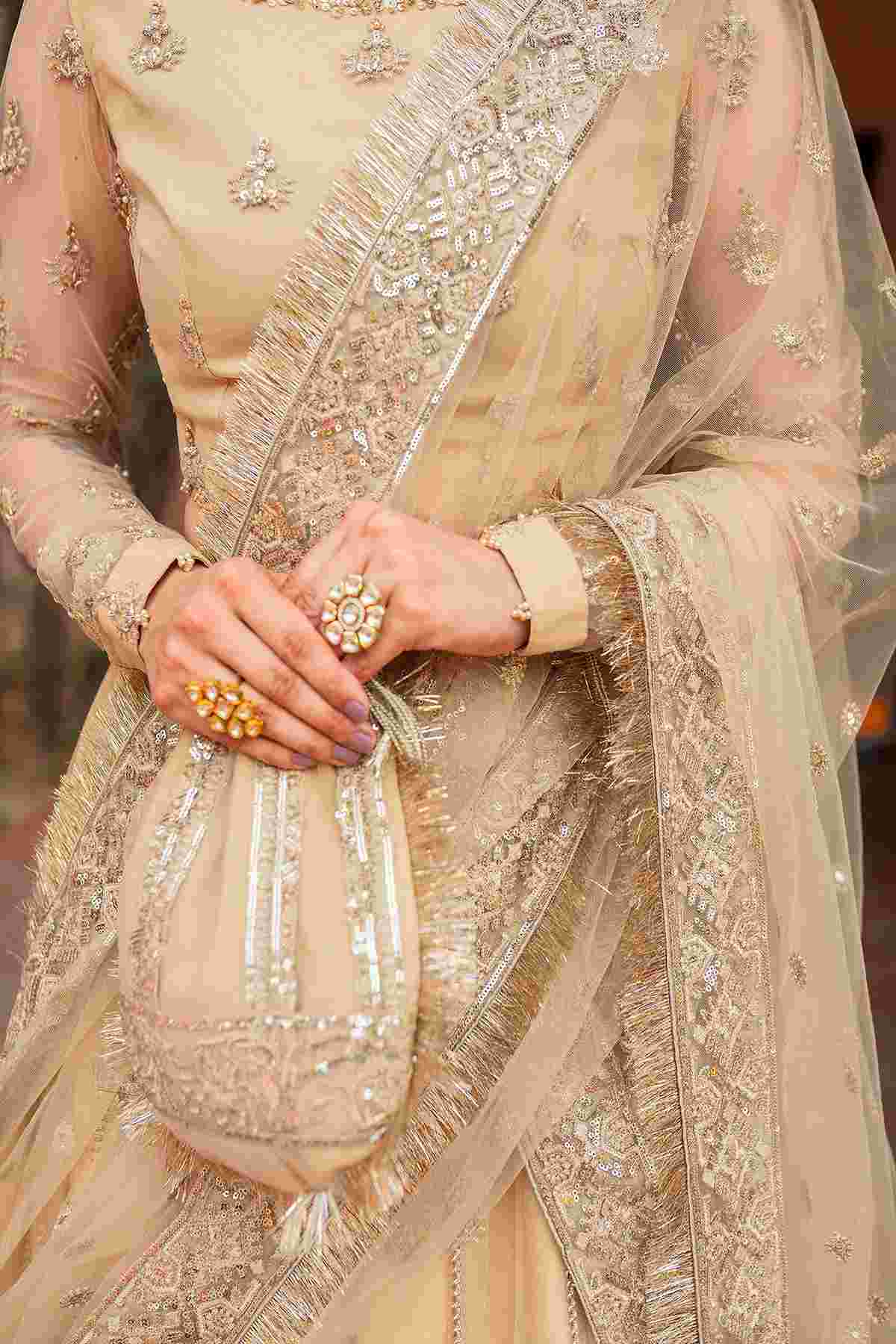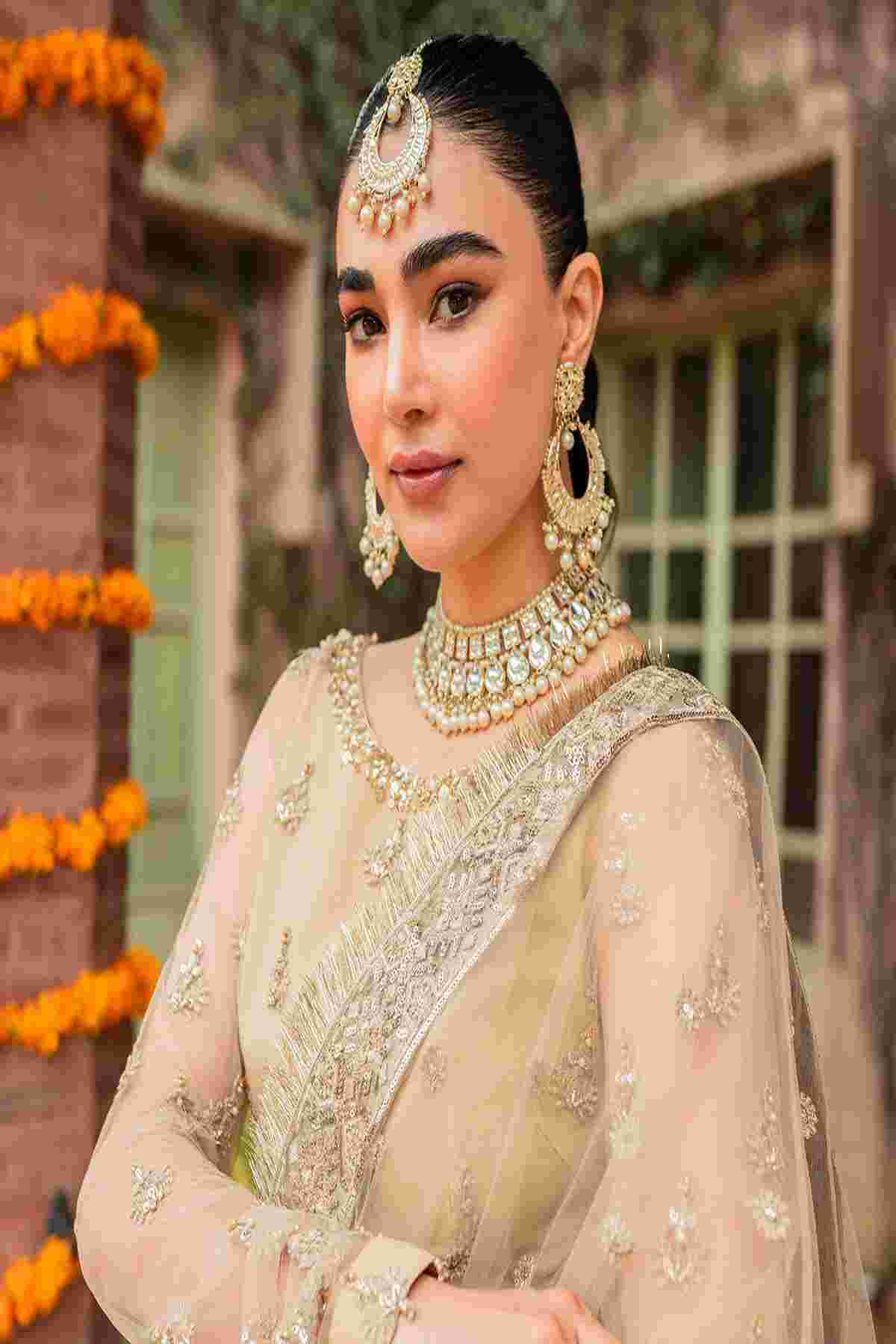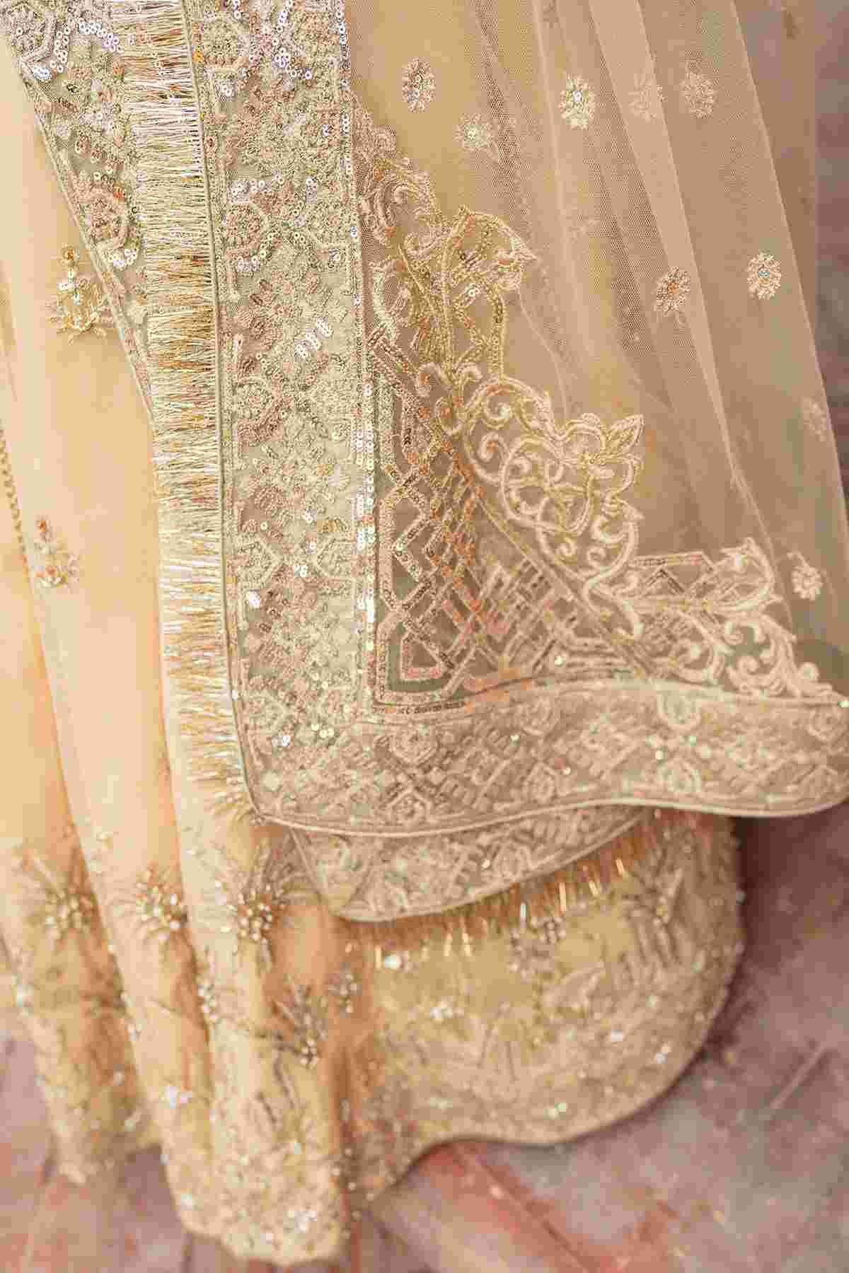 The beauty, Zarafshan is the center of this festive season. An ivory hue fit for royalty with a magical floral booti spray on the choli and sleeves enhanced with dubka and naqshi handwork. The 12 net panels have the continuing spray with a tribal floral border detailed with pearl, cutdana and crystal embellishments. The soft bareeze net dupatta has a four side tilla and resham embroidered border with micro sequin detailing that perfectly compliments this strikingly regal ensemble.