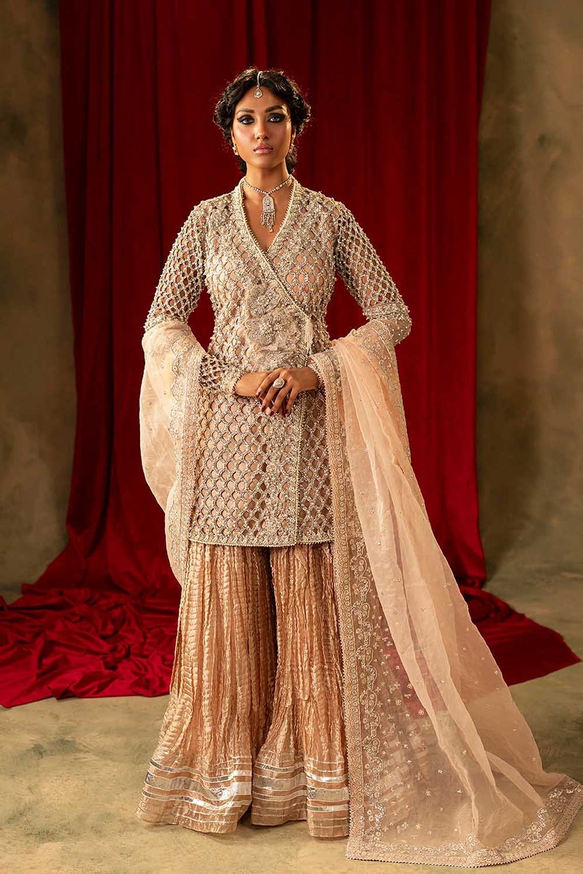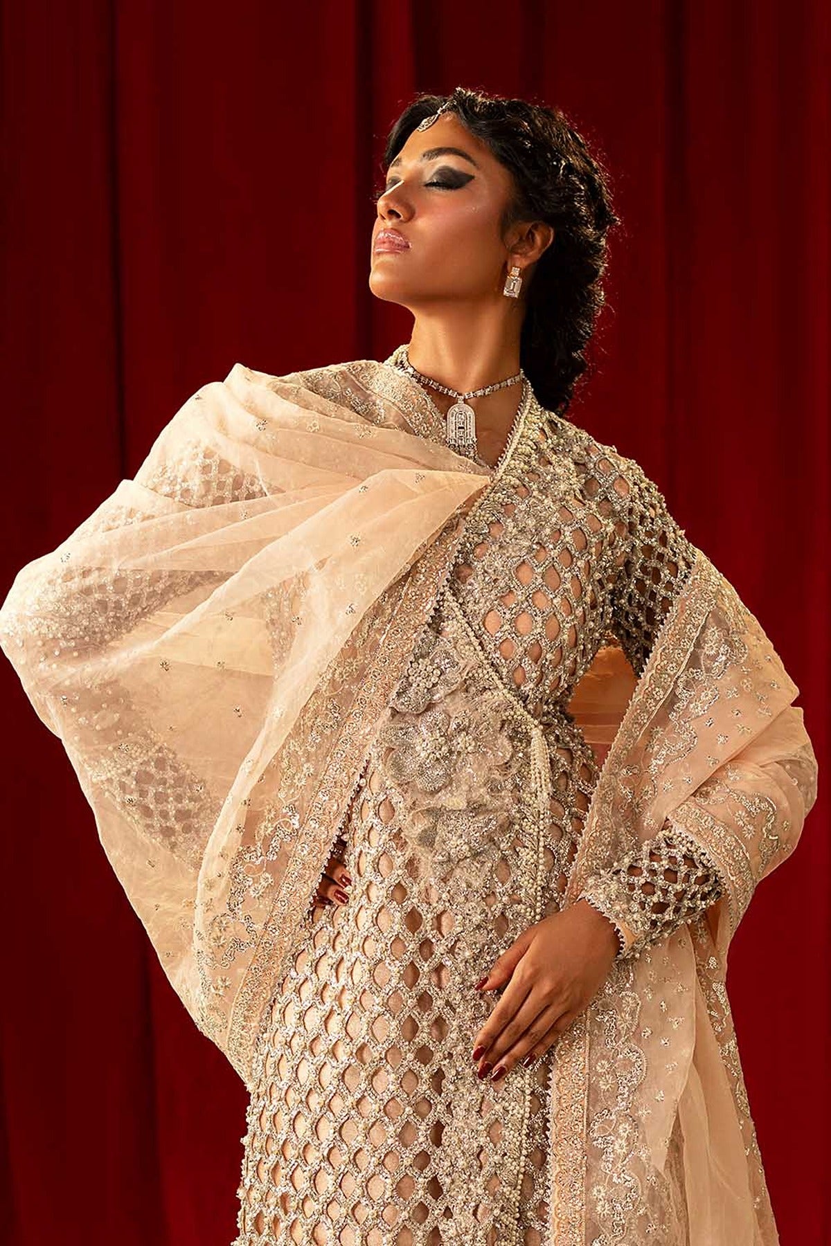 Experience the legendary glamour of 'Kohinoor,' a regal ensemble that pairs a stylized Short Angrakha crafted from luminous Organza with an exquisitely draped Crushed Sharara made from shimmering Tissue fabric. The Angrakha is completely enveloped in a gorgeous Jaal effect (all-over lattice) of fine embroidery, featuring a dazzling array of hand work, dimensional Naqshi, sharp-edged Cutdana, iridescent Pearls, brilliant Crystals, and sparkling Sequins. This combination of structural artistry and intense shimmer, rich with multi-textured embellishments, creates a dramatic, voluminous silhouette, making 'Kohinoor' a truly unforgettable choice for any grand occasion.