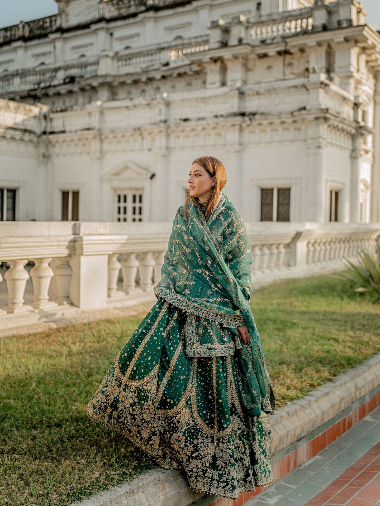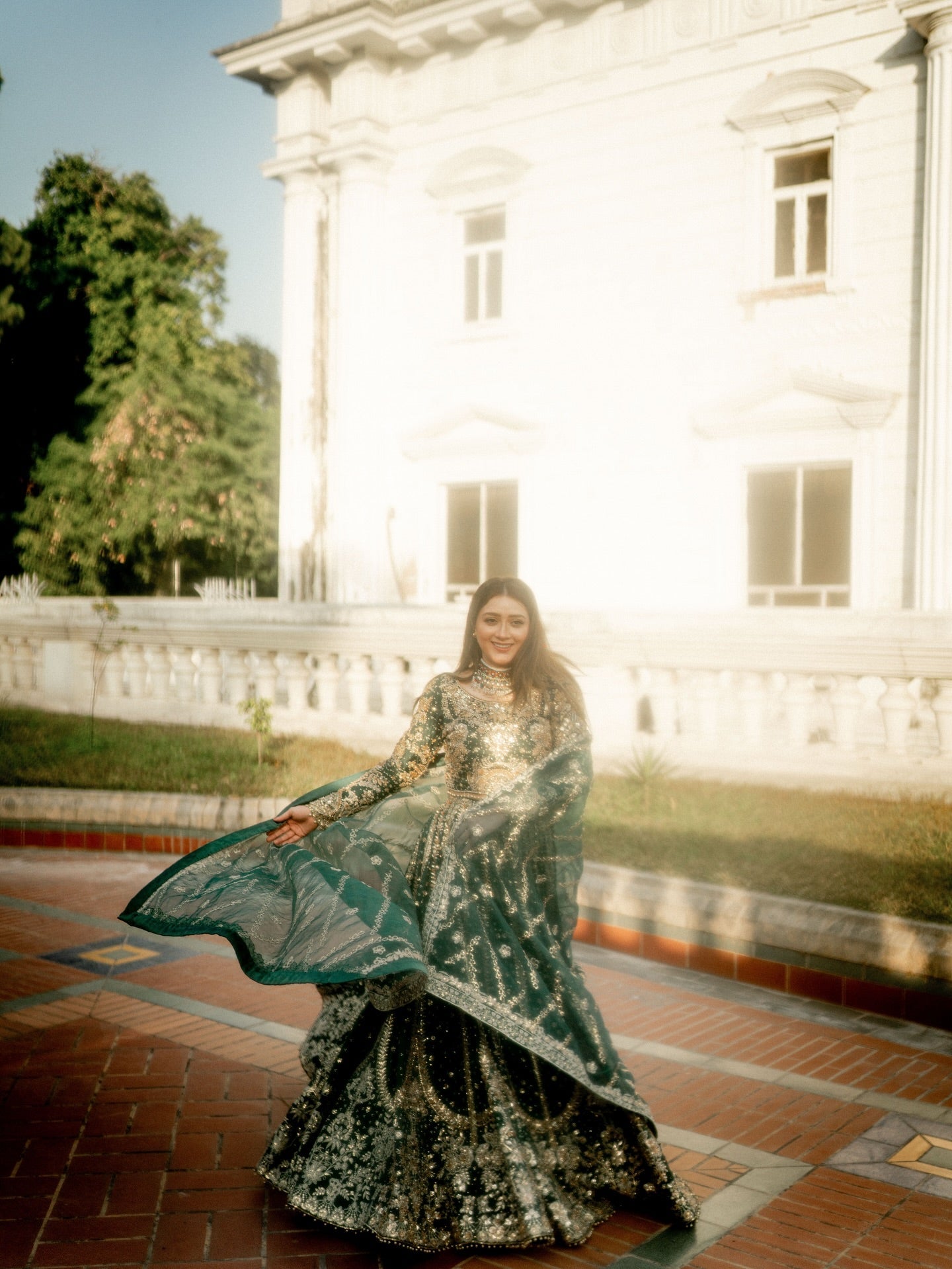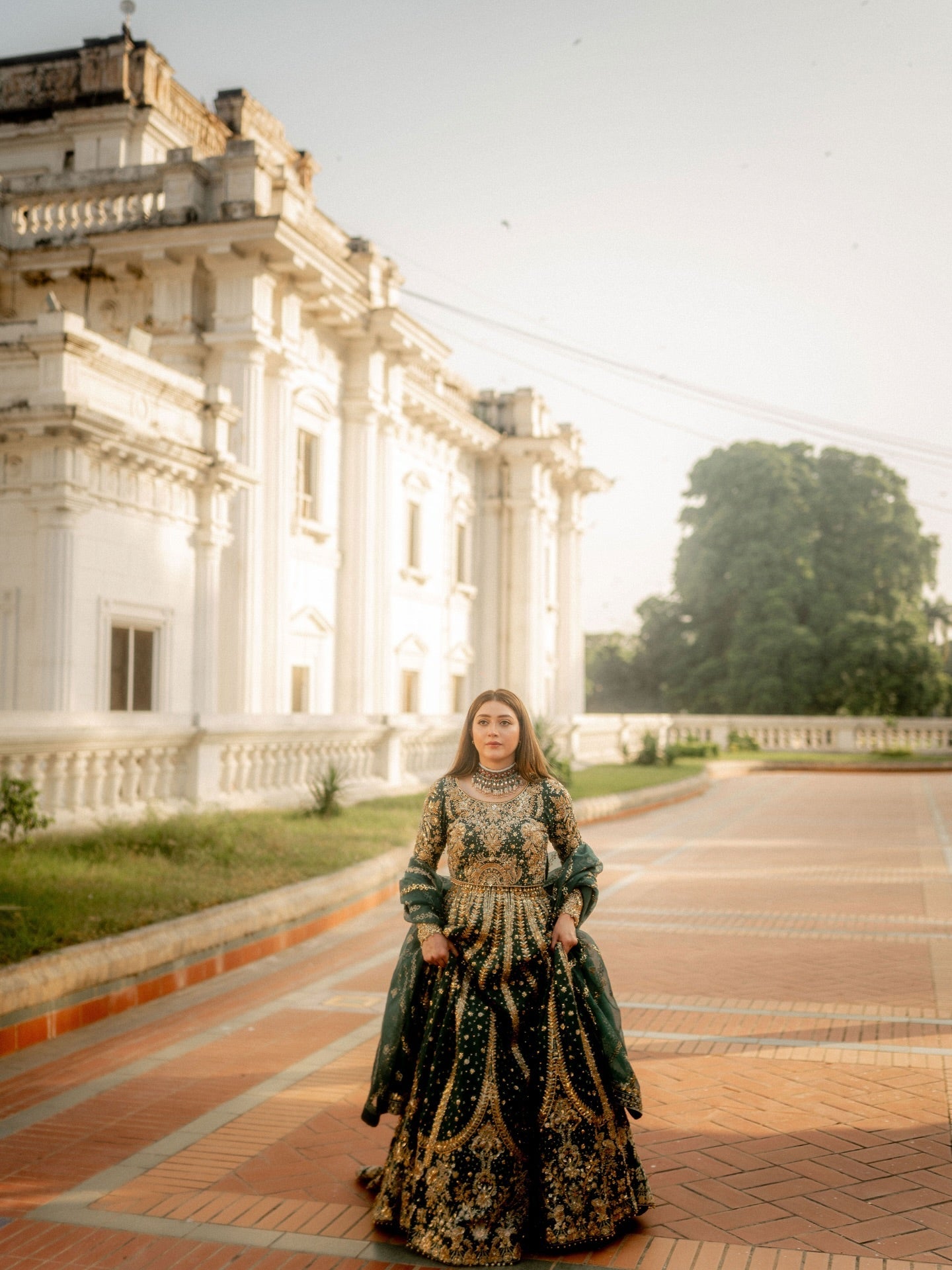 Step into the spotlight with the 'Resham' Lehenga Choli, a spectacular heirloom-quality ensemble in bottle green that blends rich tradition with ethereal glamour. Crafted from luxurious Tissue Korean Raw Silk, a fabric renowned for its distinct sheen, supple structure, and delicate drape, the garment is a magnificent canvas for intricate hand-adda embroidery. Every inch is adorned with a royal tapestry featuring the three-dimensional, coiled gold wire of Dabka, the delicate raised threadwork of Naqshi, and the sparkling brilliance of scattered Crystals and Sequins. Finished with meticulously placed metallic Gota Petals, the 'Resham' ensemble radiates unmatched grandeur and is the quintessential choice for anyone seeking a breathtaking statement piece.