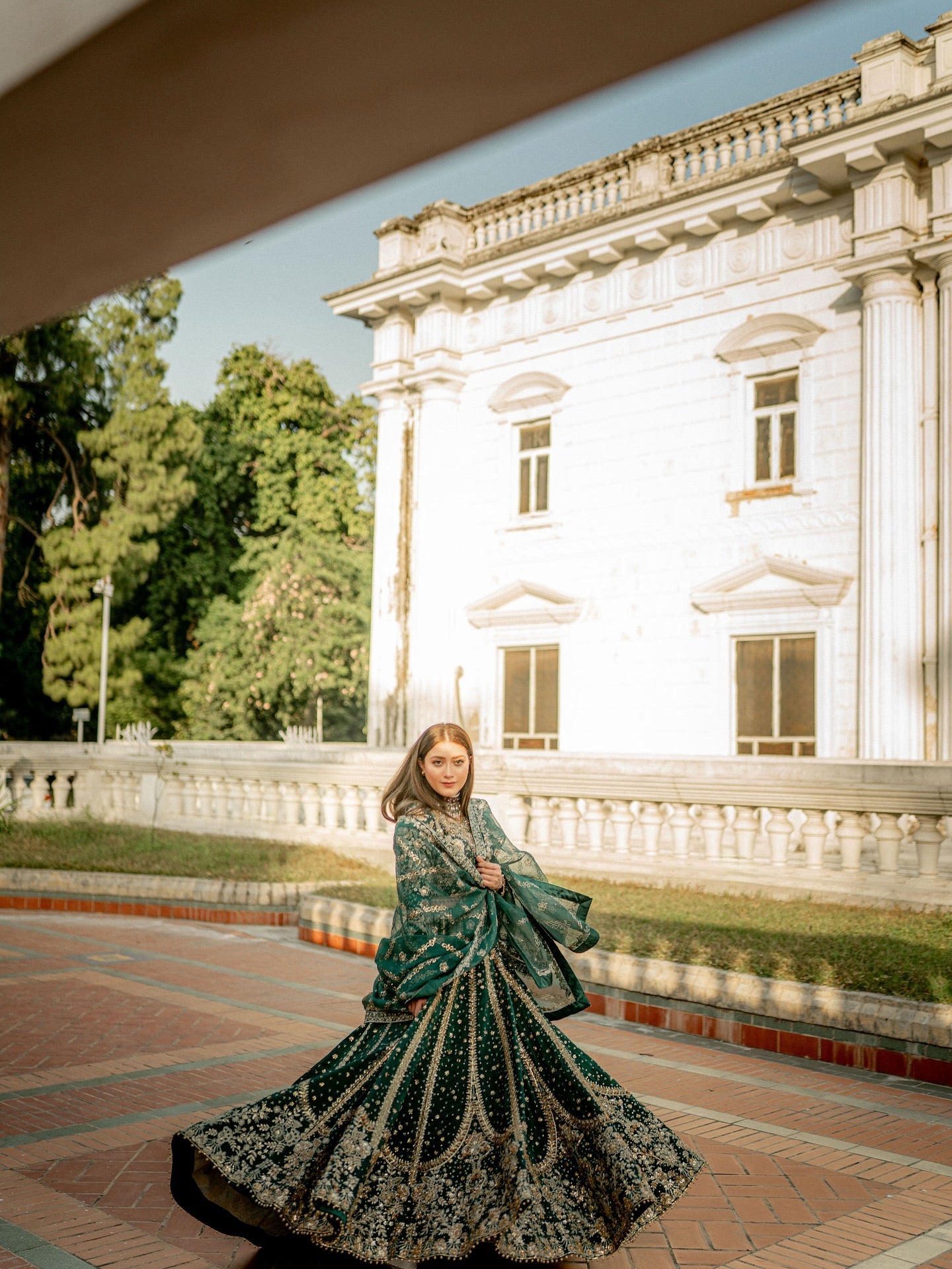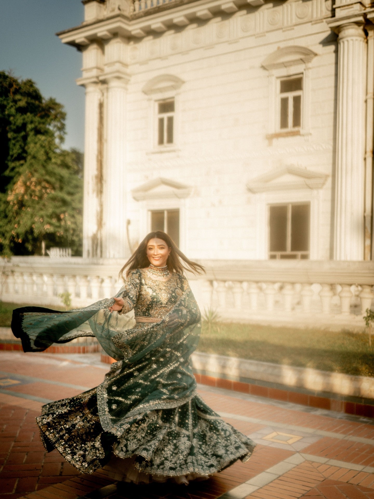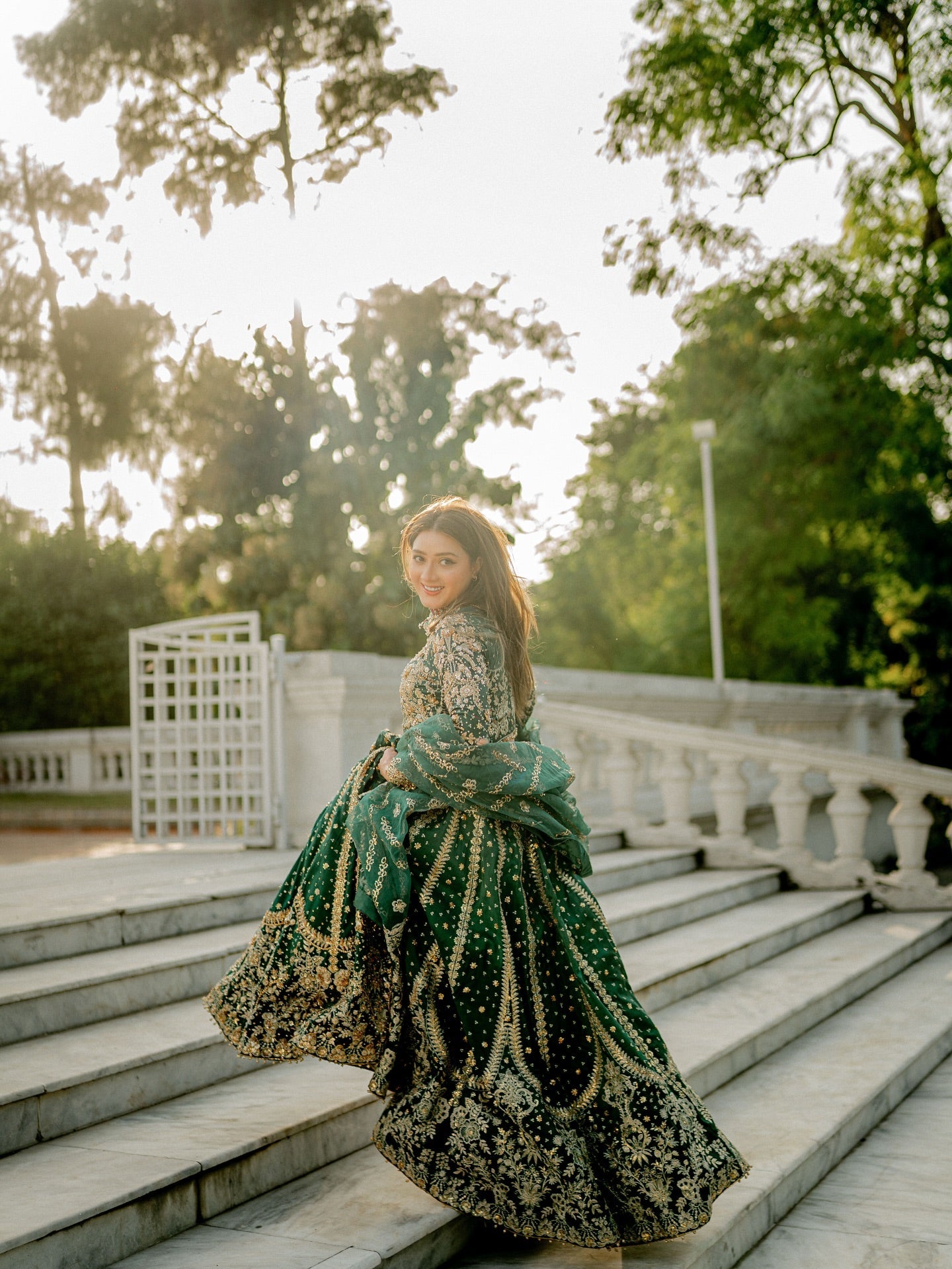 Step into the spotlight with the 'Resham' Lehenga Choli, a spectacular heirloom-quality ensemble in bottle green that blends rich tradition with ethereal glamour. Crafted from luxurious Tissue Korean Raw Silk, a fabric renowned for its distinct sheen, supple structure, and delicate drape, the garment is a magnificent canvas for intricate hand-adda embroidery. Every inch is adorned with a royal tapestry featuring the three-dimensional, coiled gold wire of Dabka, the delicate raised threadwork of Naqshi, and the sparkling brilliance of scattered Crystals and Sequins. Finished with meticulously placed metallic Gota Petals, the 'Resham' ensemble radiates unmatched grandeur and is the quintessential choice for anyone seeking a breathtaking statement piece.