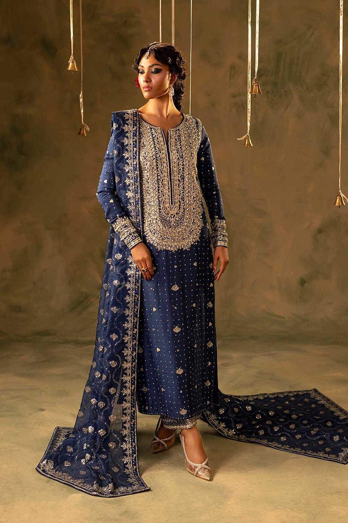 Elevate your festive wardrobe with Sitara, a stunning ensemble that exudes timeless elegance. This long blue shirt features an intricately adorned neckline, showcasing exquisite craftsmanship with Naqshi, Dabka, Crystals, Mukesh, and shimmering Sequins. Paired with matching Culottes and a beautifully embellished dupatta, Sitara blends tradition with modern grace—perfect for making a radiant impression at any celebration.
